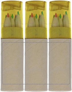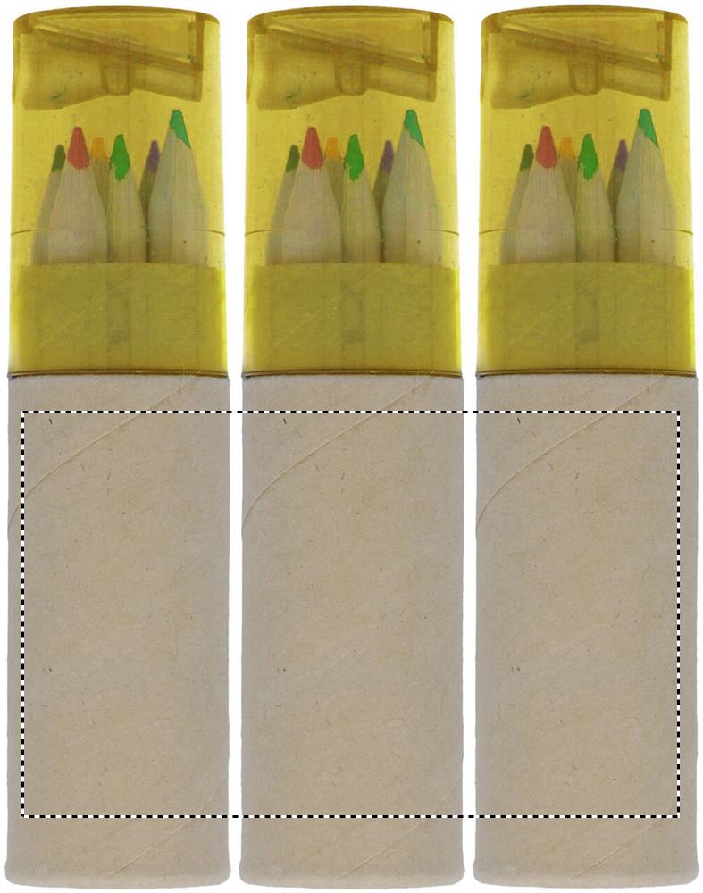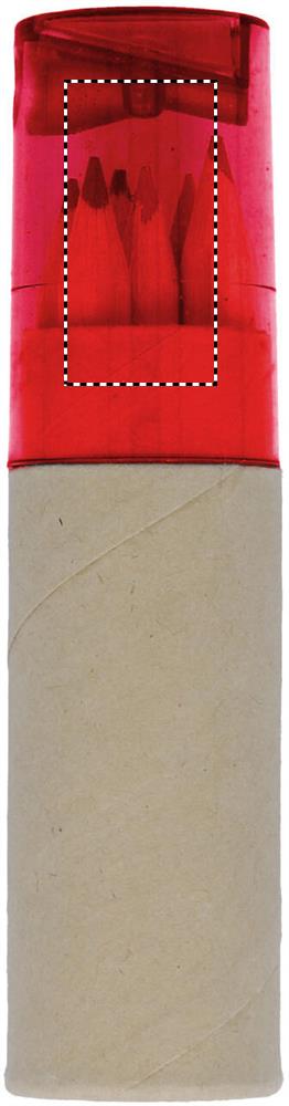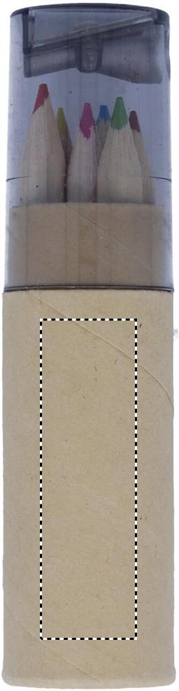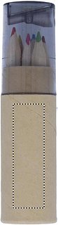 6 Buntstifte in einer runden Schachtel. Transparenter Deckel mit Bleistiftspitzer.