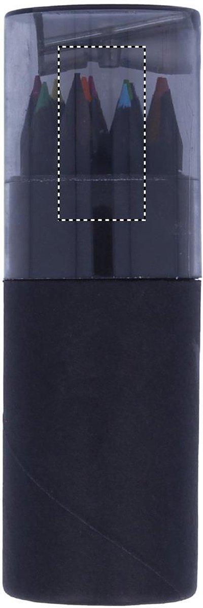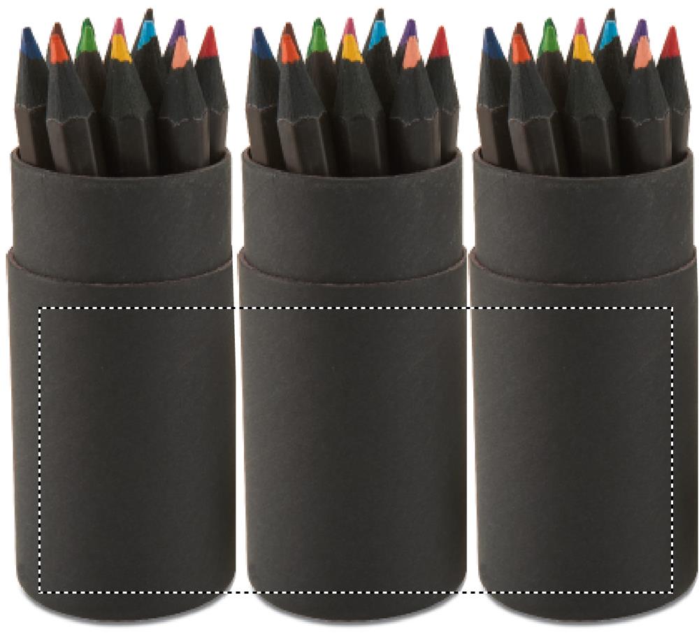 12 Buntstifte in einer schwarzen, runden Kartonbox. Anspitzer im Deckel der Box integriert.
