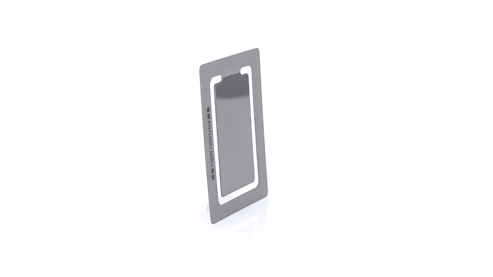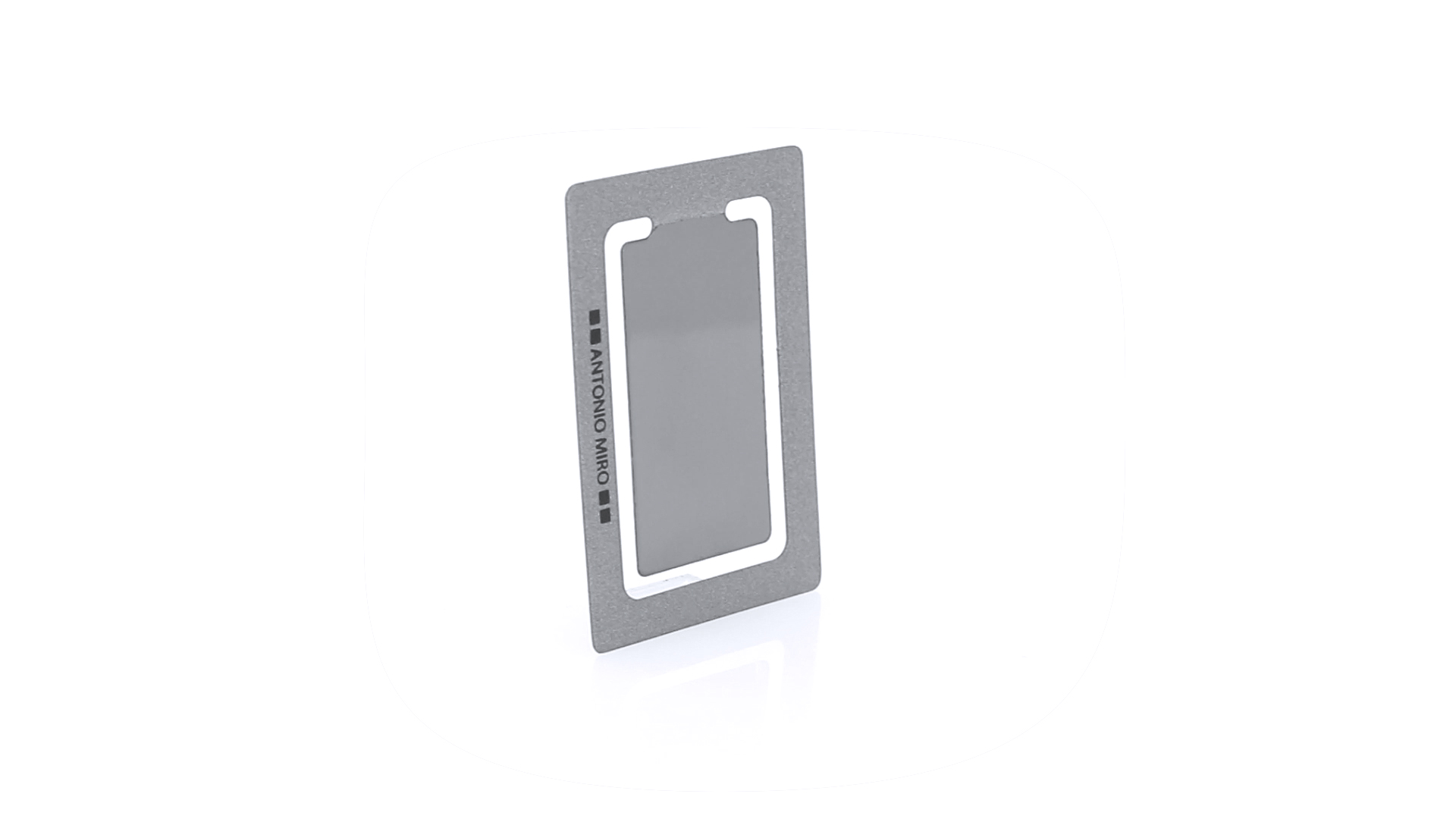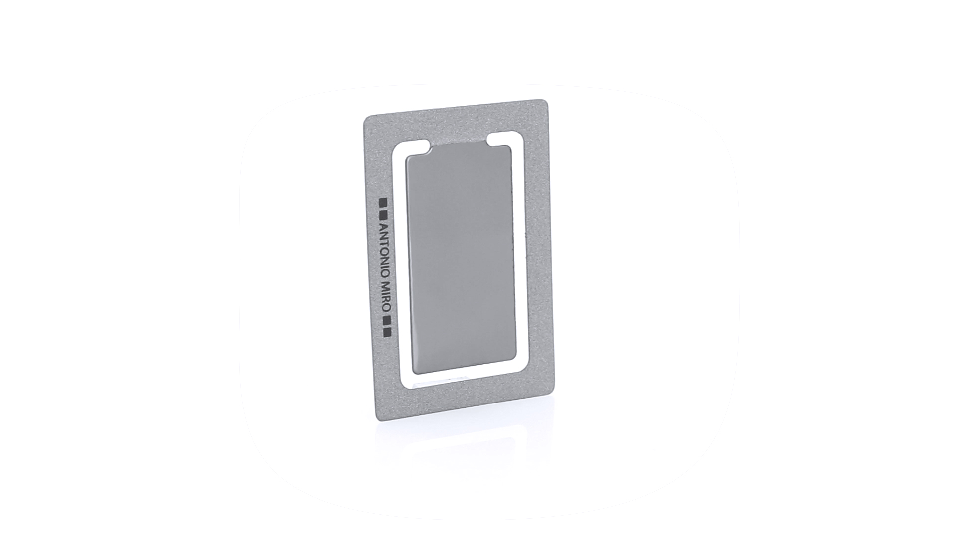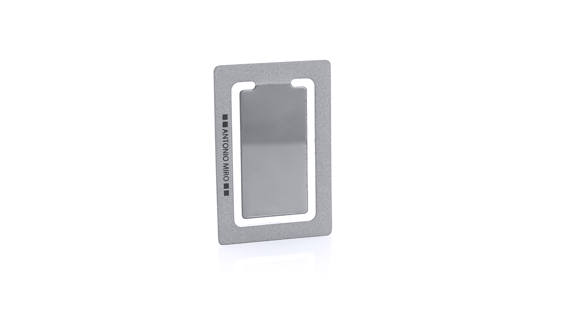 Eleganter Lesezeichenclip aus Metall von Antonio Miró. In Dunkelgrau mit dem Markenlogo. Präsentiert in einer individuellen Schachtel.