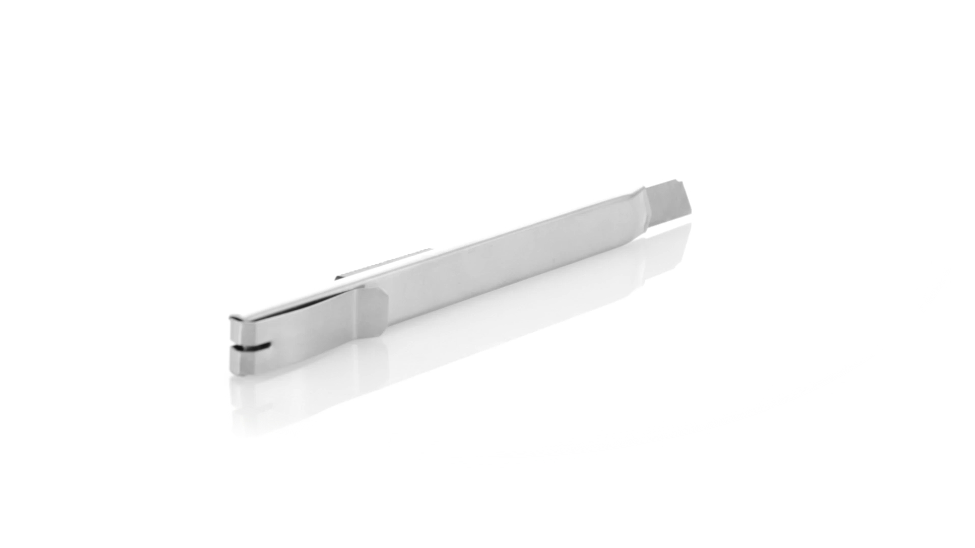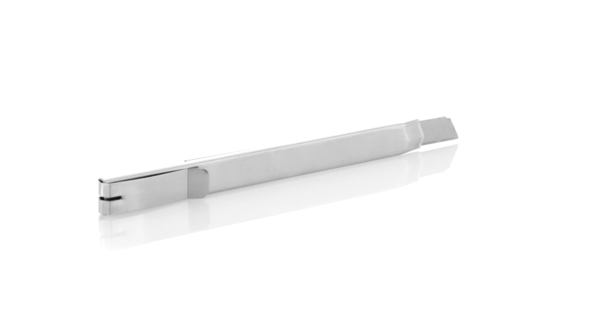 Edelstahl-Teppichmesser mit schmaler Klinge und Befestigungsclip. Mit abnehmbarem Deckel für die Einstellung der Klinge.