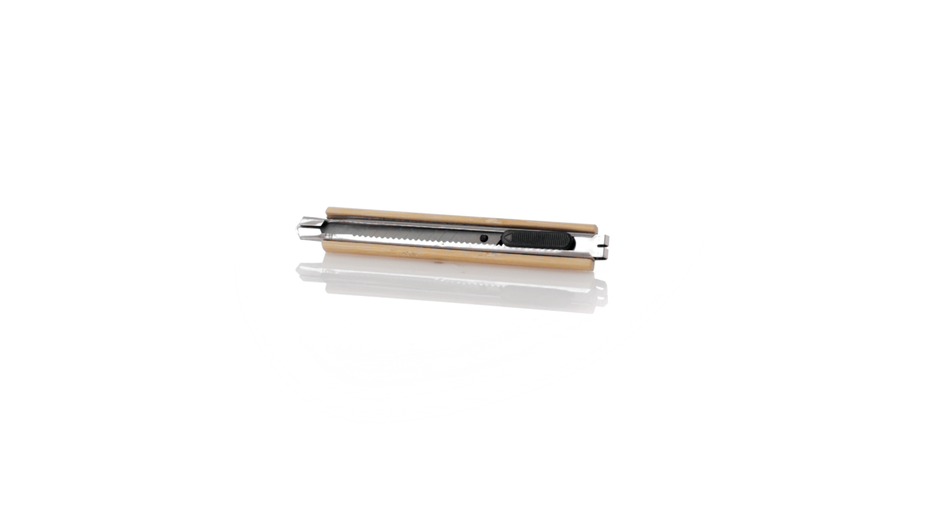 Metallschneider mit Bambusgehäuse. Mit ergonomisch geformtem Griff und abnehmbarem Clip mit Schlitz für Schneidklingen. Einzeln verpackt in einer recycelten Papiertüte.