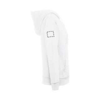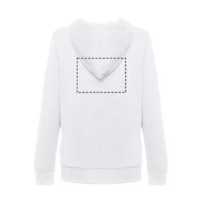 Damen Sweatshirt aus 50% Baumwolle und 50% Polyester (320 g/m²) mit kardierter Innenseite. Die Kapuze ist gefüttert und hat eine farblich abgestimmte Kordel. Auf der Vorderseite befinden sich 2 Beuteltaschen mit verdecktem Plastikreissverschluss. Ripp an Bund und Ärmeln. Grössen: S, M, L, XL, XXL