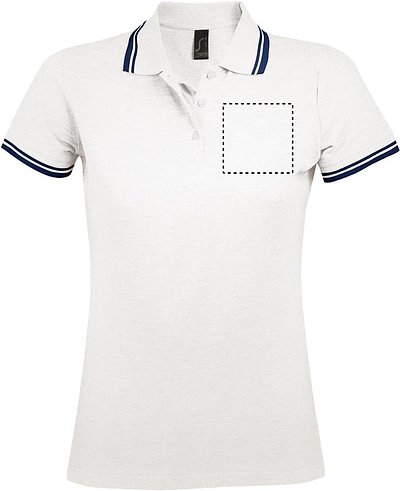 SOL'S PASADENA Damen Polo 200g. Kragen aus Feinripp 1x1. Kontrastierendes Nackenband. Kontrastierend gestreift an Kragen und Armbündchen. Knopfleiste mit 3 farblich abgestimmten Knöpfen. Seitennähte. Fitted cut. Seitenschlitze. Ersatzknopf innen am Seitenlabel. Material: 100% Baumwolle Ringspun. OEKO-TEX®. Verkauf nur inklusive Werbeanbringung.
