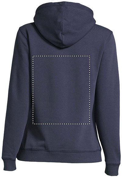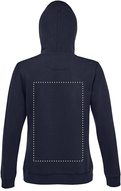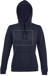 SOL'S SPENCER Damen Sweater 280g. Kängurutasche. Seitennähte. Gefütterte Kapuze mit Zugband. Feinrippeinfassung an Ärmelbündchen und Saum 2x2. Halbmondpasse auf der Krageninnenseite. Nackenband auf der Krageninnenseite. Material: 80% Baumwolle Ringspun - 20% Polyester. Innen angeraut. Aussenmaterial 100% Baumwolle. OEKO-TEX®. Verkauf nur inklusive Werbeanbringung.