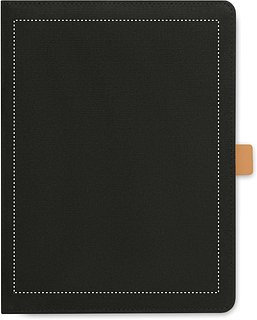 DIN A5 Mappe aus RPET mit Details aus Kunstleder. Auswechselbares A5-Notizbuch mit gebundenem Hard Cover. 64 Blatt (128 Seiten) liniertes Recyclingpapier. Stifthalter, 2 Kartenfächer und ein grosses Fach. Elastisches Verschlussband mit Dekor aus Metall.
