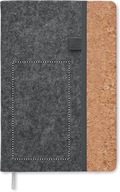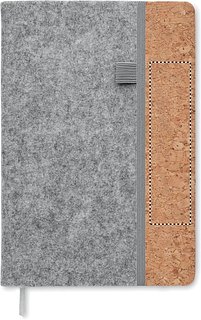 DIN A5 Notizbuch mit Cover aus RPET-Filz und Kork. 80 Blatt (160 Seiten) liniertes Recyclingpapier. Elastisches Verschlussband, Lesebändchen und Stiftschlaufe.