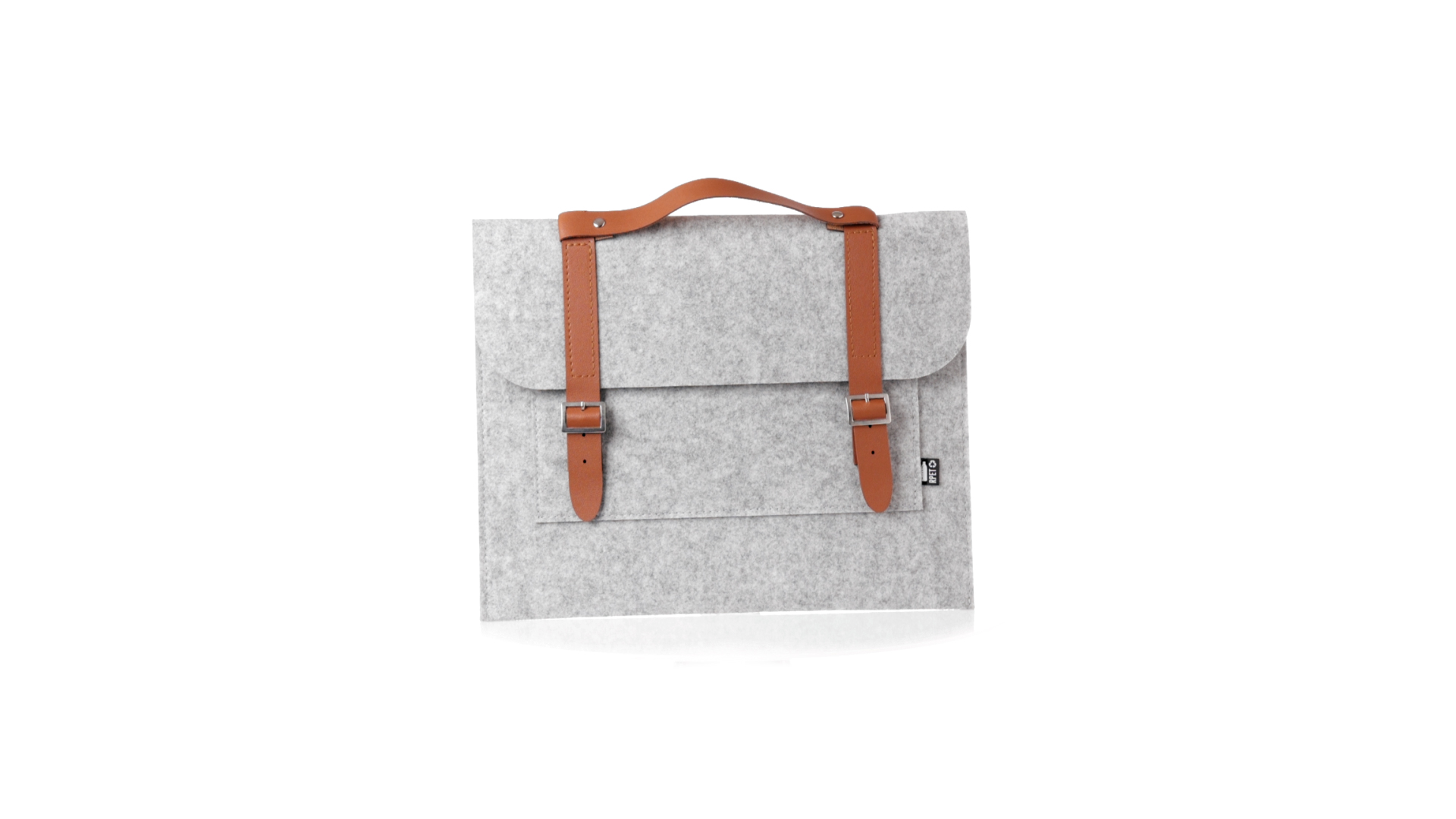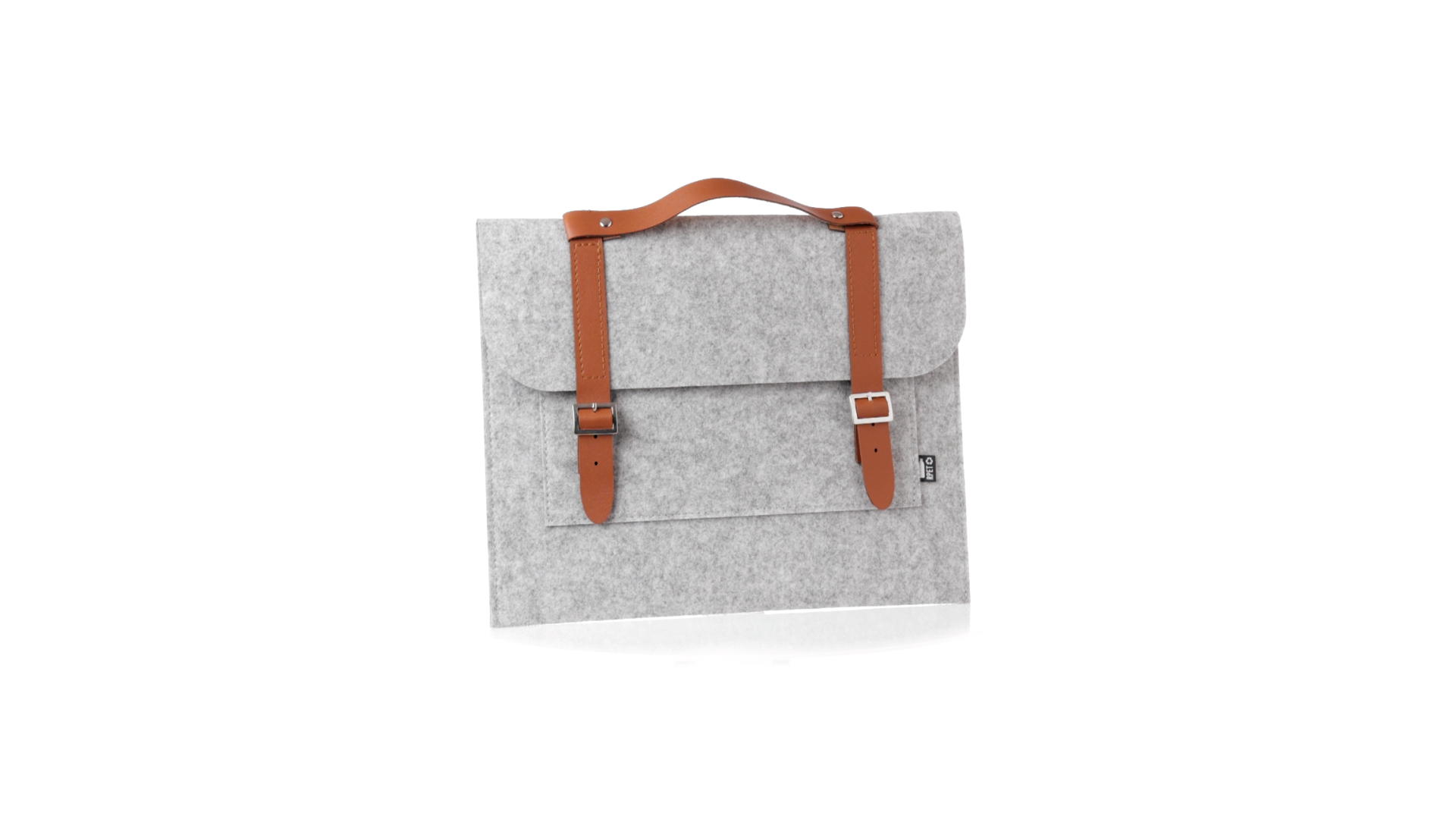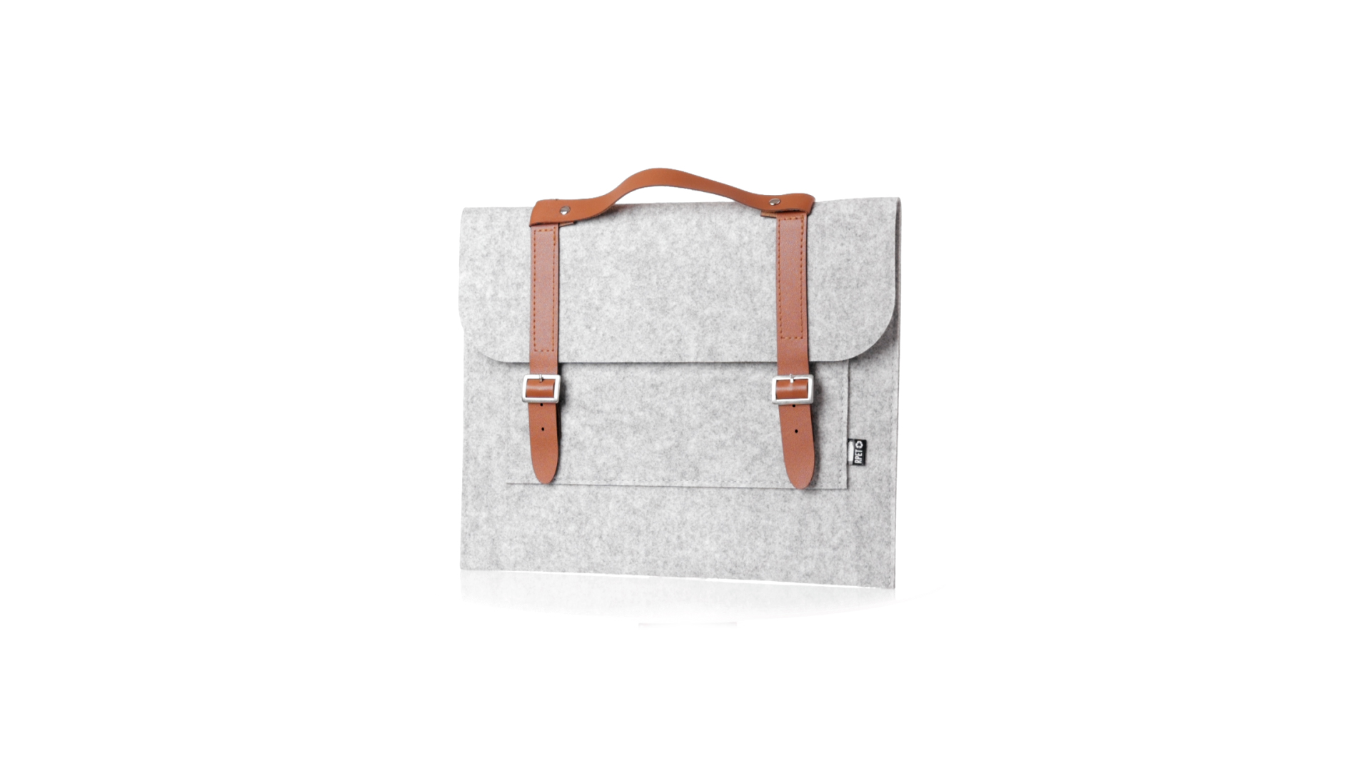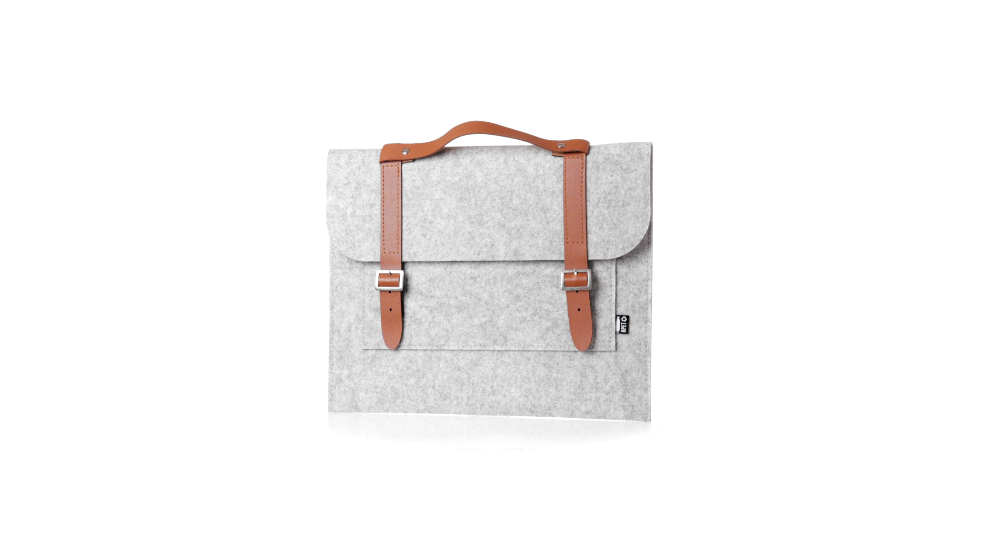 Originelle Dokumententasche der Linie "Natur" aus strapazierfähigem RPET-Filz. Hauptfach mit Klappe und Schnallenverschluss, kontrastierender Griff und Riemen aus elegantem braunem Kunstleder. Aussentasche mit RPET-Etikett.RPET-Filz ist das Ergebnis der Kombination des Recyclingprozesses von Kunststoffen mit der jahrtausendealten Technik der Filzherstellung. Das Ergebnis ist ein Öko-Trendmaterial, das nicht nur recycelt, sondern auch wiederverwertbar ist.