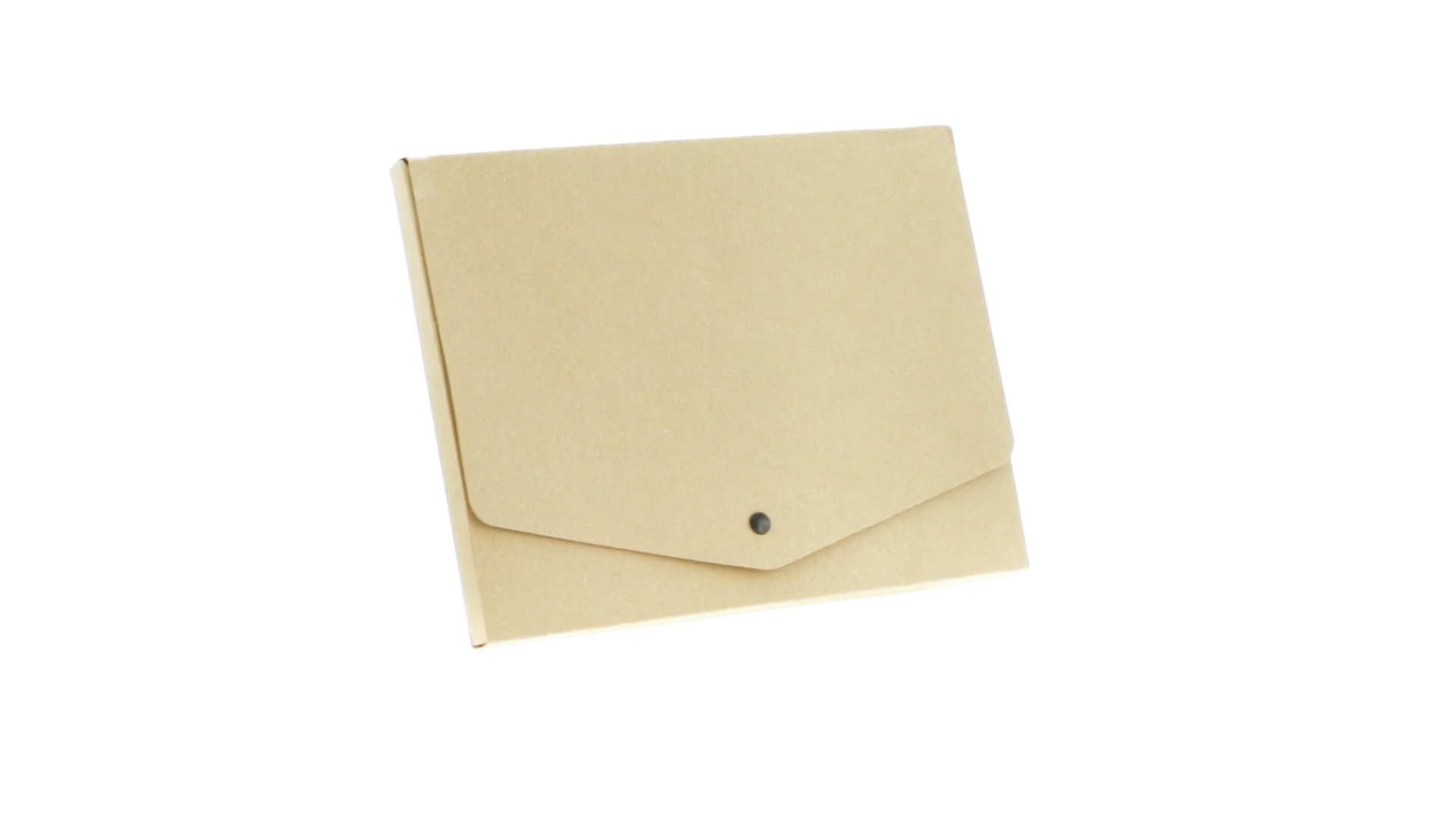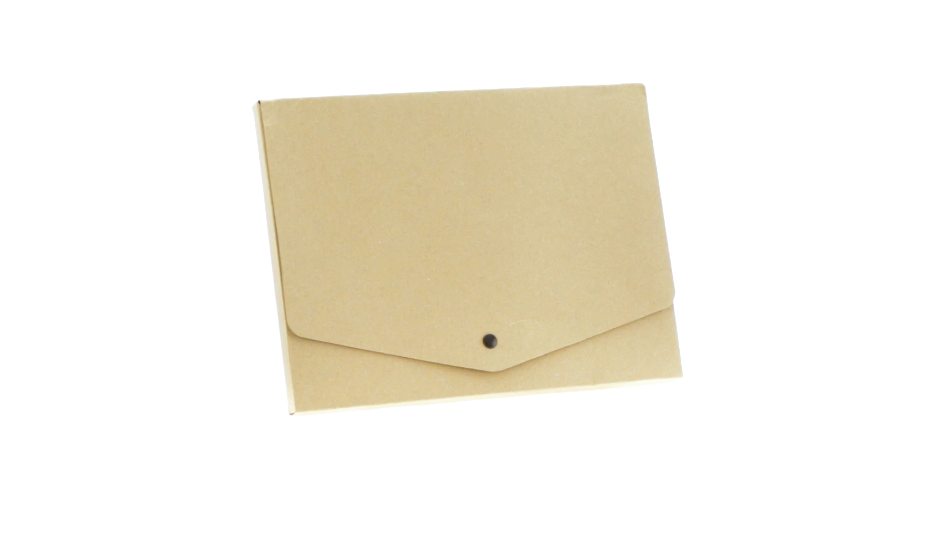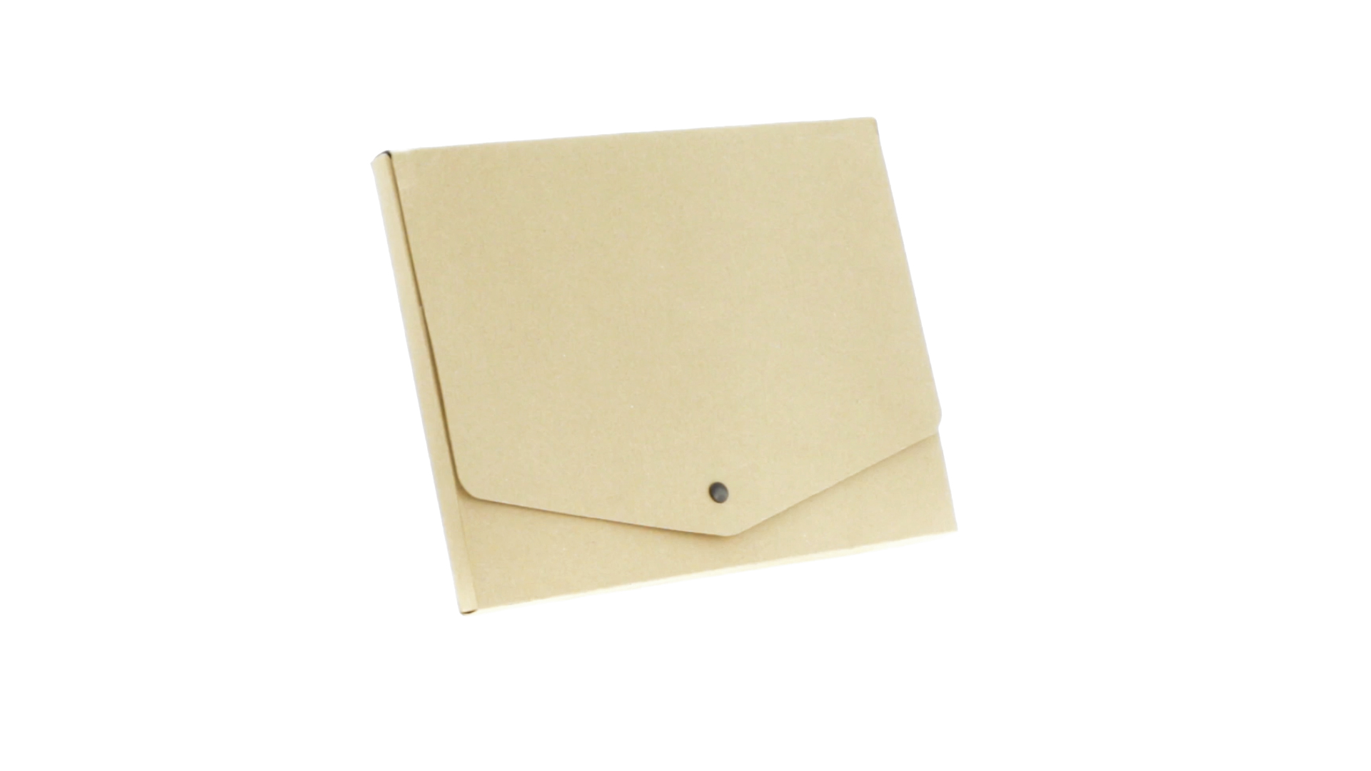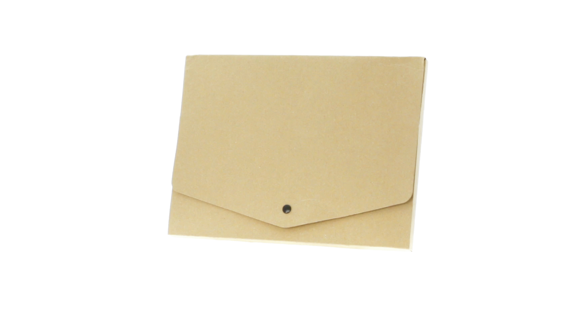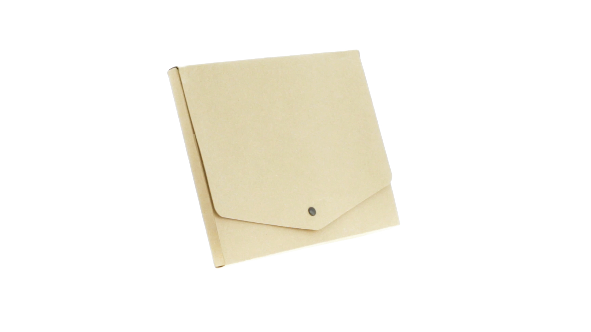 Dokumententasche aus stabilem Recyclingkarton mit Klappenverschluss mit Druckknopf.