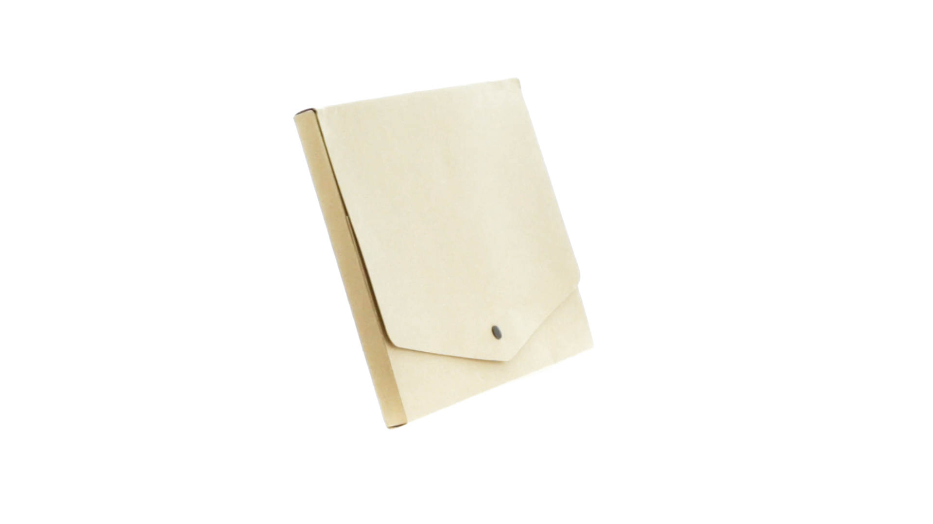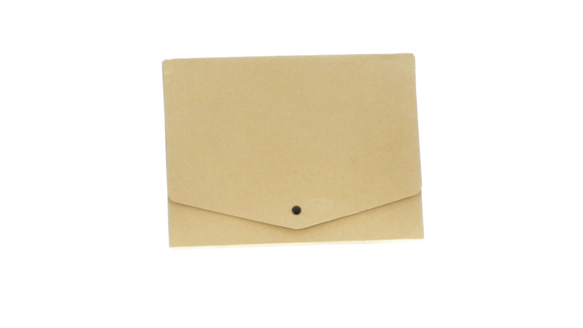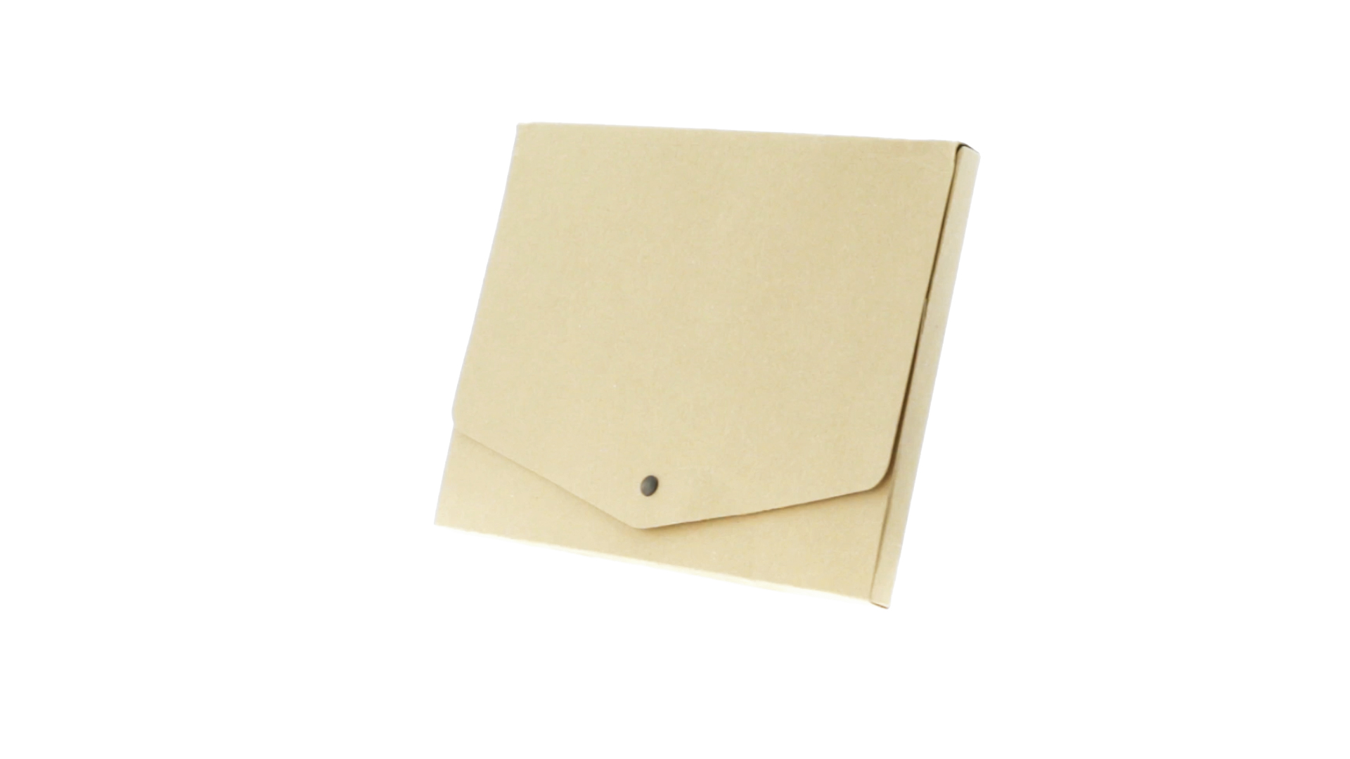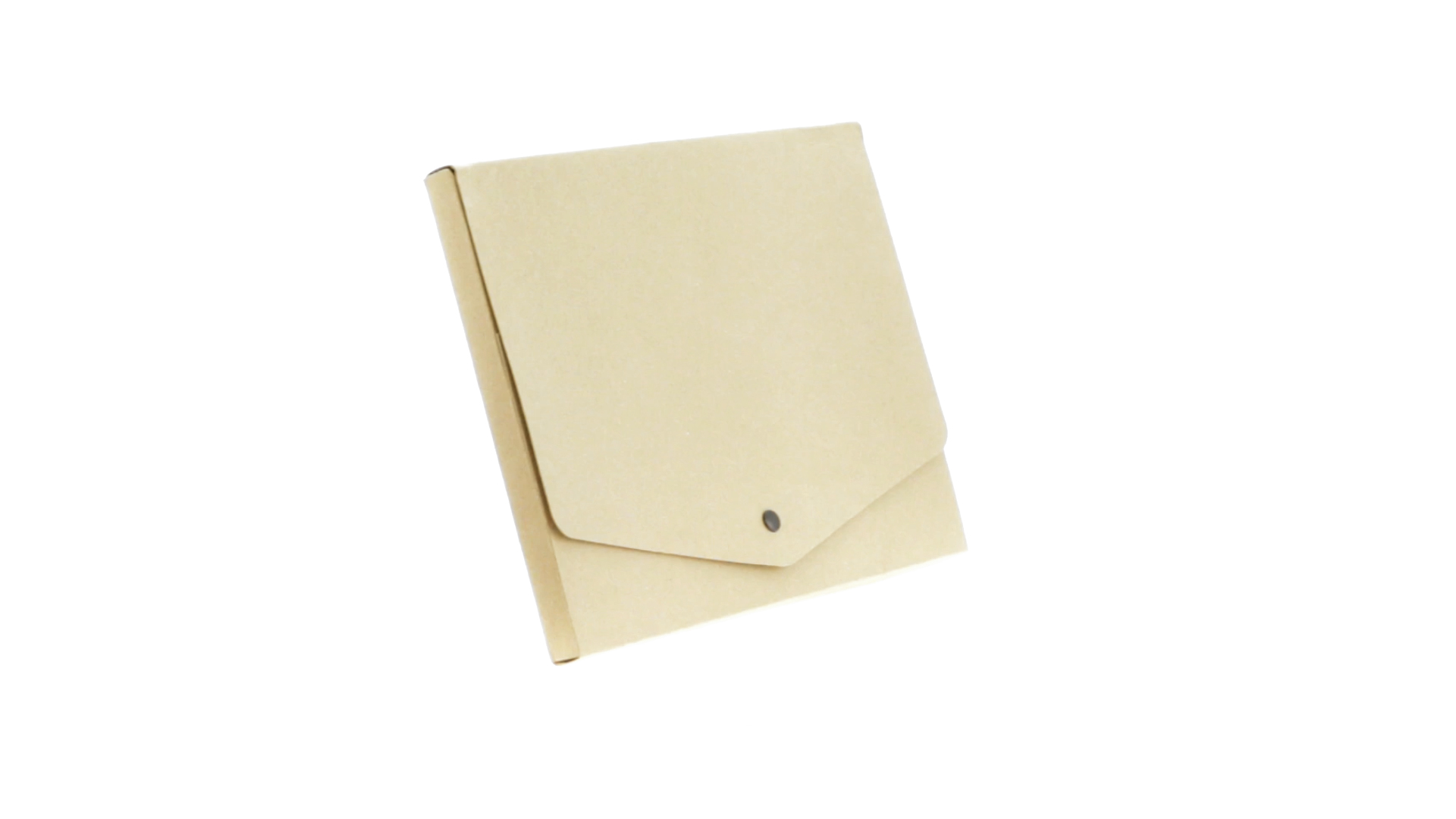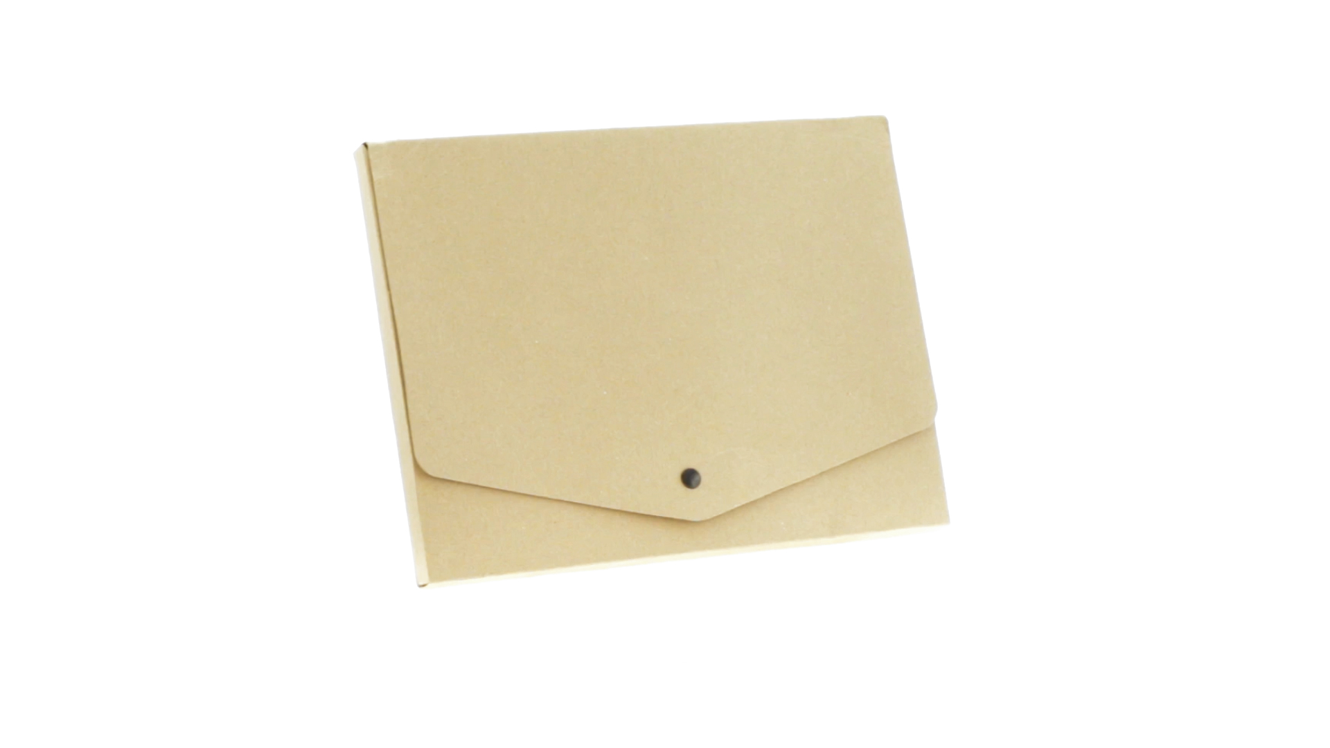 Dokumententasche aus stabilem Recyclingkarton mit Klappenverschluss mit Druckknopf.