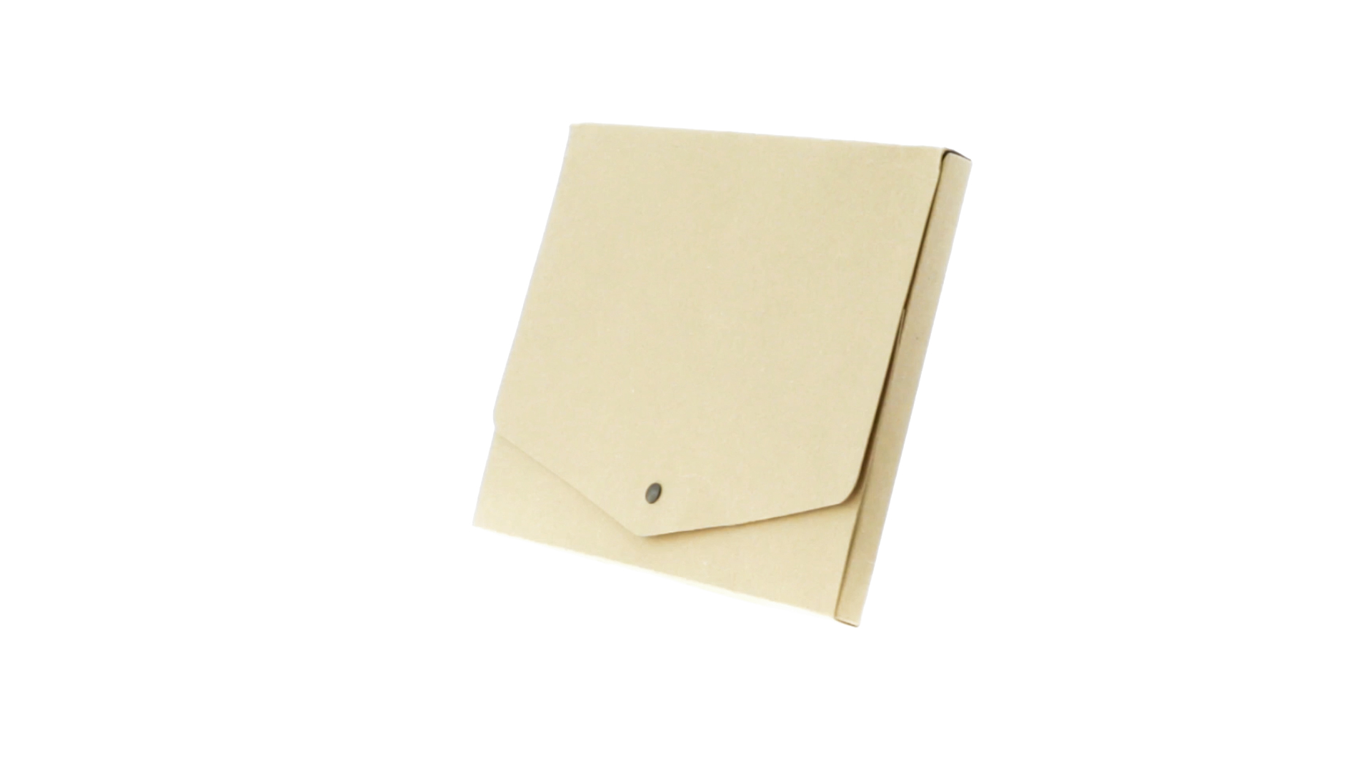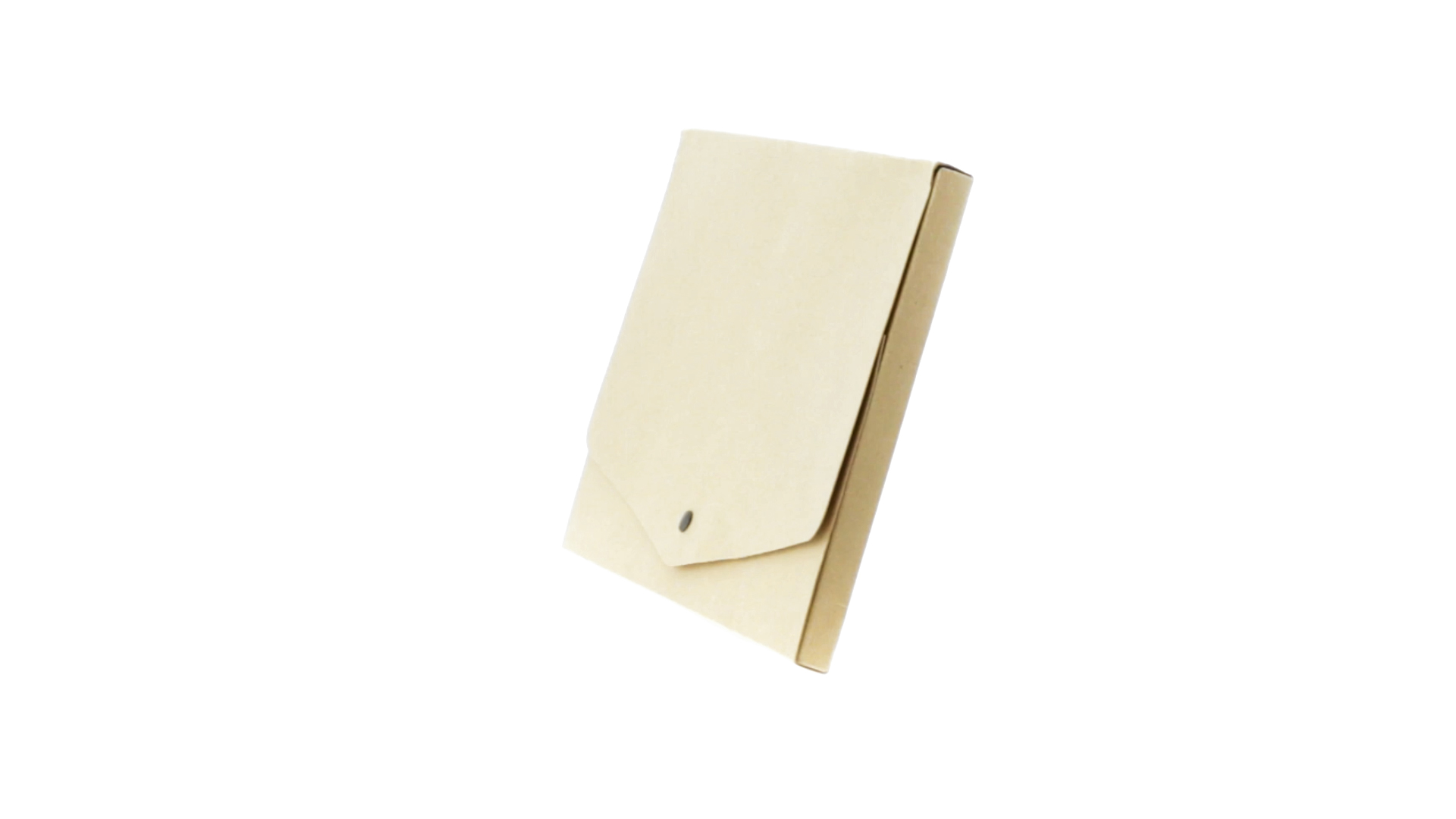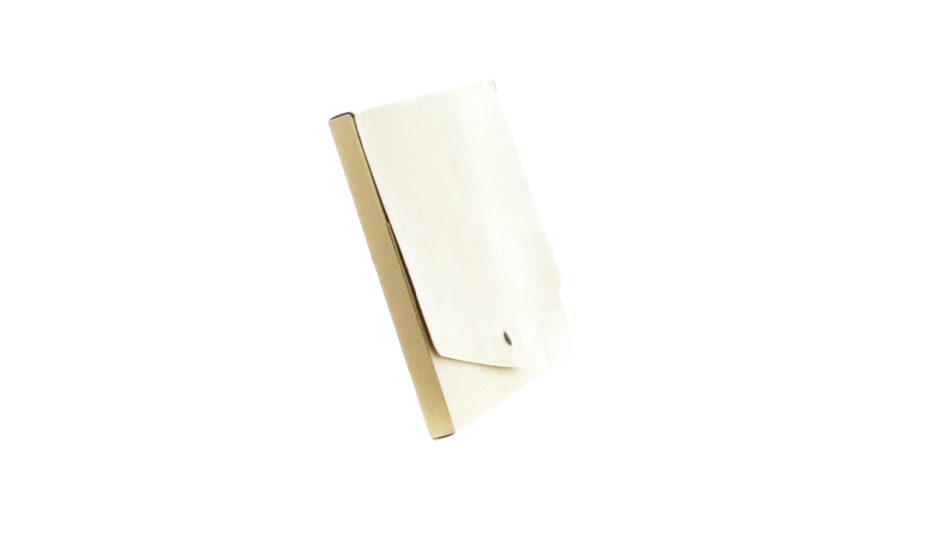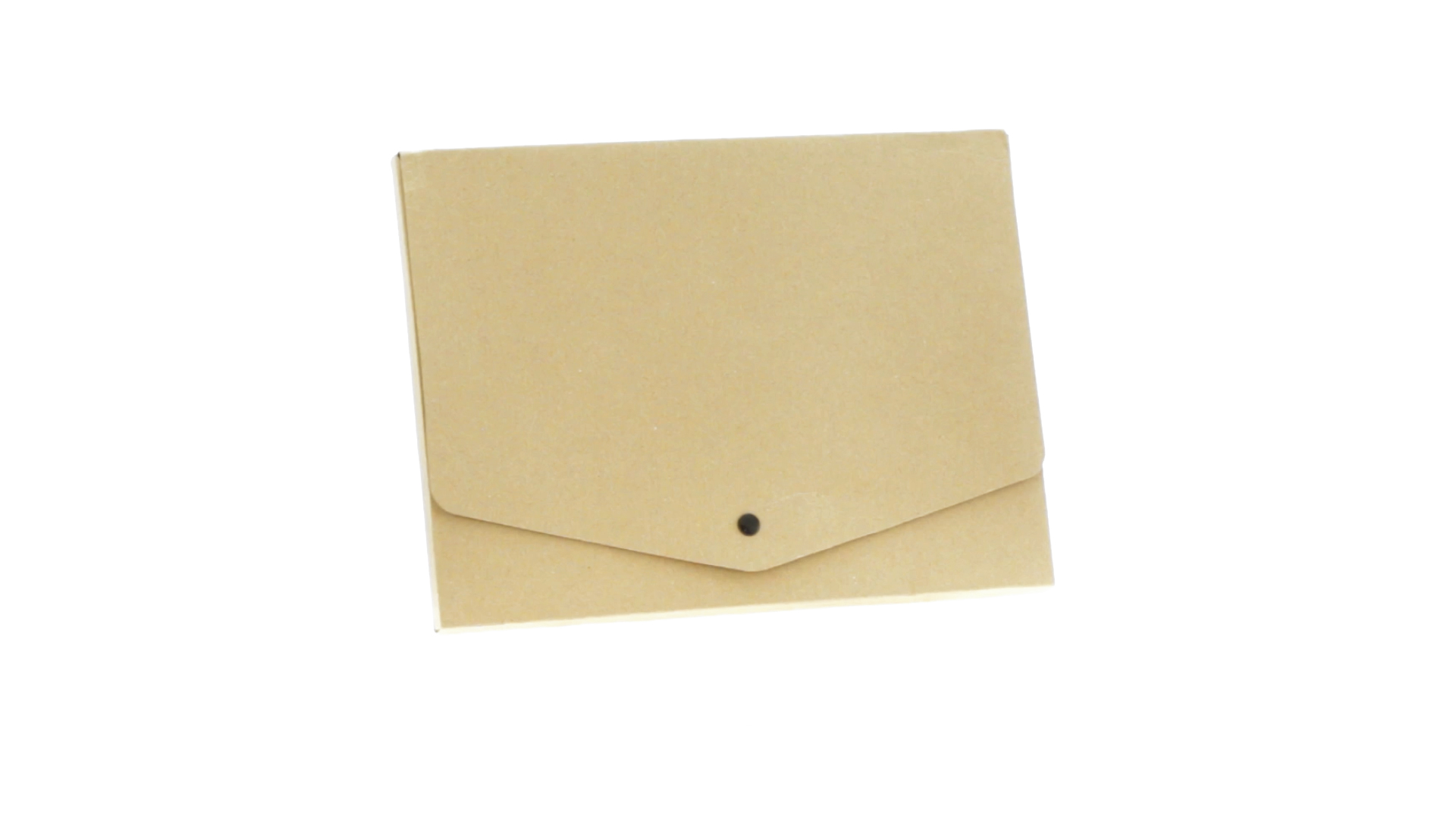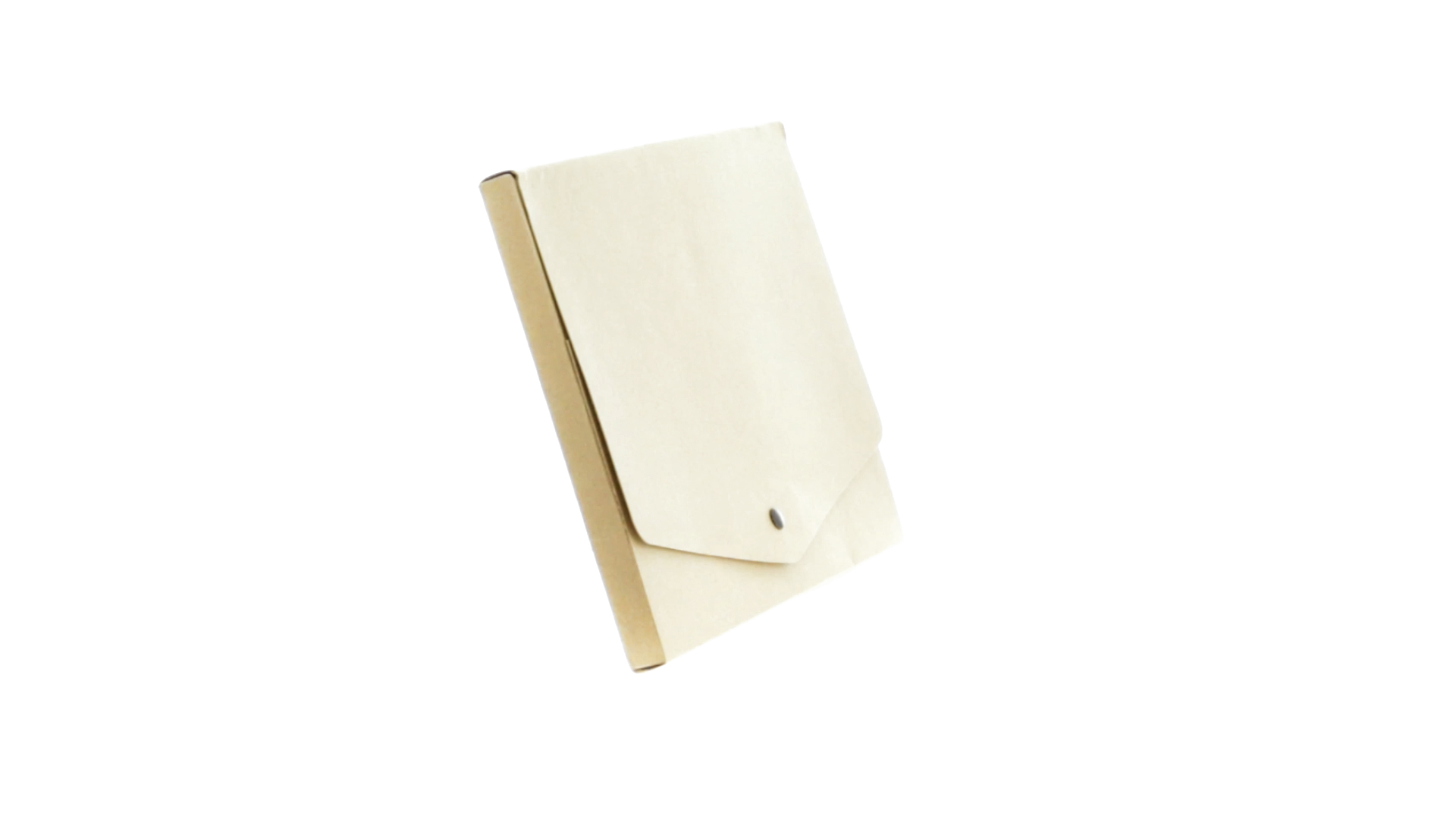 Dokumententasche aus stabilem Recyclingkarton mit Klappenverschluss mit Druckknopf.