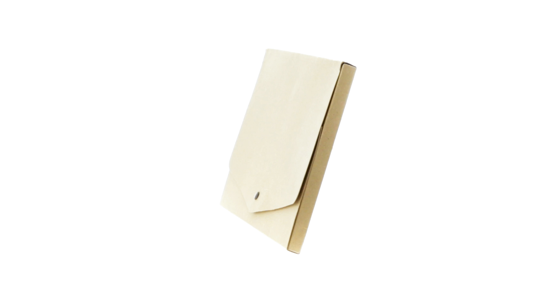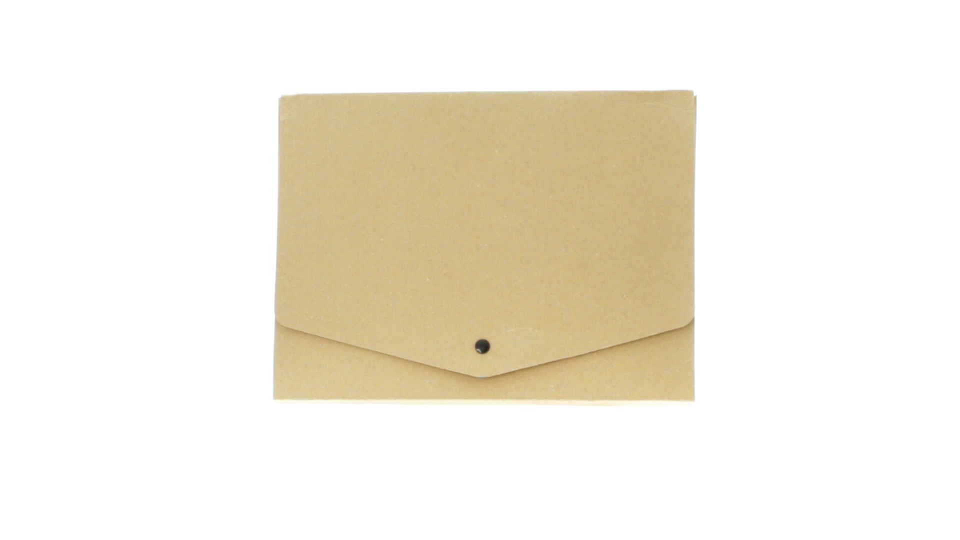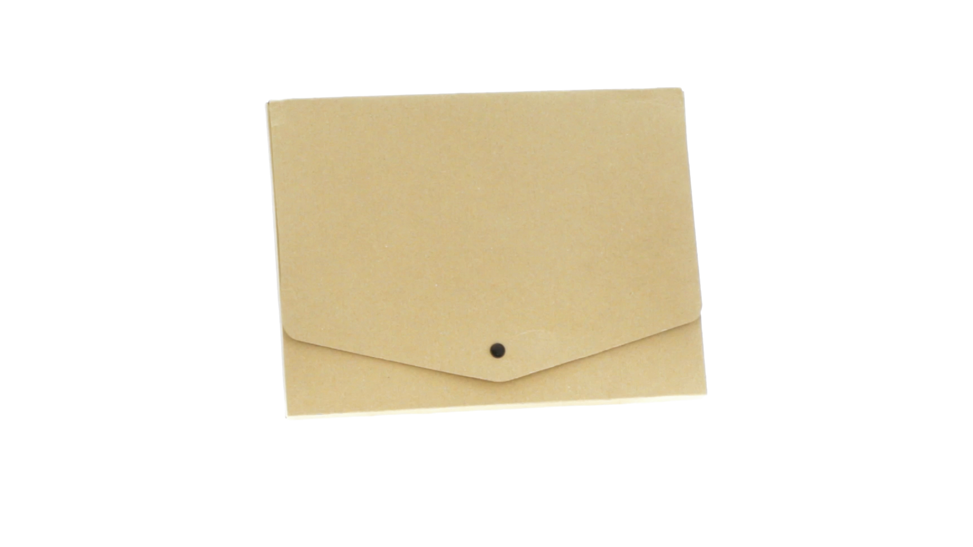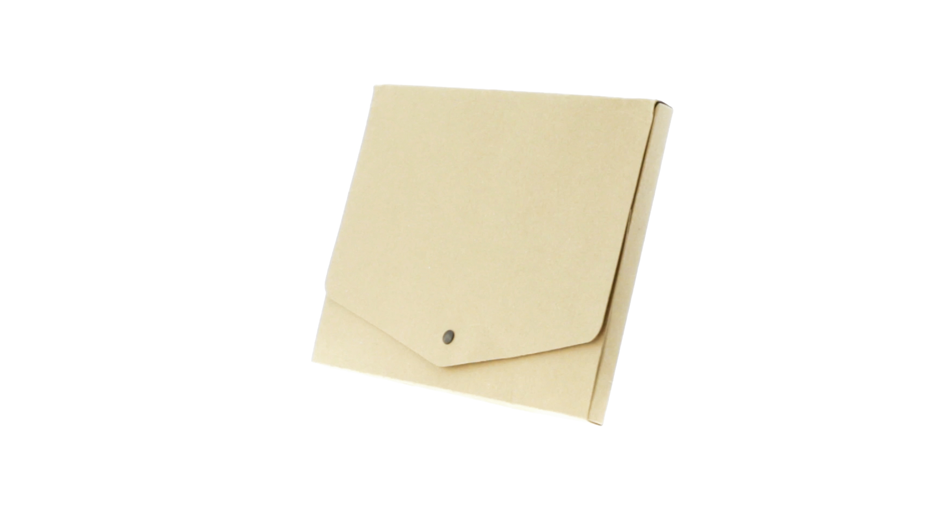 Dokumententasche aus stabilem Recyclingkarton mit Klappenverschluss mit Druckknopf.