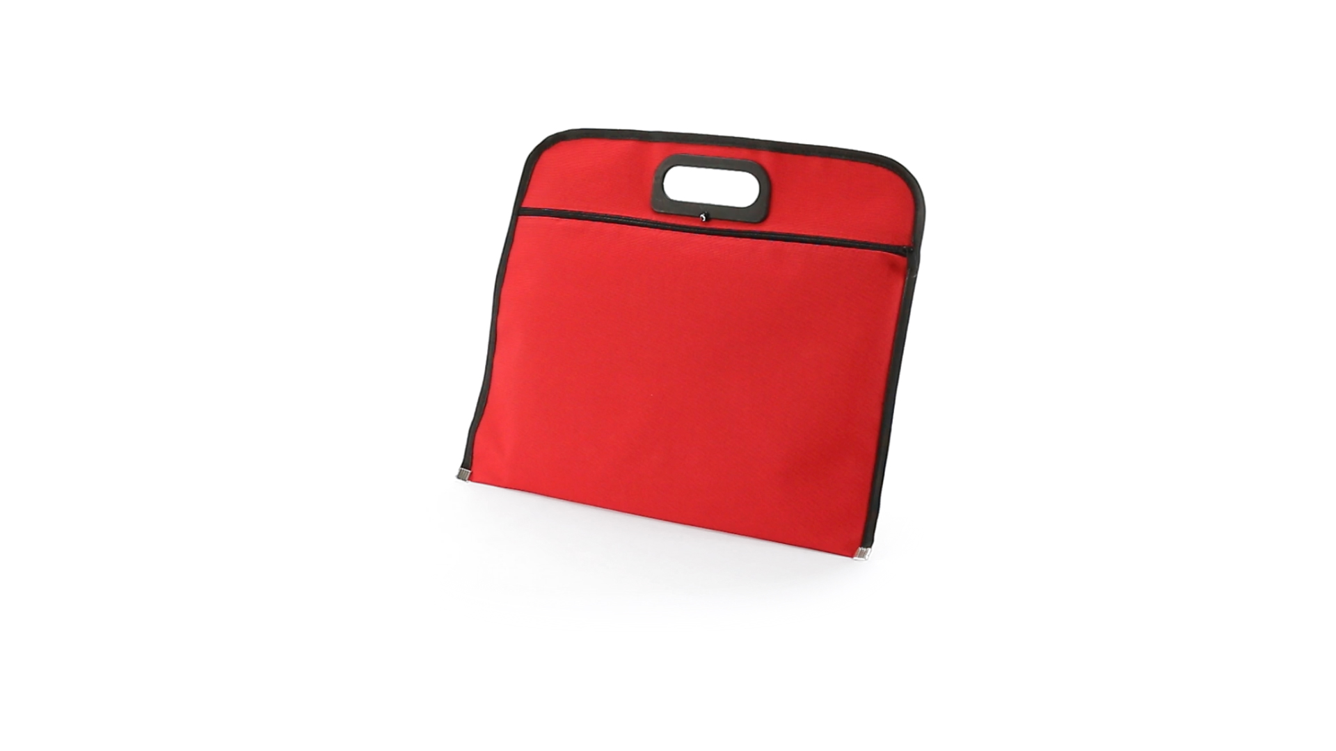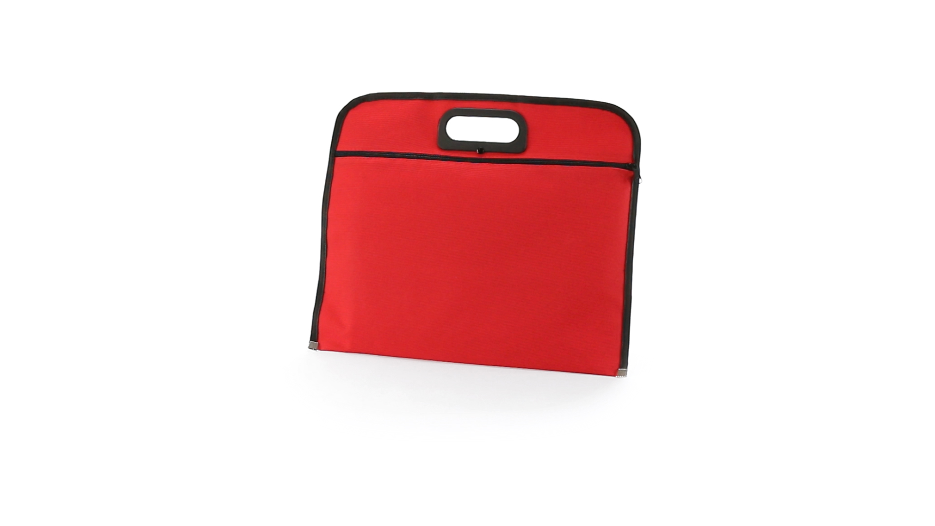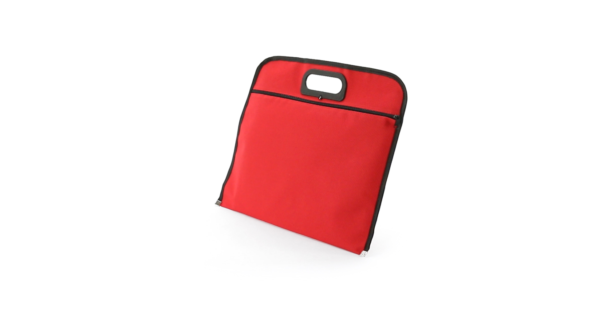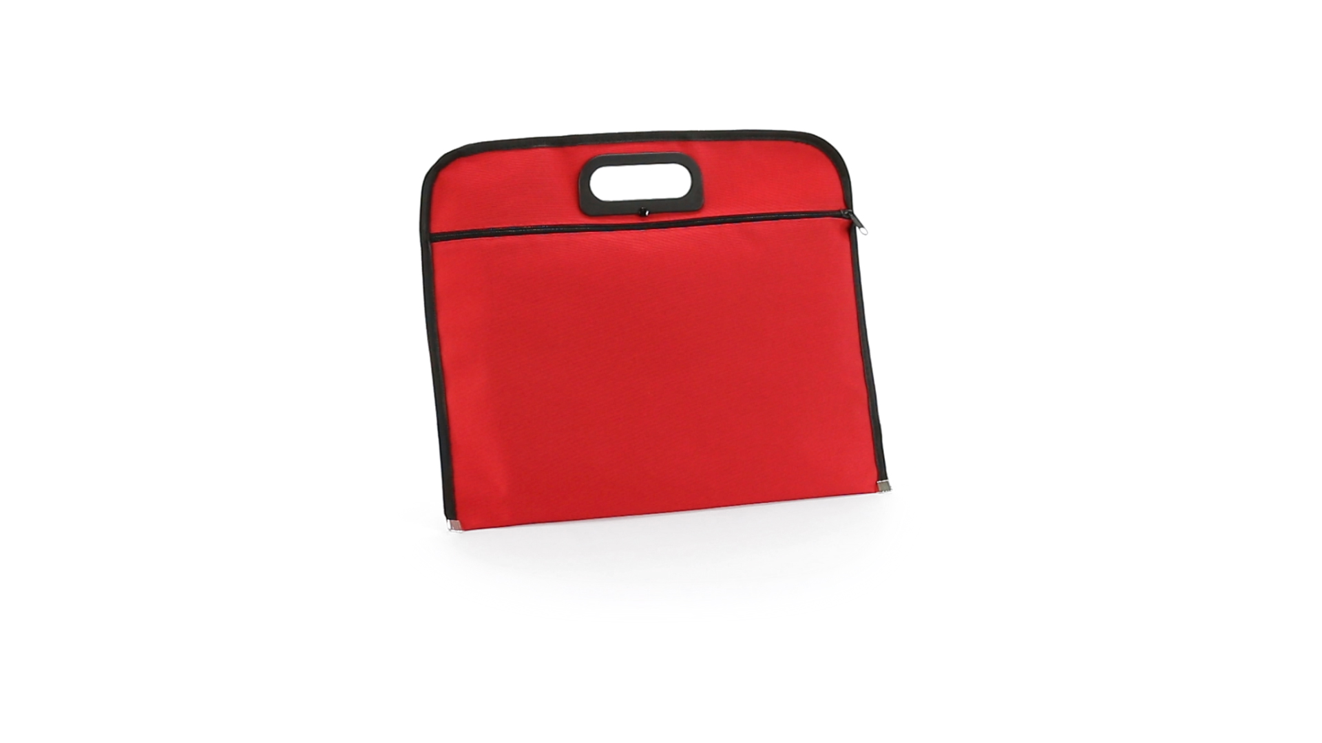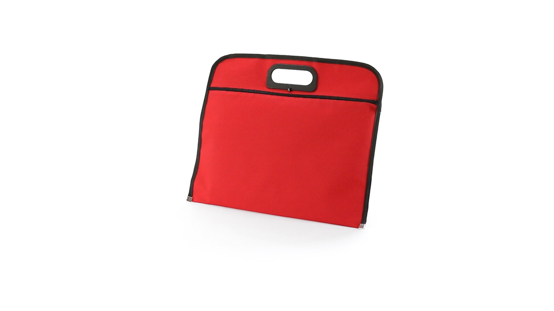 Dokumententasche mit Reissverschluss aus weichem 600D Polyester in lebendigen Farben. Tragegriffe mit originellem Design mit Stanzung, Paspel in Schwarz und Metallverstärkungen am Boden.