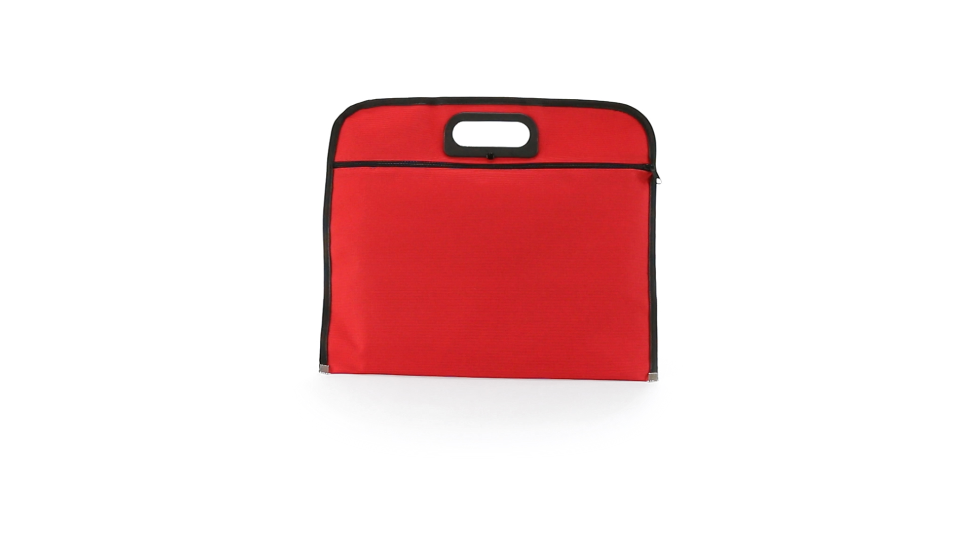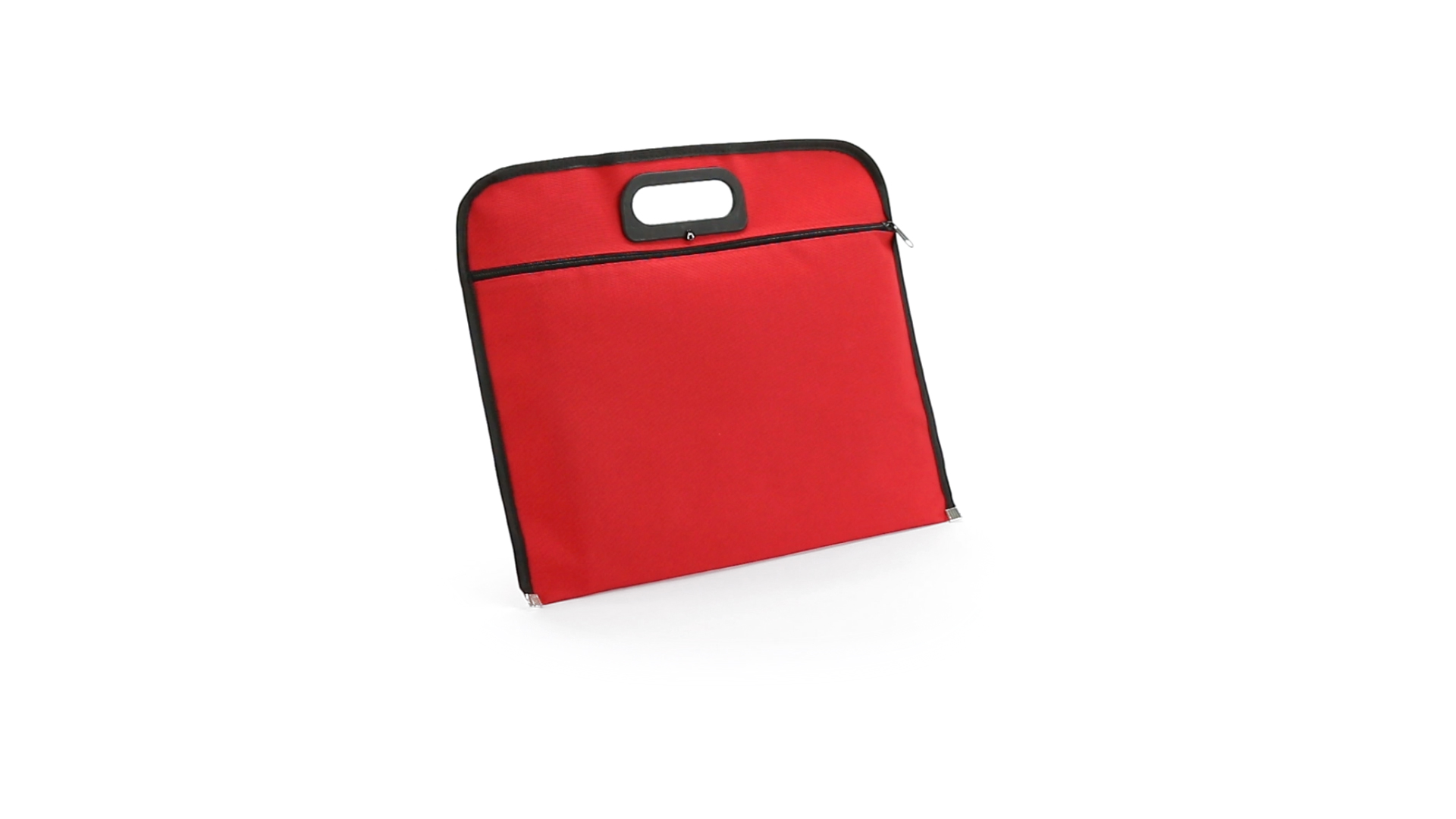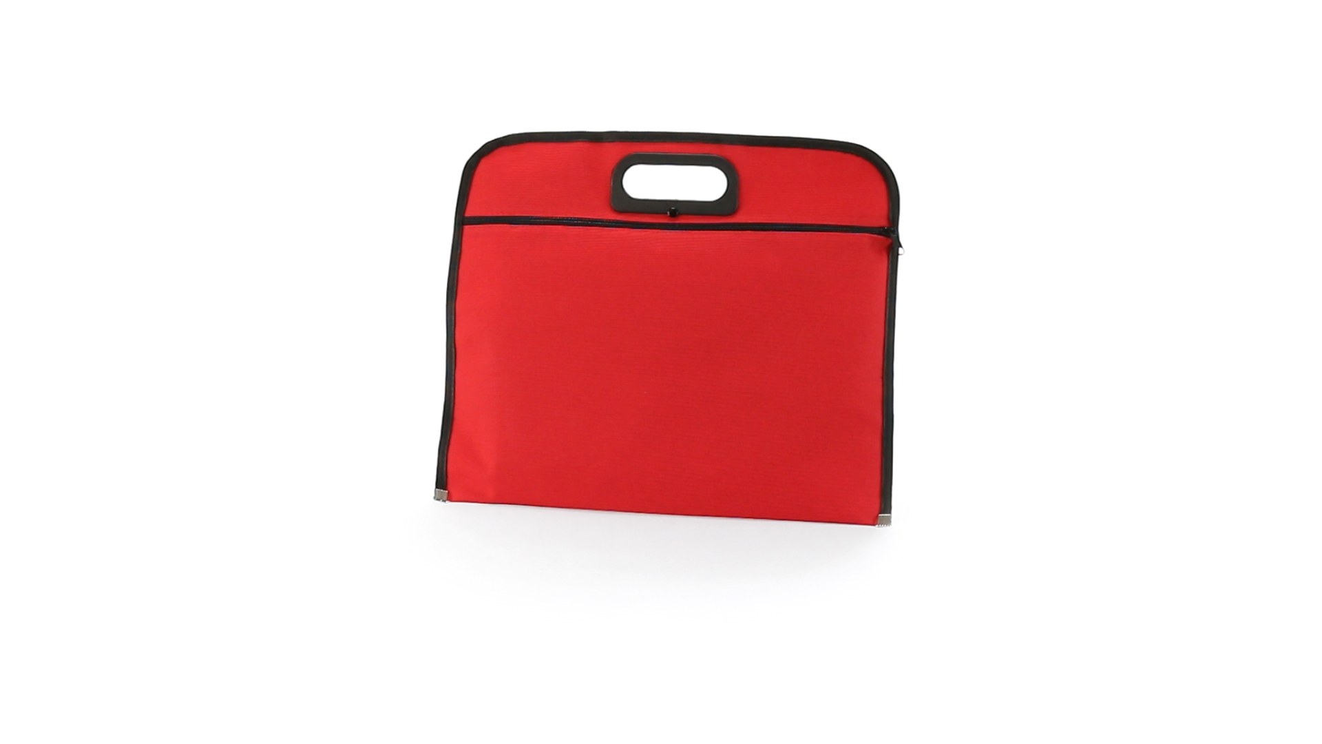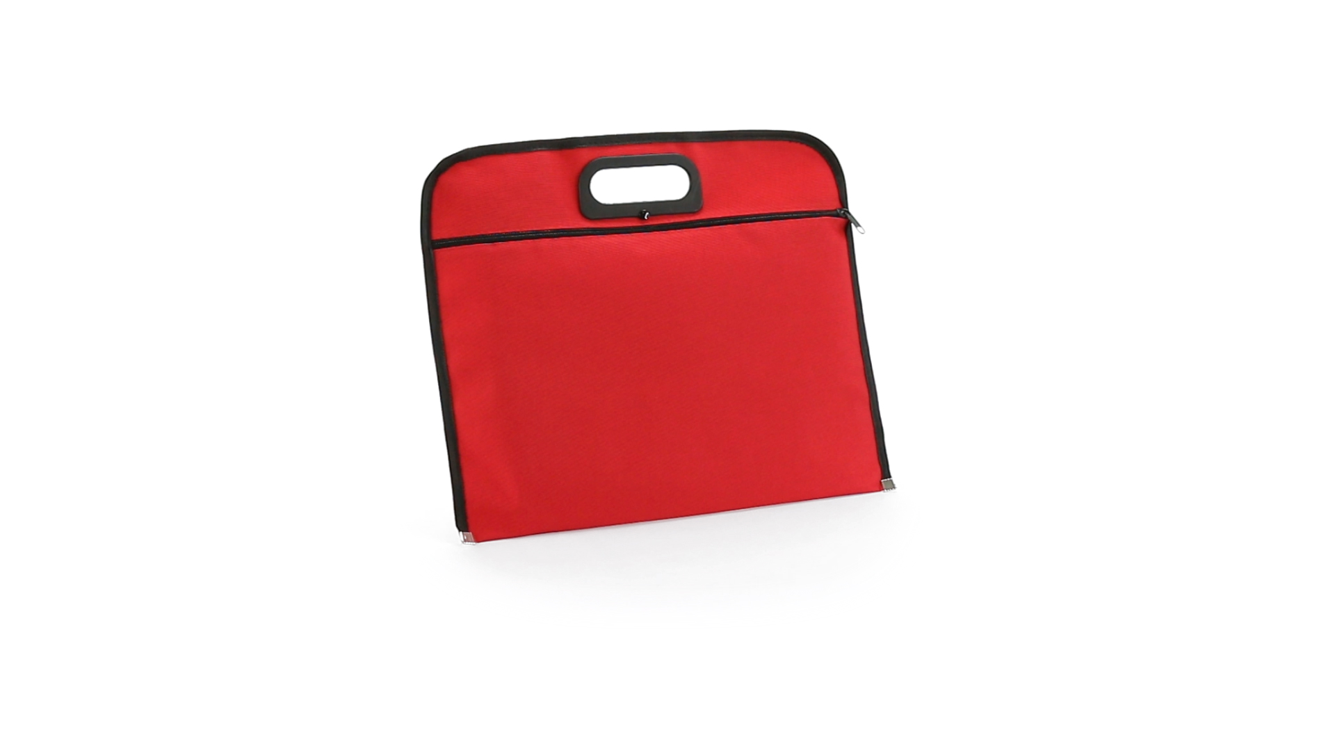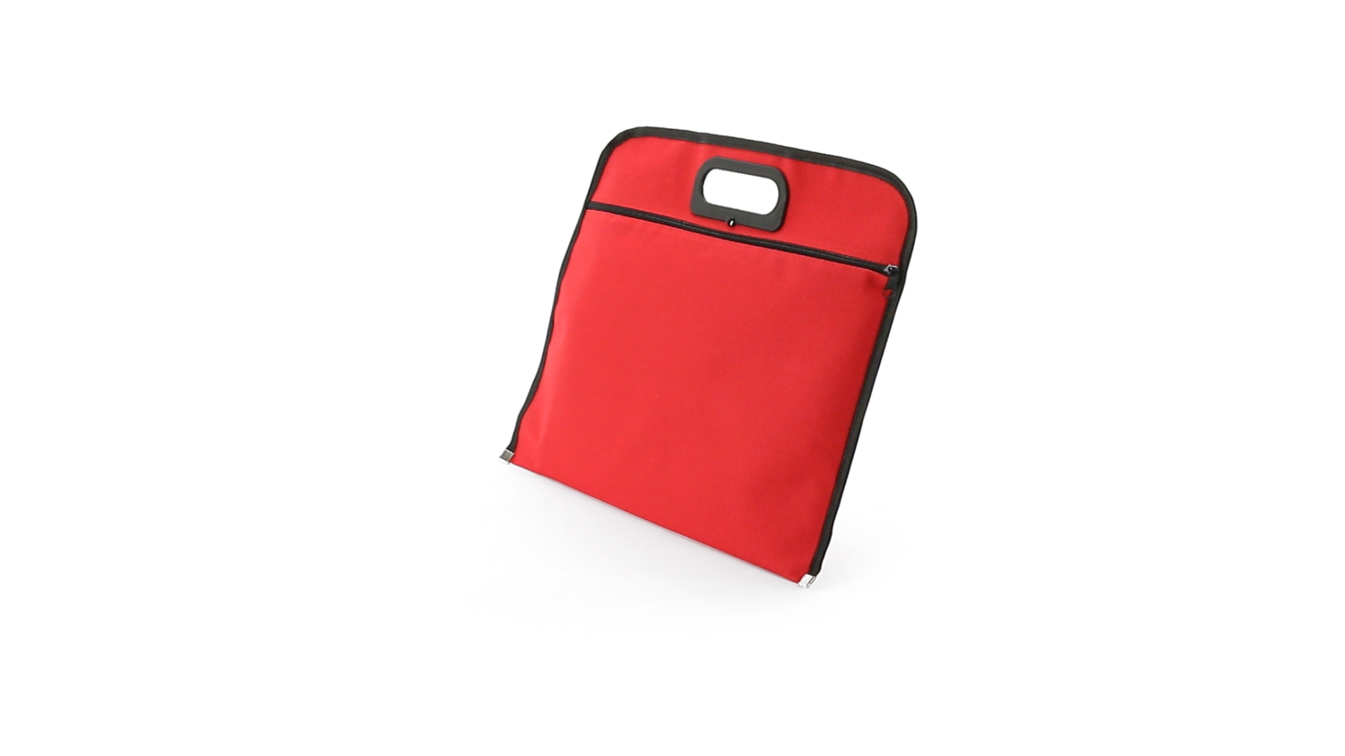 Dokumententasche mit Reissverschluss aus weichem 600D Polyester in lebendigen Farben. Tragegriffe mit originellem Design mit Stanzung, Paspel in Schwarz und Metallverstärkungen am Boden.