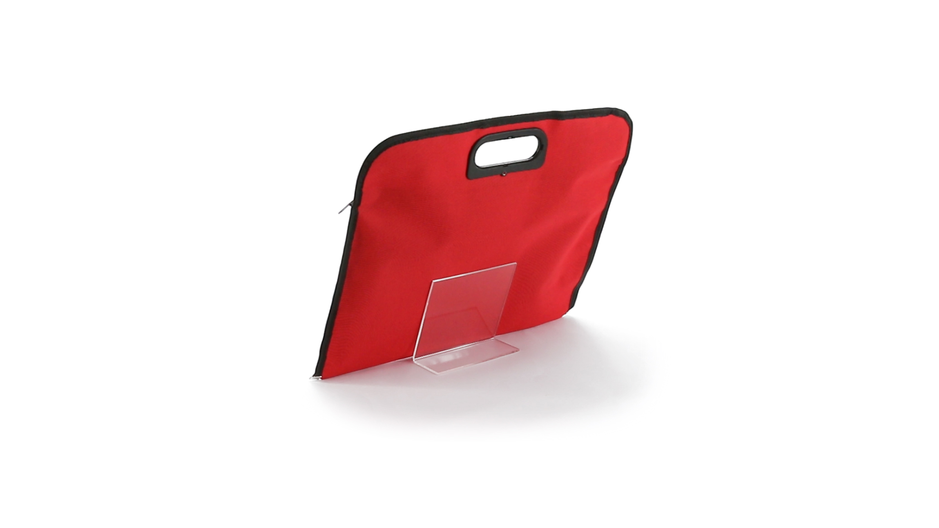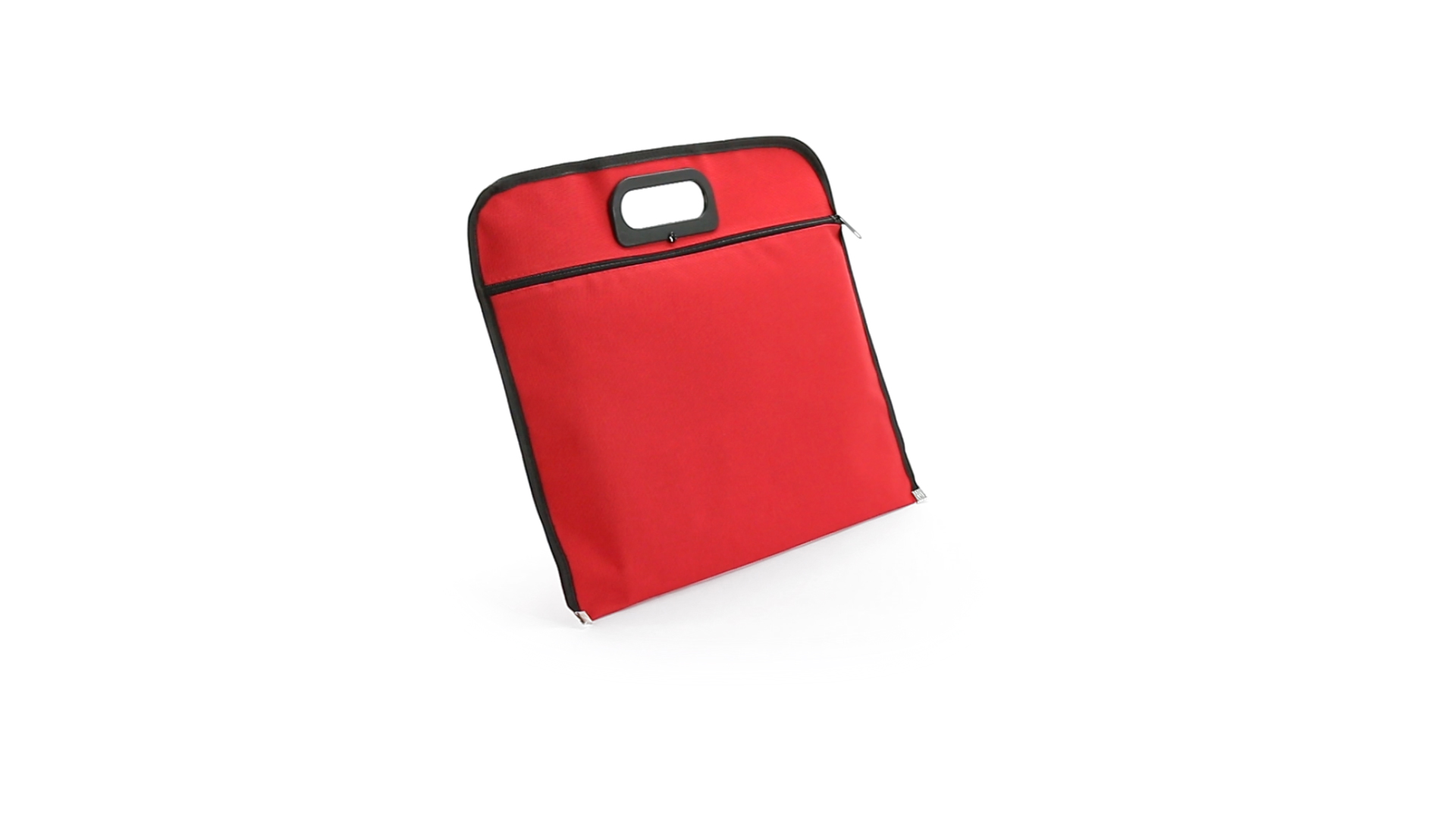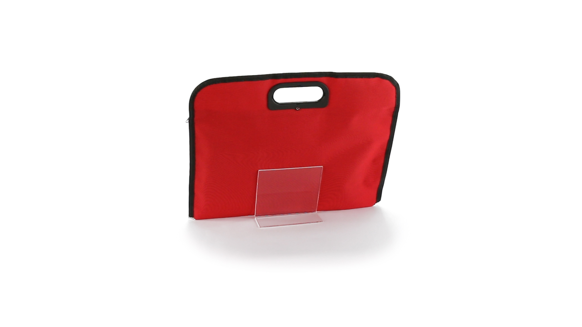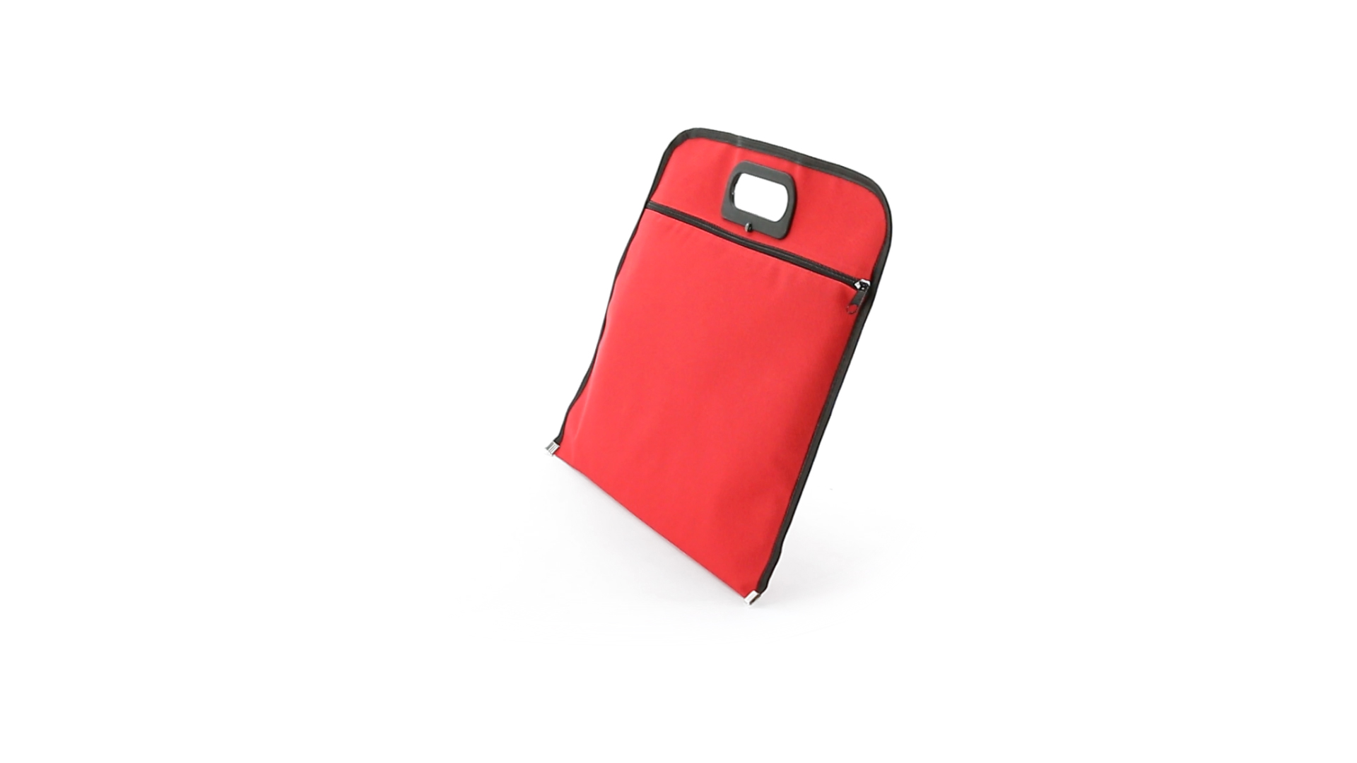 Dokumententasche mit Reissverschluss aus weichem 600D Polyester in lebendigen Farben. Tragegriffe mit originellem Design mit Stanzung, Paspel in Schwarz und Metallverstärkungen am Boden.