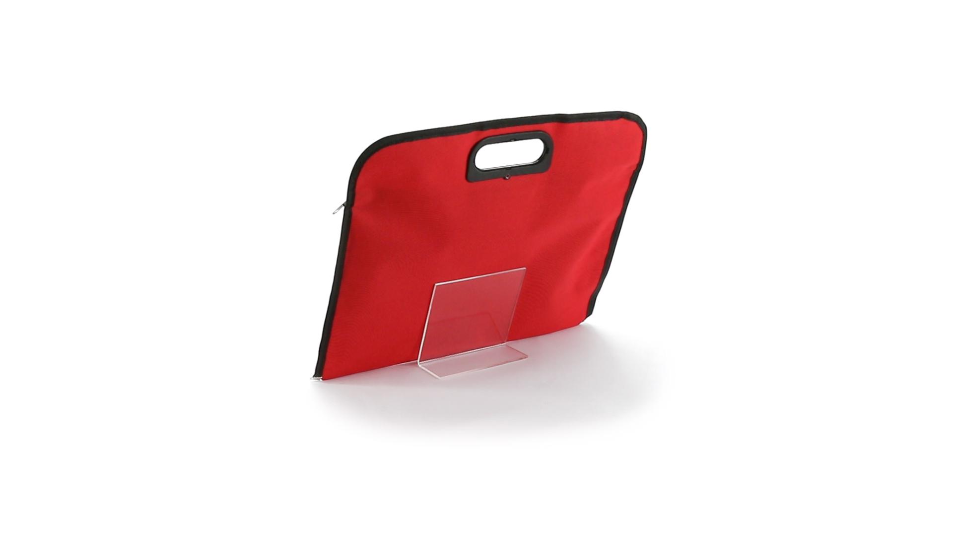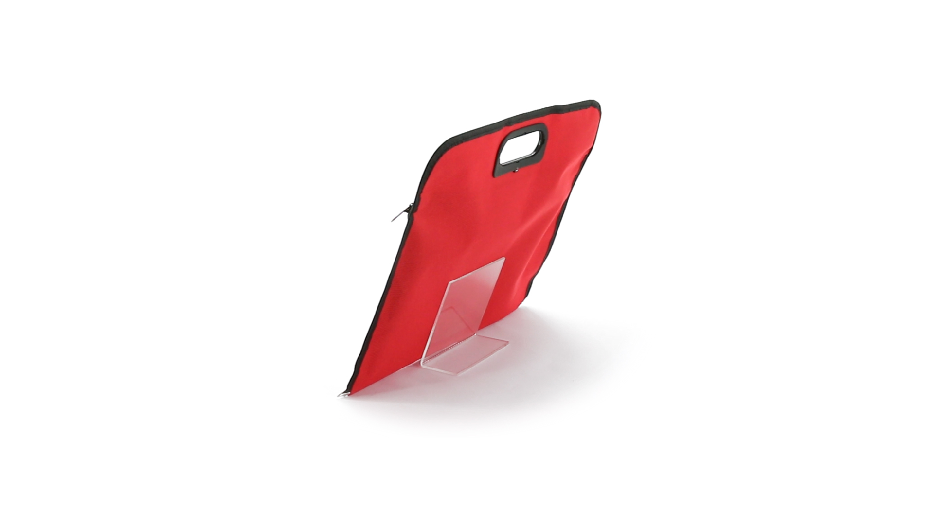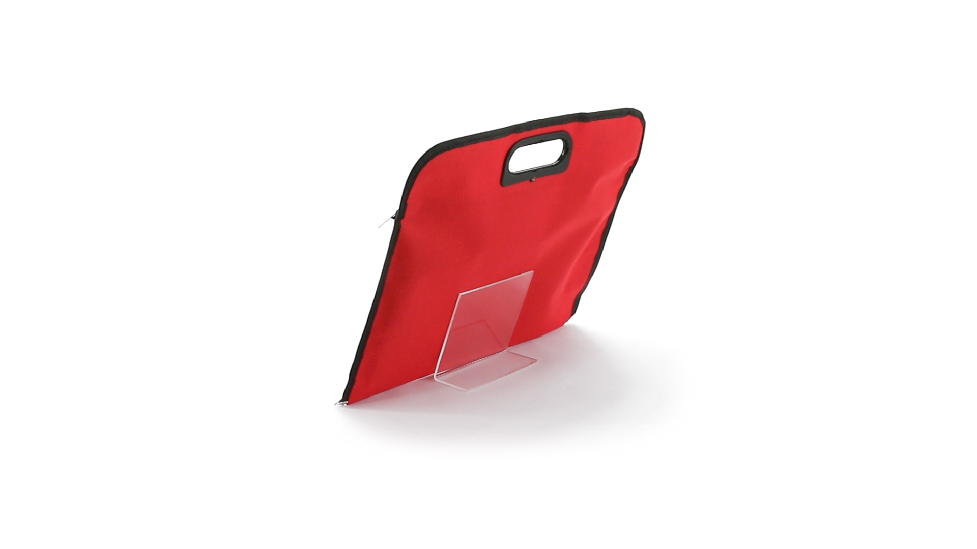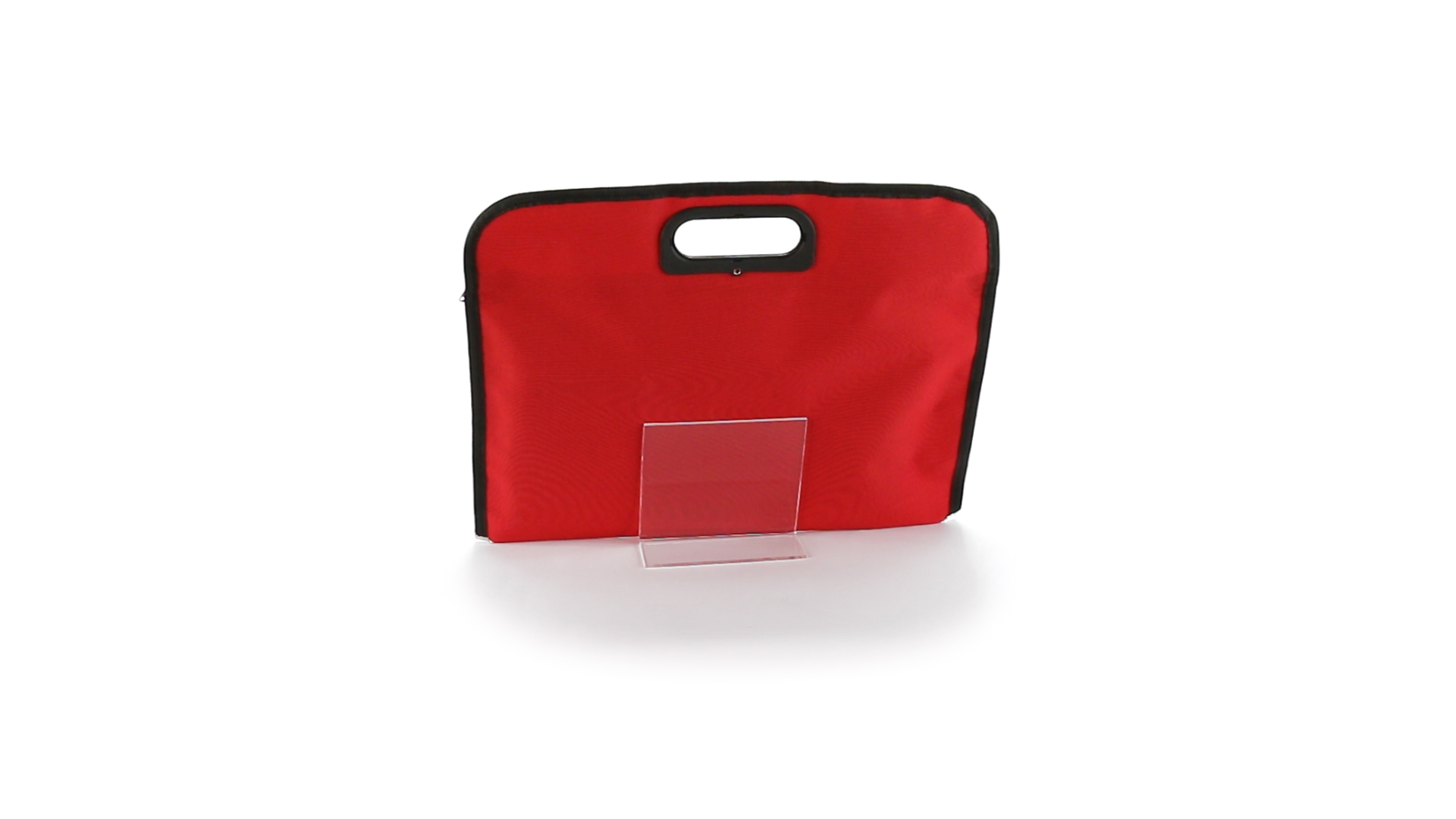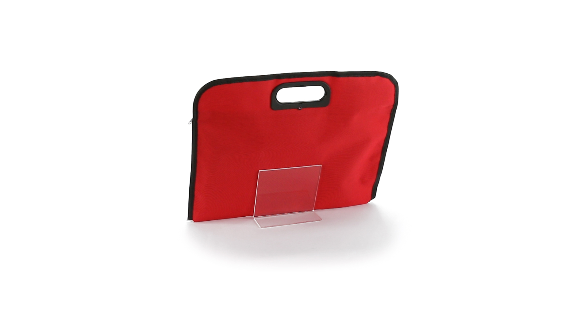 Dokumententasche mit Reissverschluss aus weichem 600D Polyester in lebendigen Farben. Tragegriffe mit originellem Design mit Stanzung, Paspel in Schwarz und Metallverstärkungen am Boden.