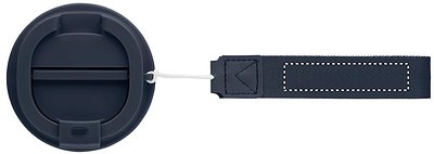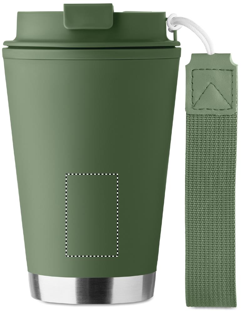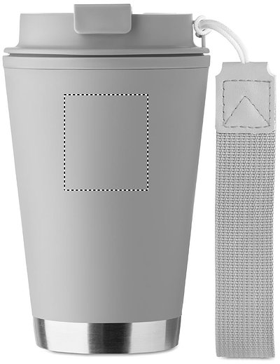 Doppelwandiger Becher mit Innenseite aus PP, Aussenseite aus recyceltem PP, Details aus recyceltem Edelstahl. RPET-Handschlaufe. Füllmenge: 300 ml.