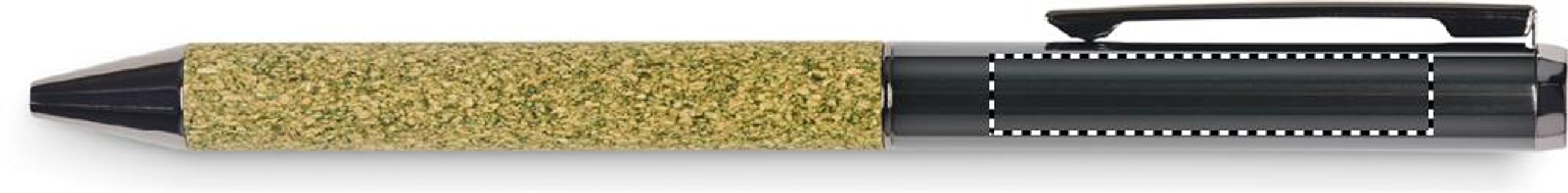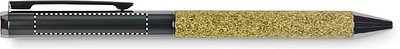 Drehkugelschreiber aus Metall. Schaft mit Dekor aus 20% Teesatz, 30% Kork, 50% Polycotton. Lieferung in Schachtel. Blaue Tinte.