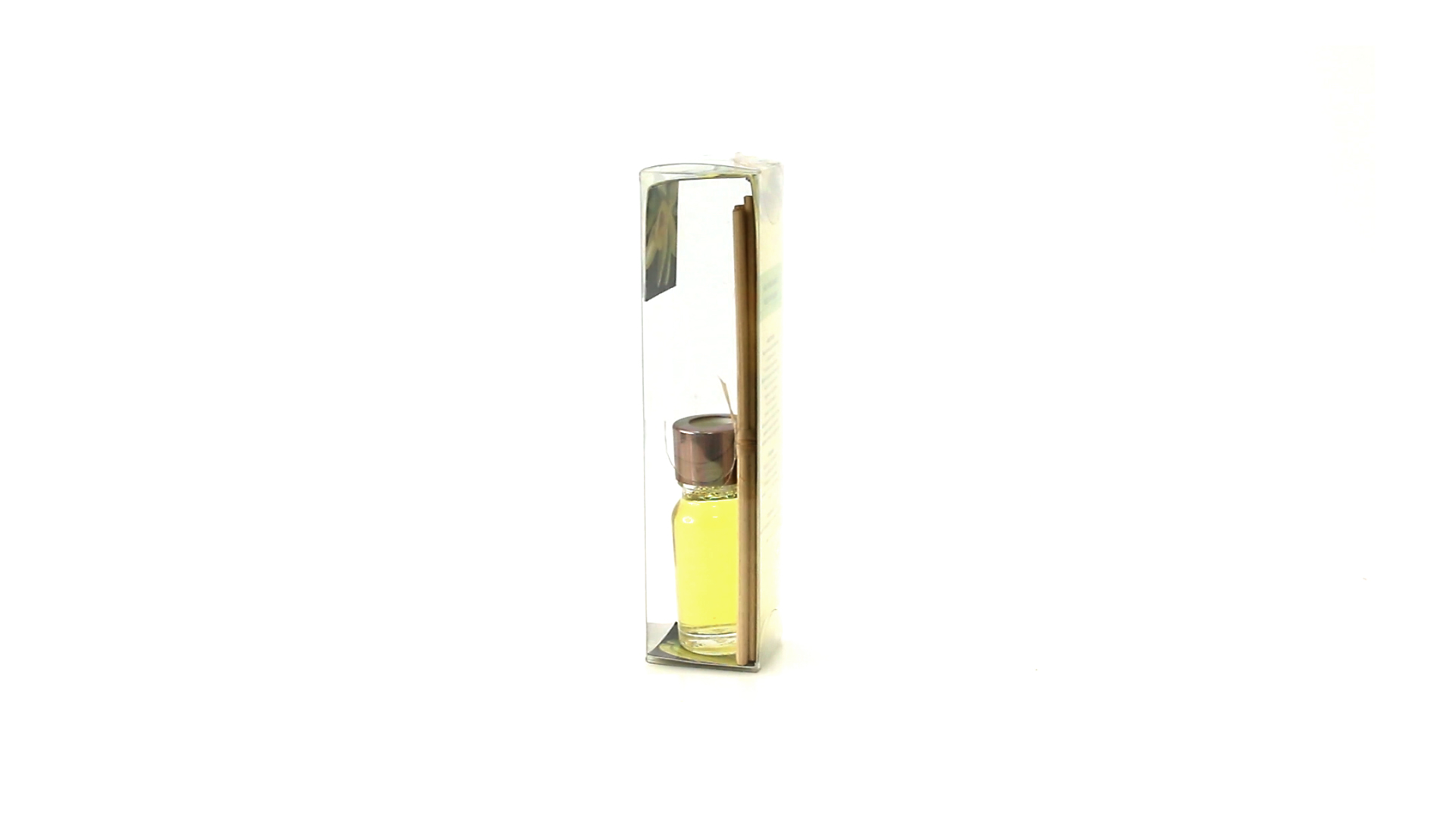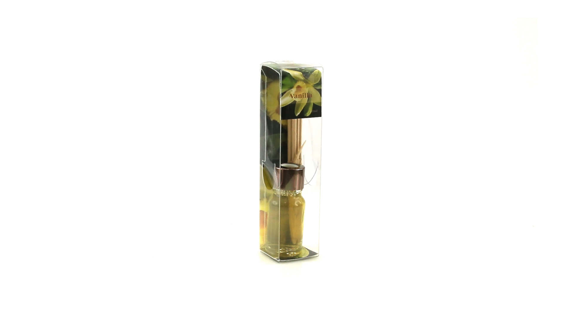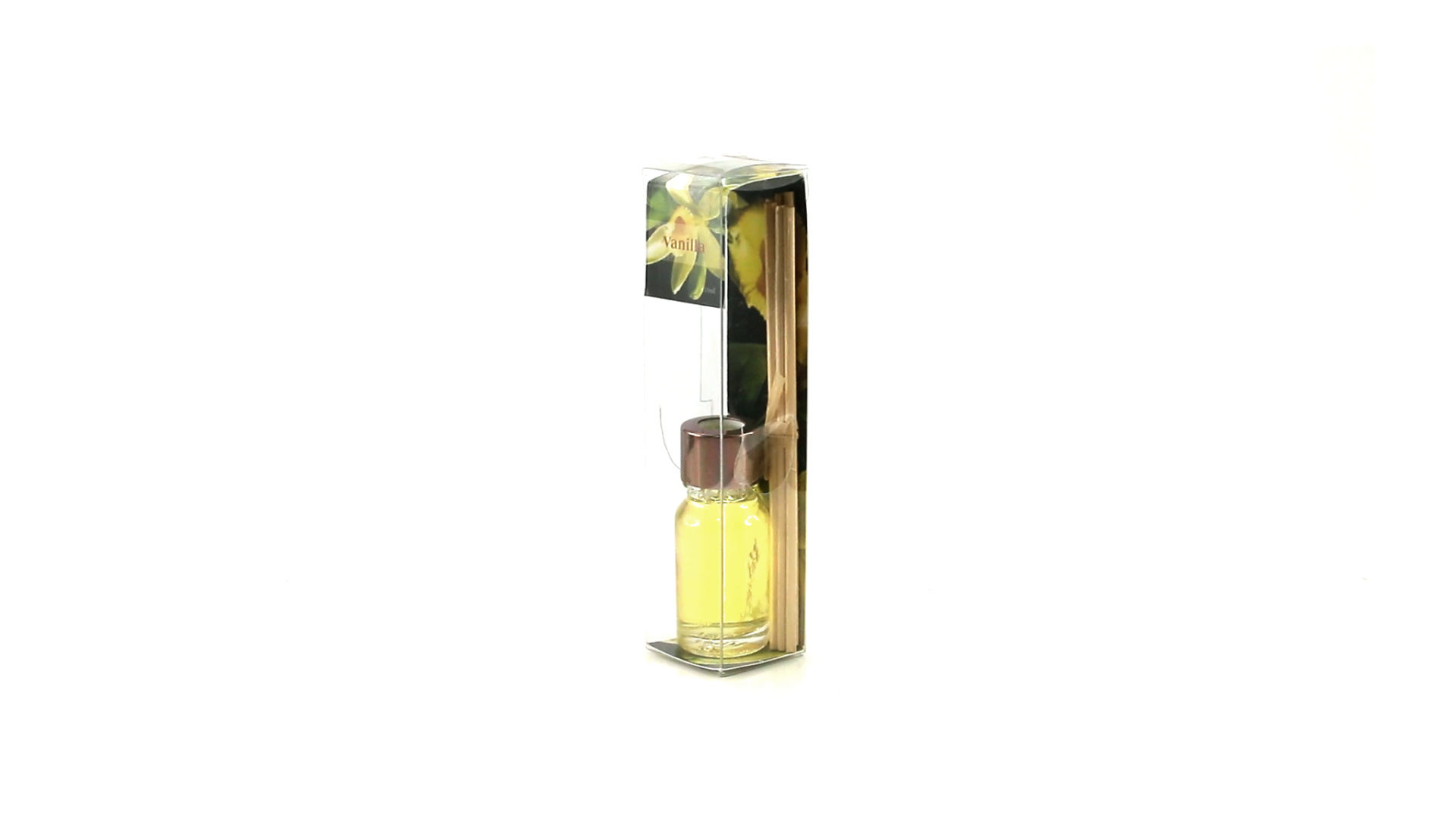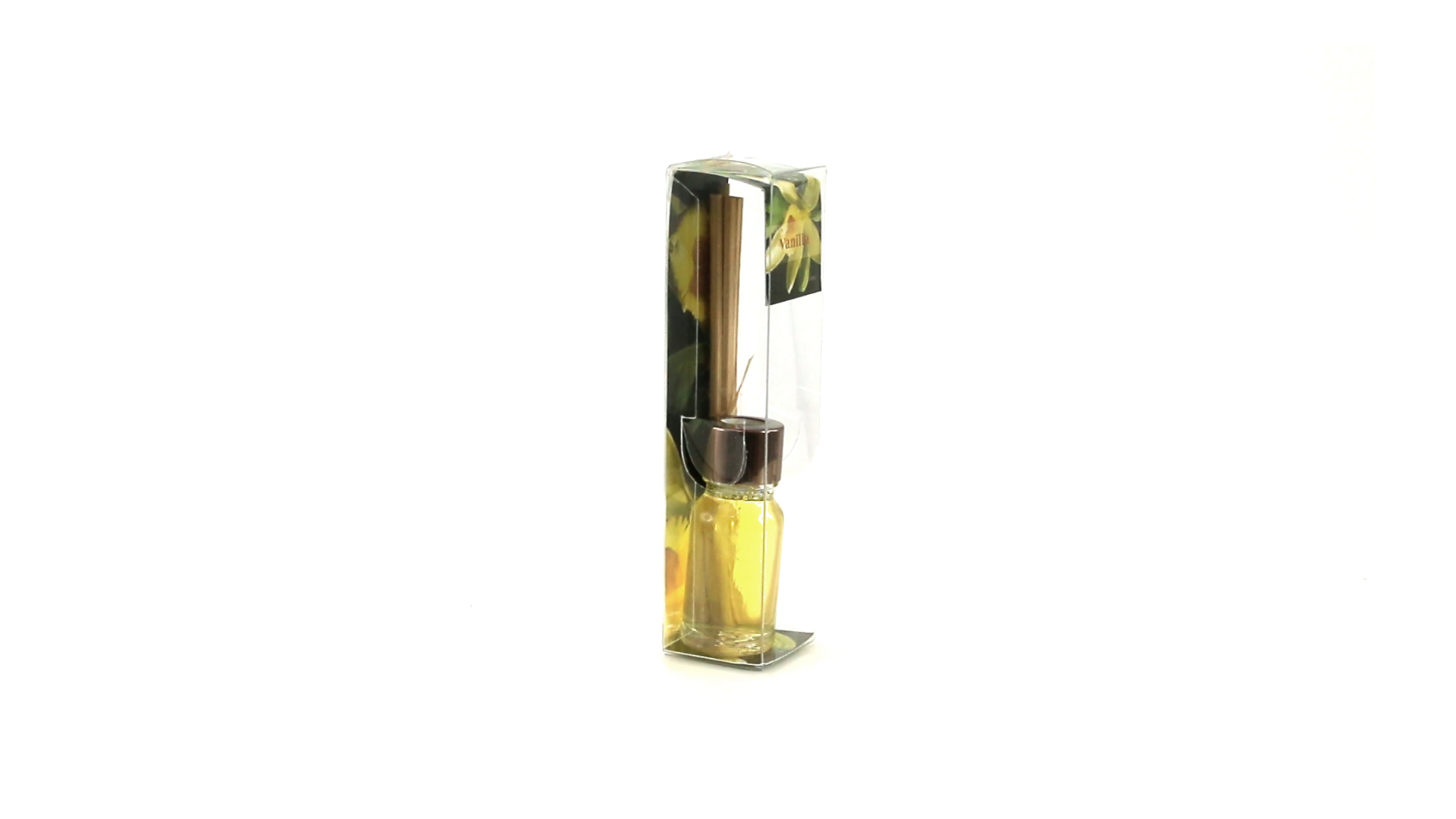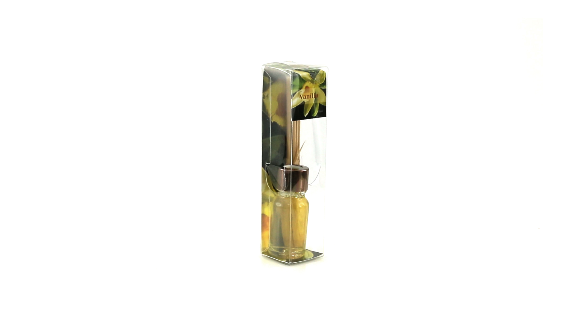 Lufterfrischer mit Holzstäbchen. Glas mit 10 ml Aromaflüssigkeit mit Vanille- oder Ozeanduft. Präsentiert in einer individuellen PVC-Box.