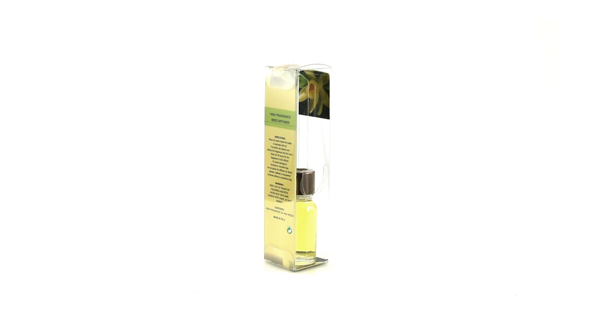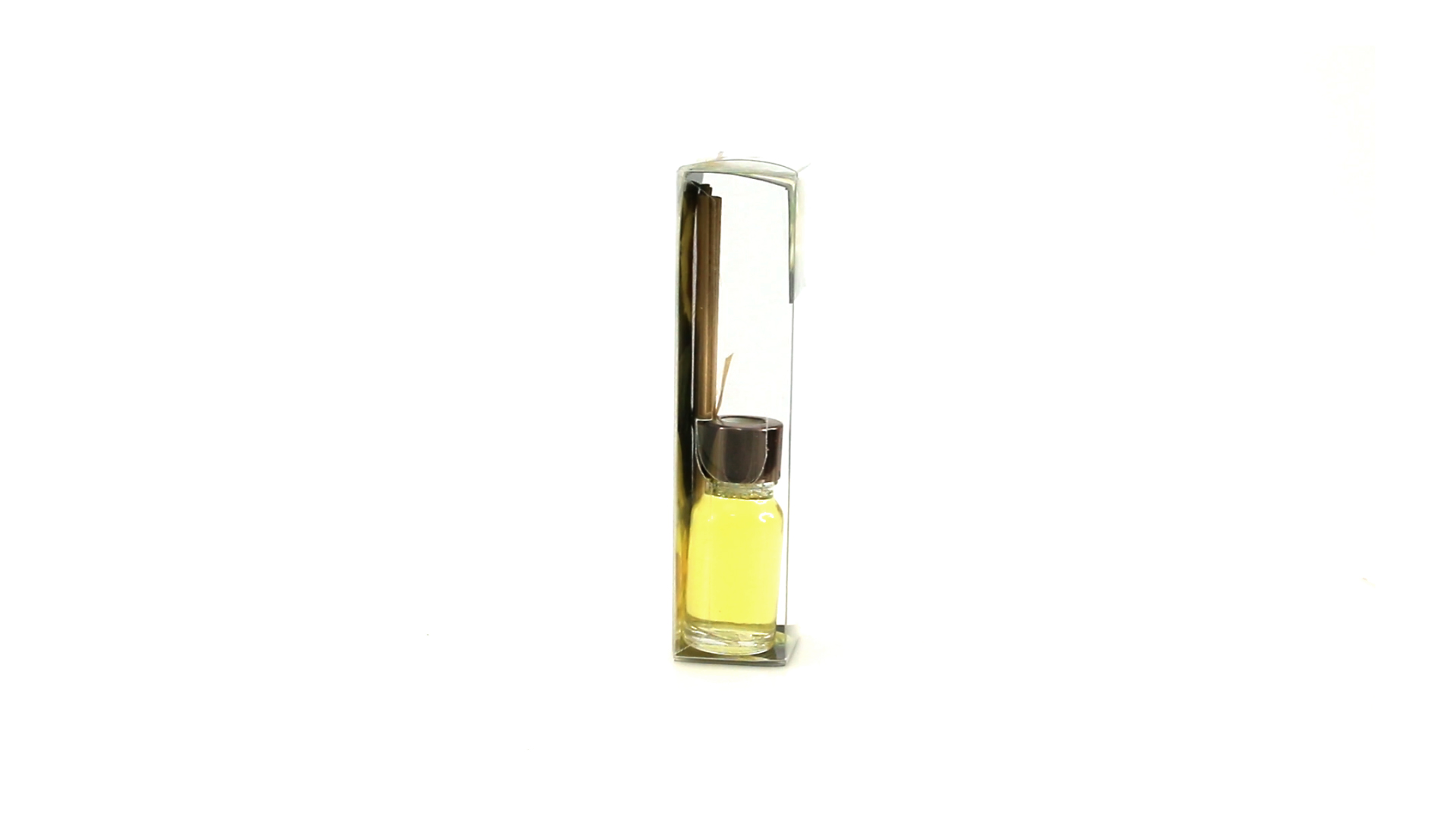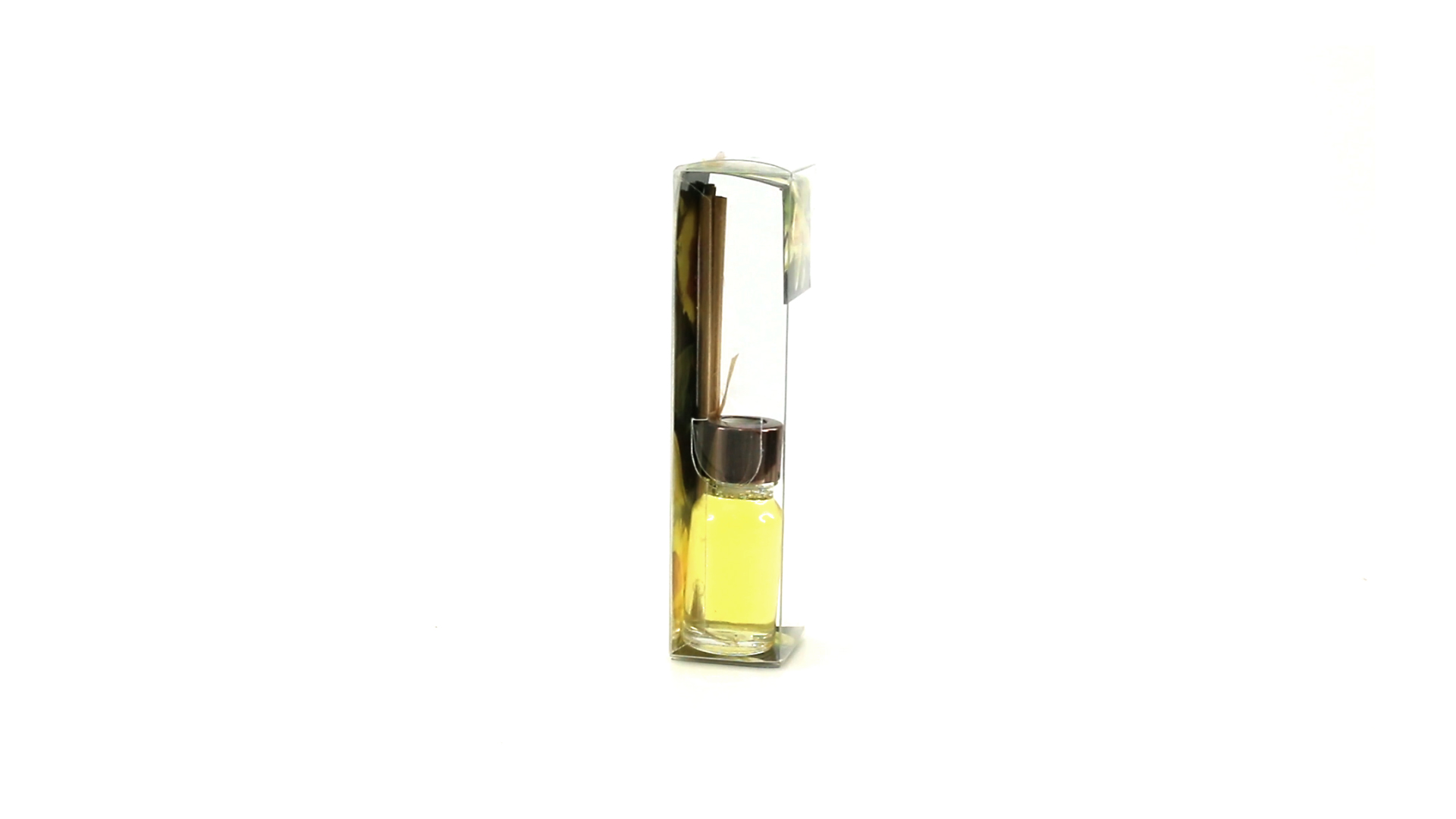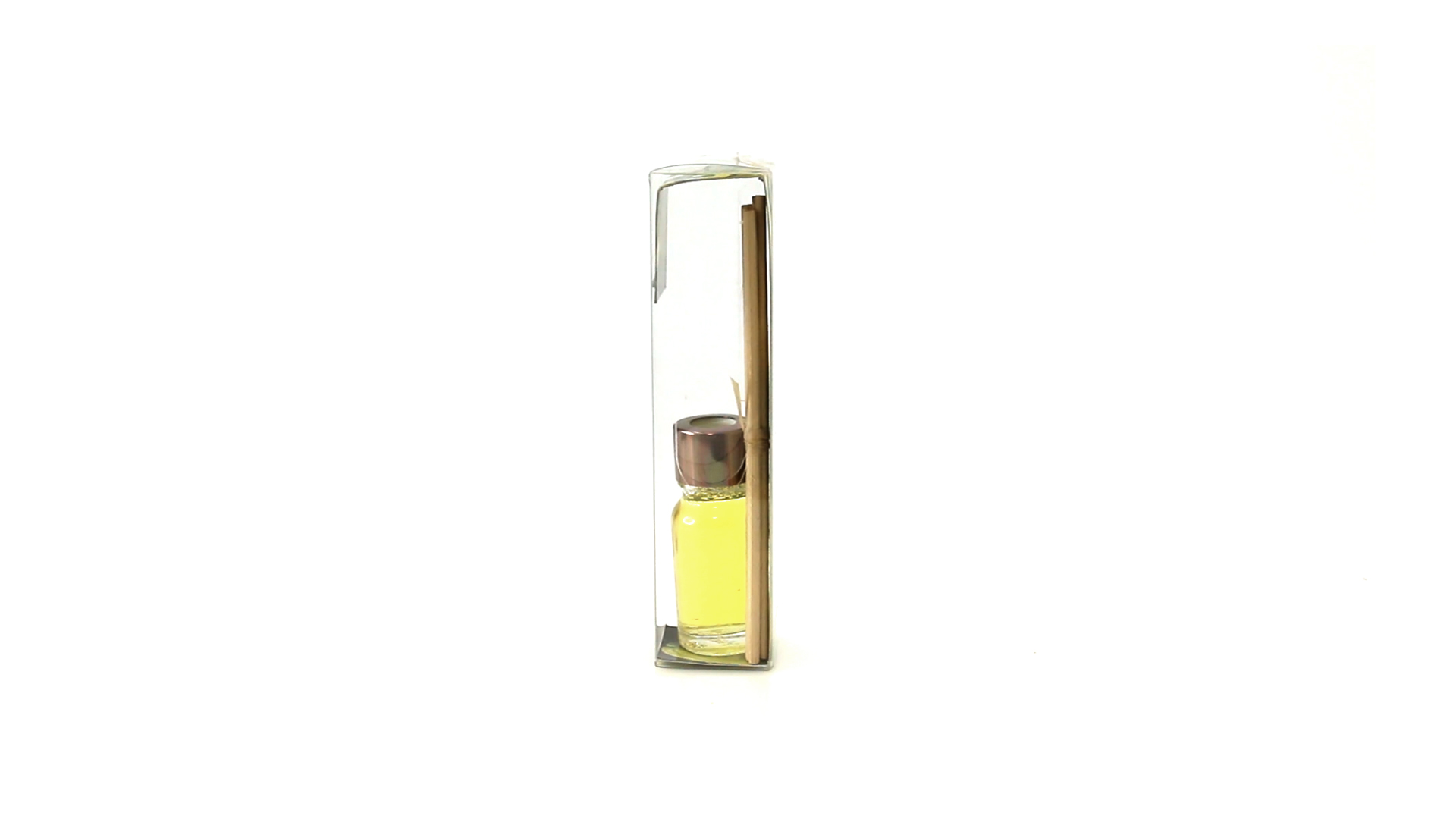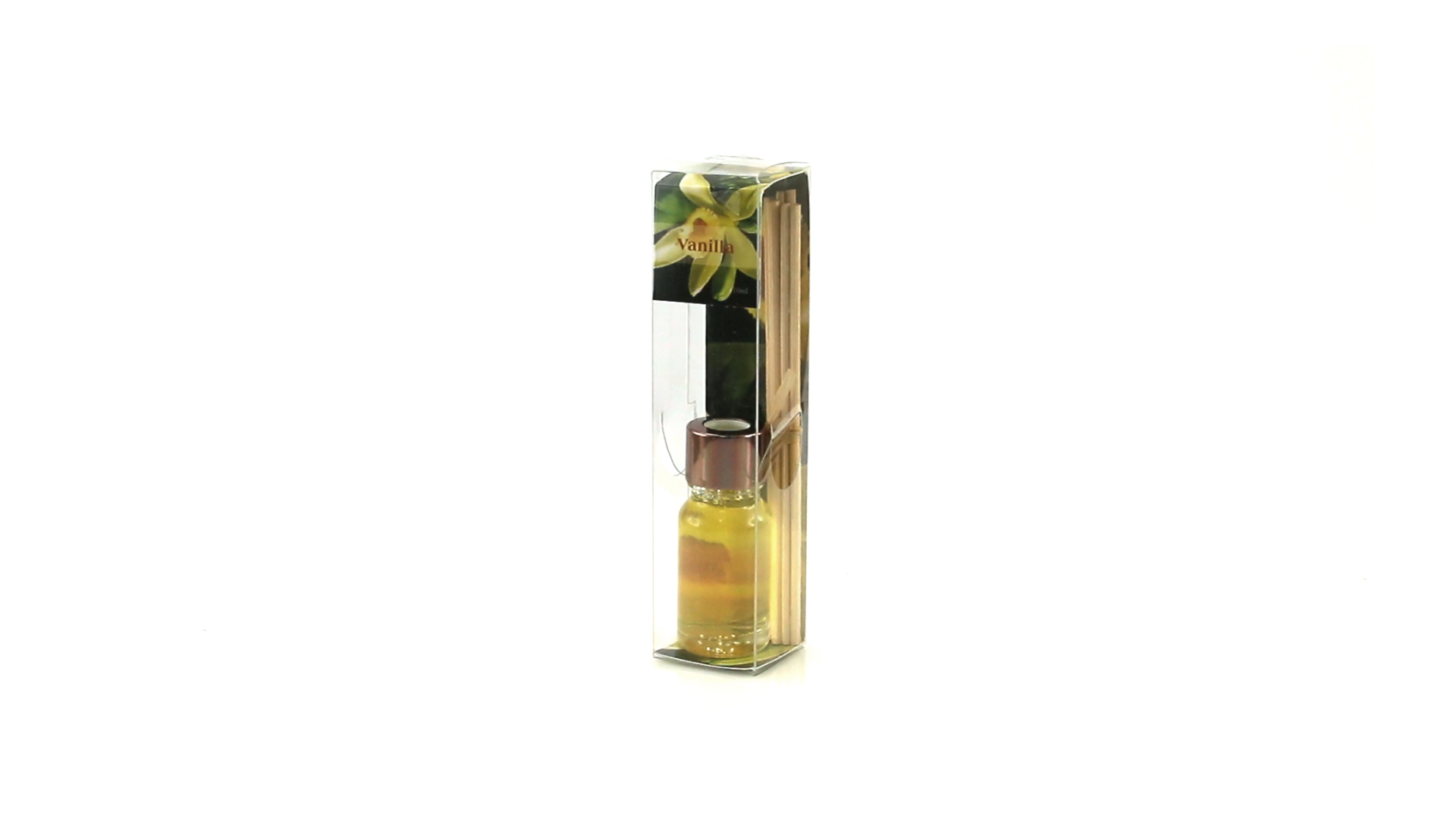 Lufterfrischer mit Holzstäbchen. Glas mit 10 ml Aromaflüssigkeit mit Vanille- oder Ozeanduft. Präsentiert in einer individuellen PVC-Box.