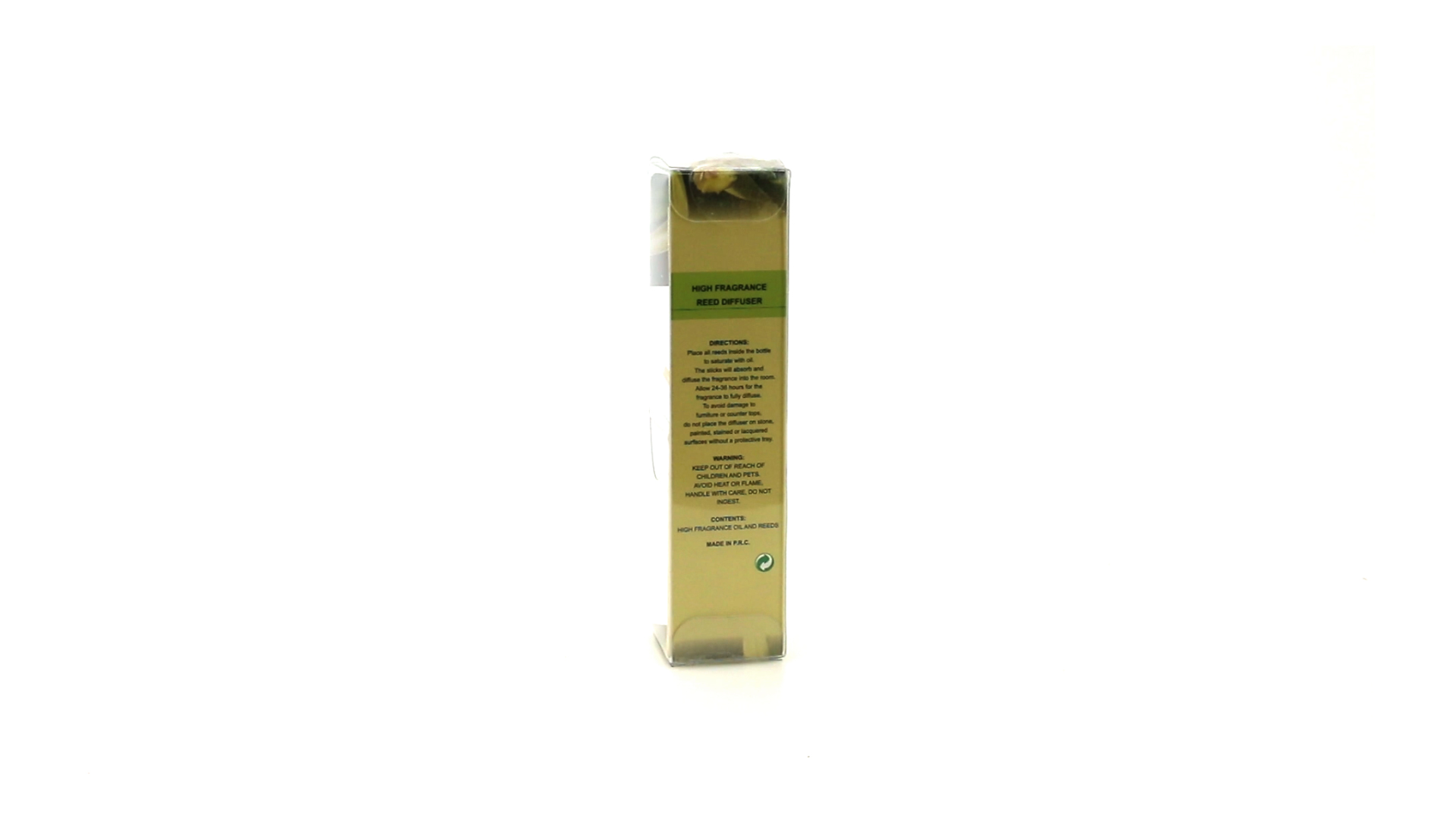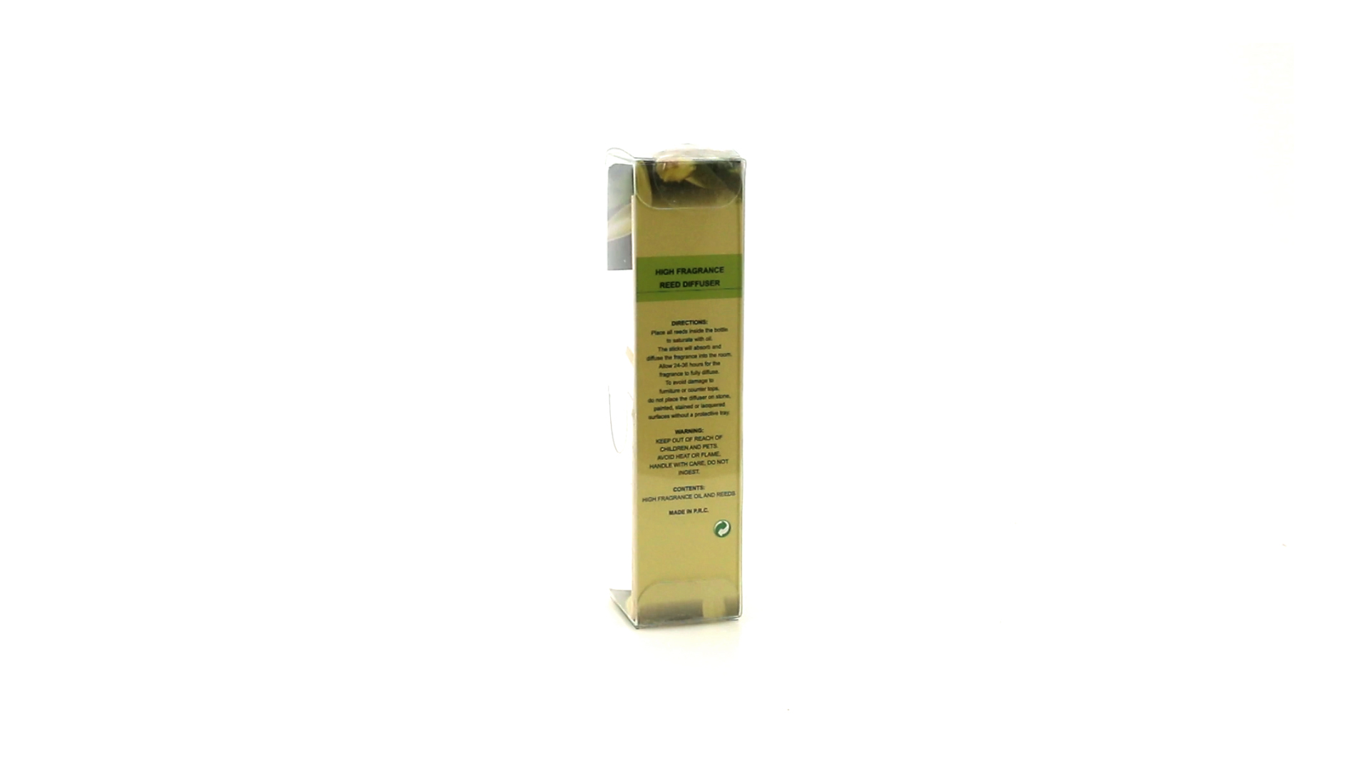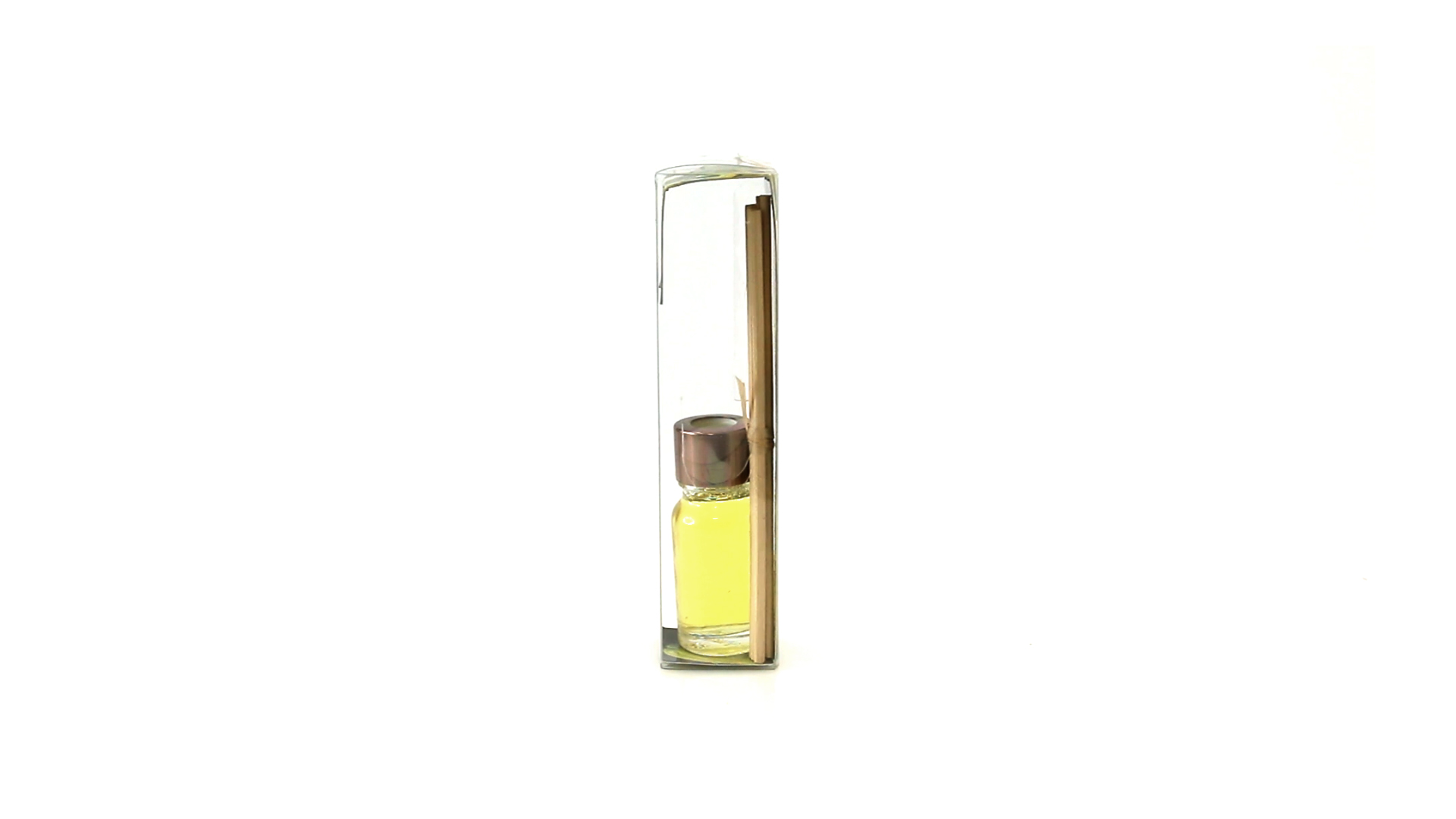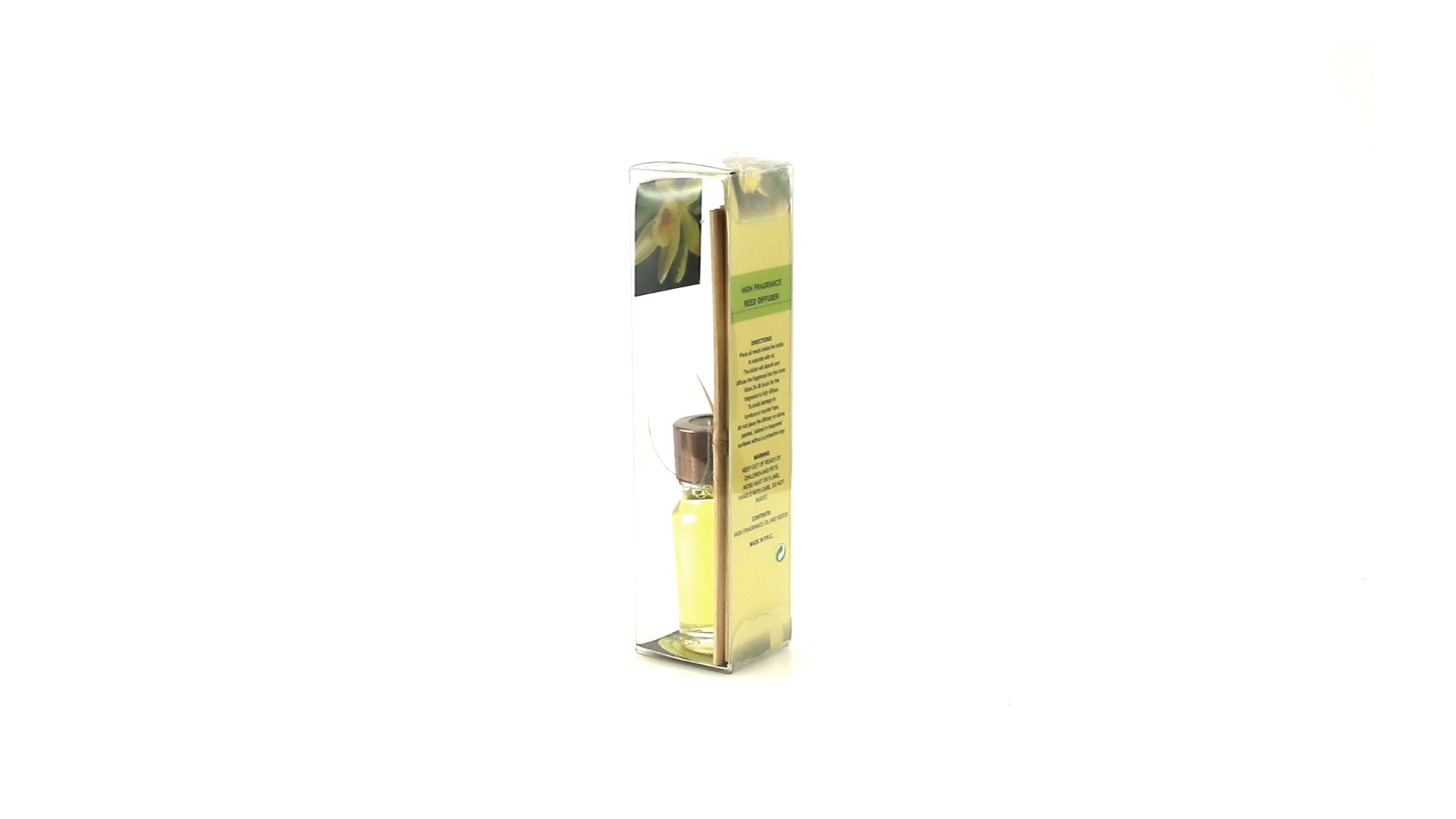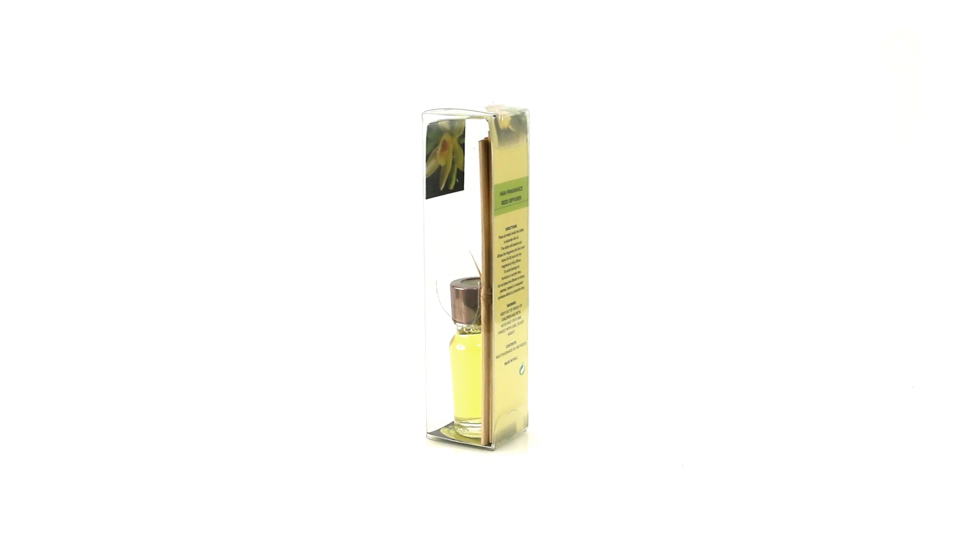 Lufterfrischer mit Holzstäbchen. Glas mit 10 ml Aromaflüssigkeit mit Vanille- oder Ozeanduft. Präsentiert in einer individuellen PVC-Box.