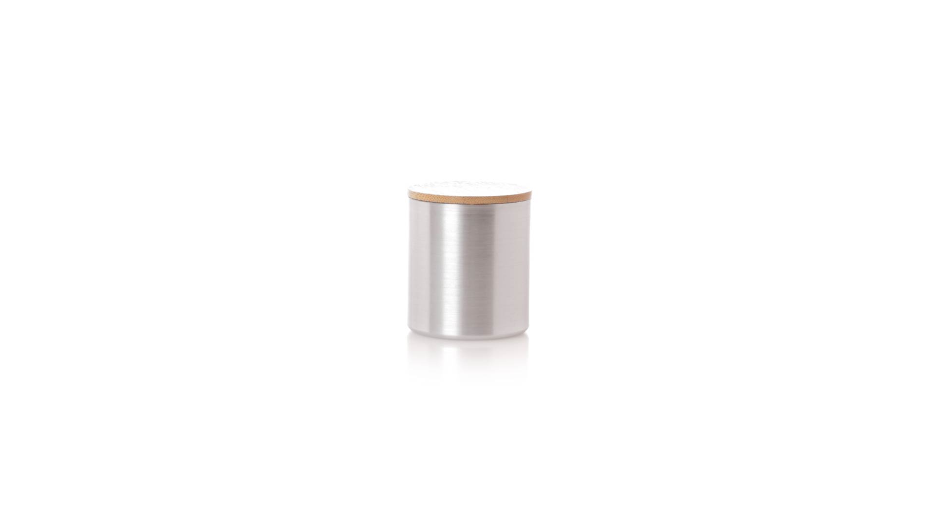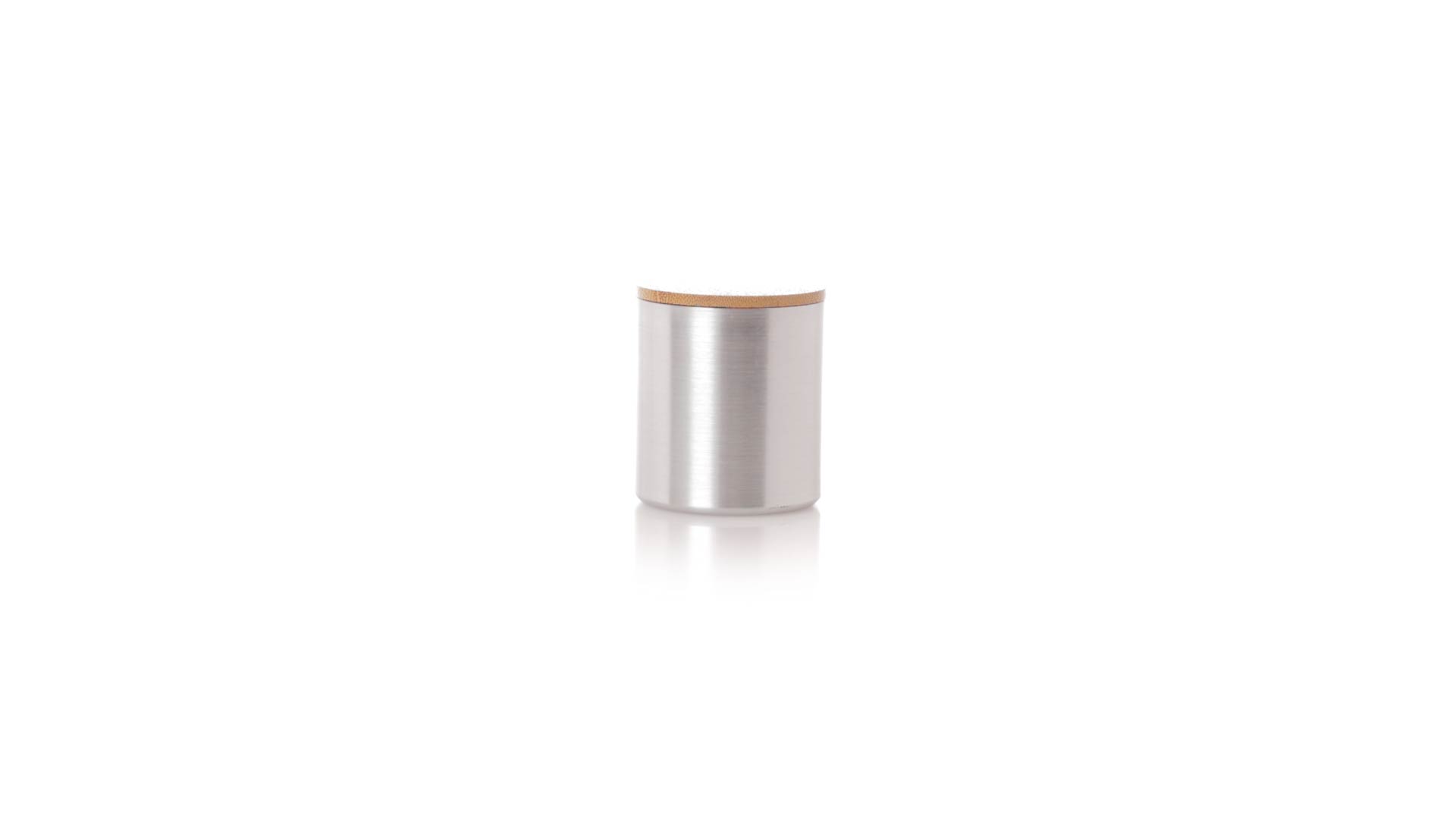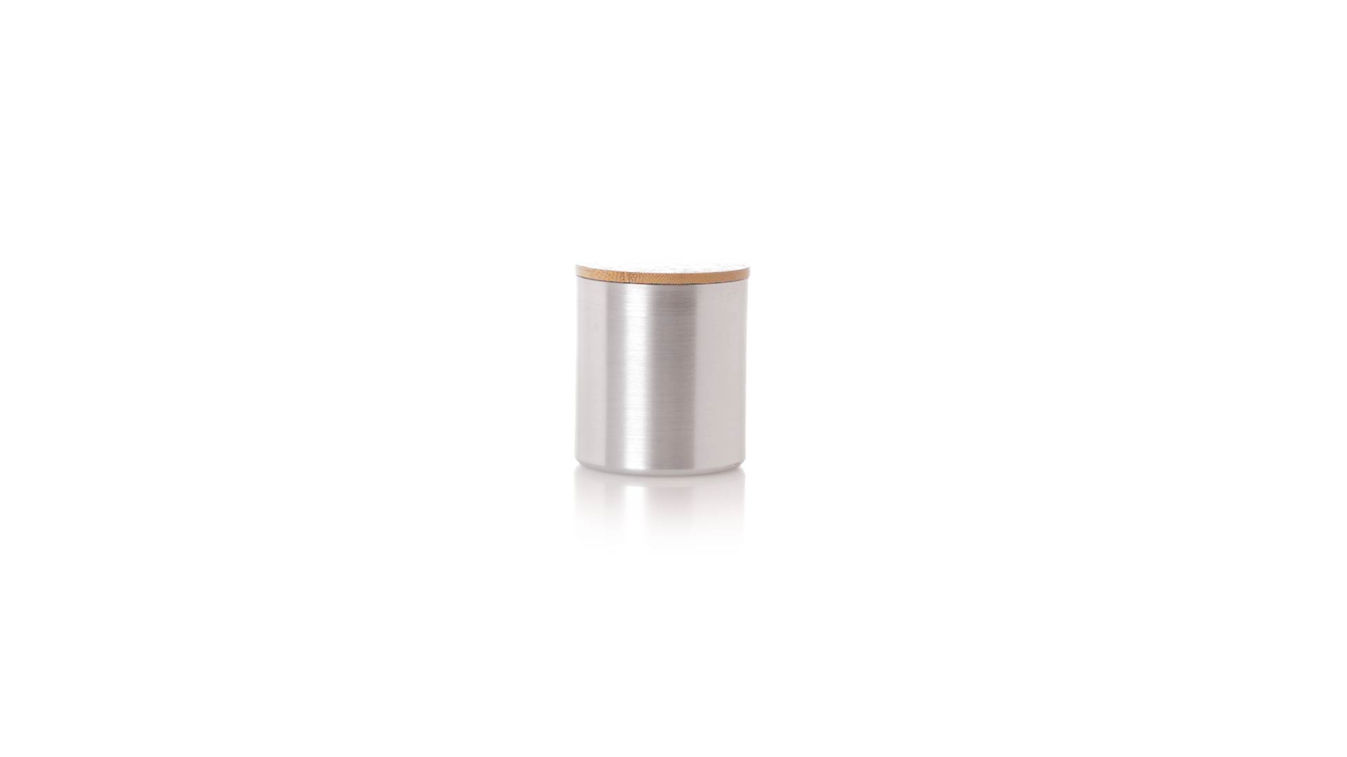 Vanille-Duftkerze. Präsentiert in einem Metallgefäss mit Bambusdeckel. Glas in vielen Farben erhältlich, mit Metalloberfläche. Einzeln präsentiert in einer Kraft-Design-Box. Materialien wie Bambus fördern die Verwendung natürlicher Rohstoffe und reduzieren den Schadstoffausstoss.