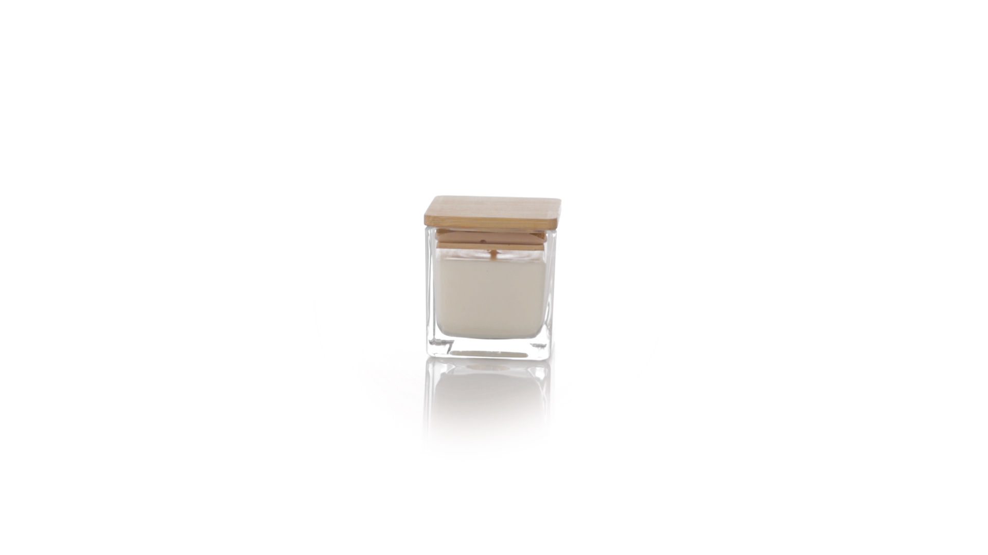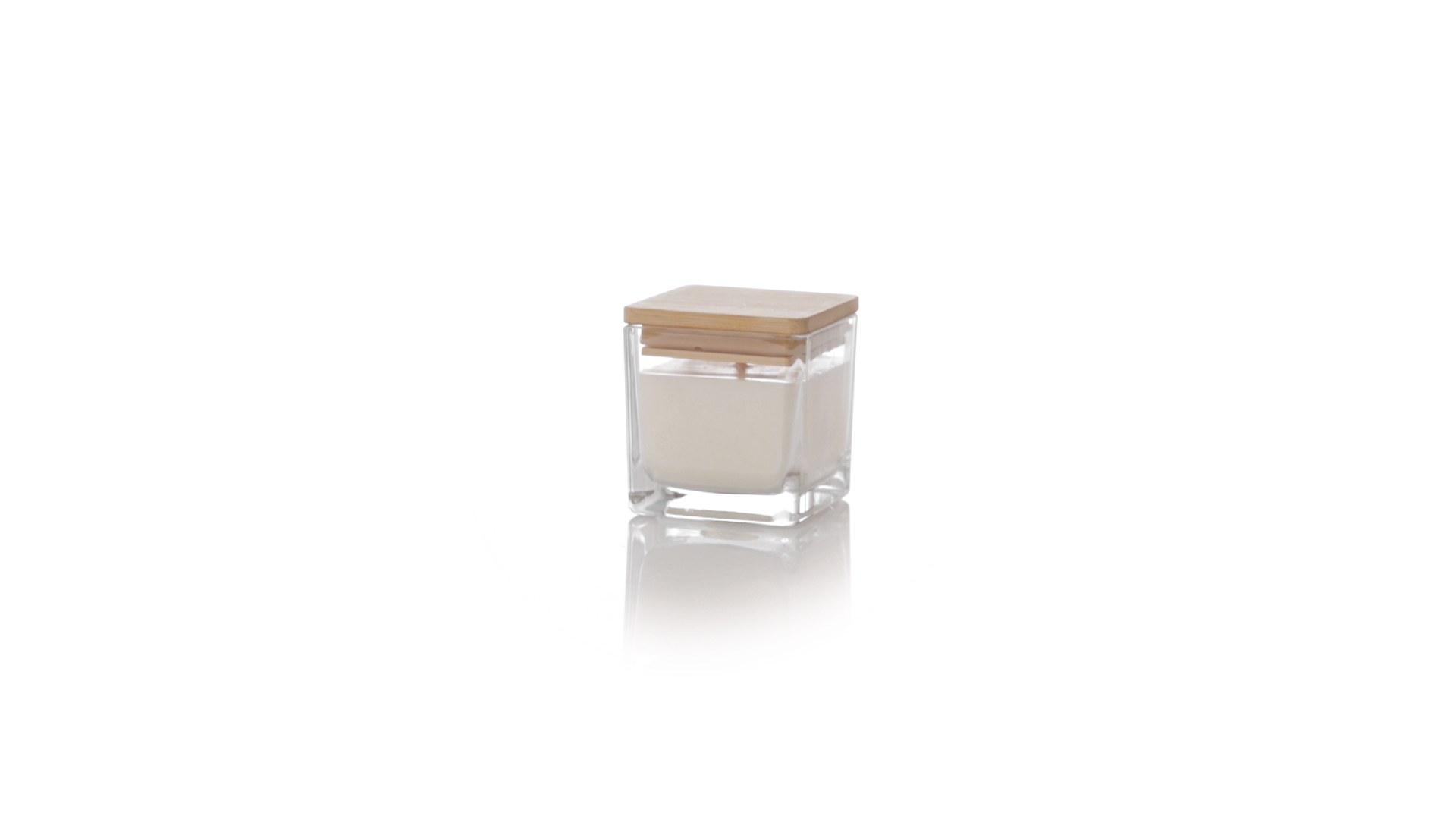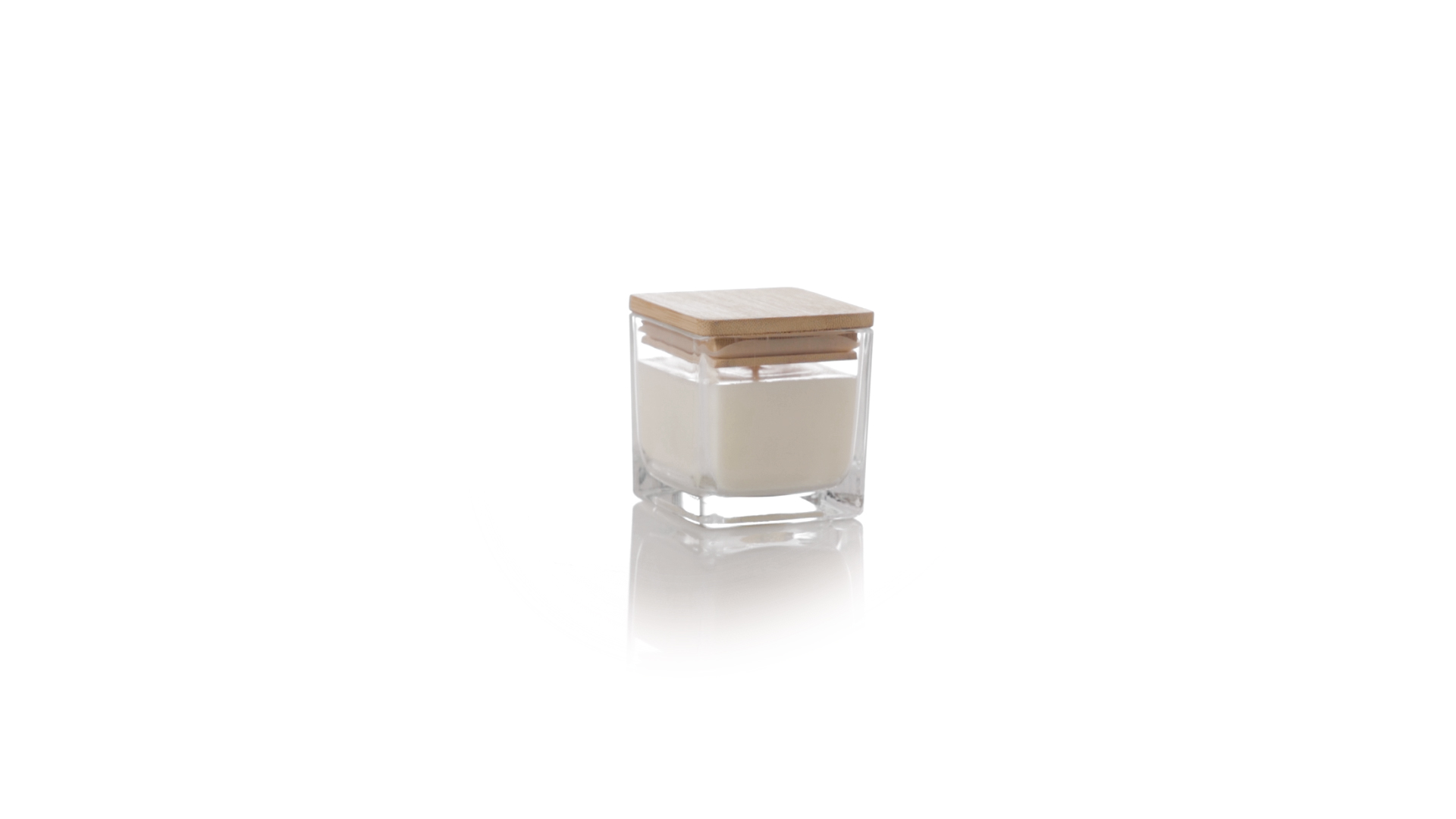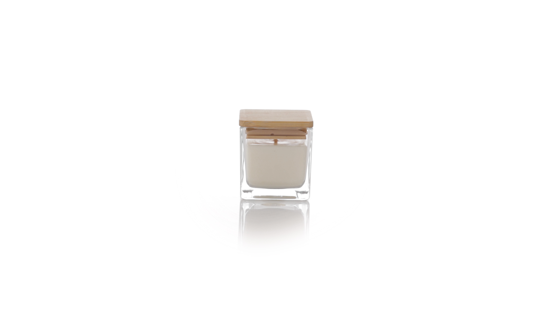 Aromatische Kerze im transparenten Glasbehälter, quadratische Form mit Bambusdeckel. In verschiedenen Duftvarianten erhältlich: