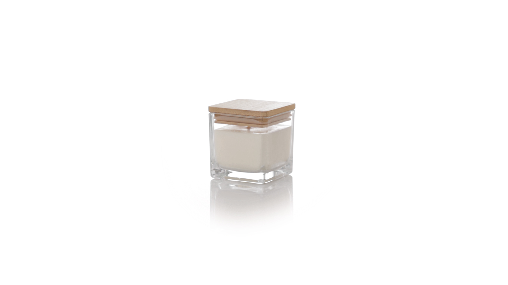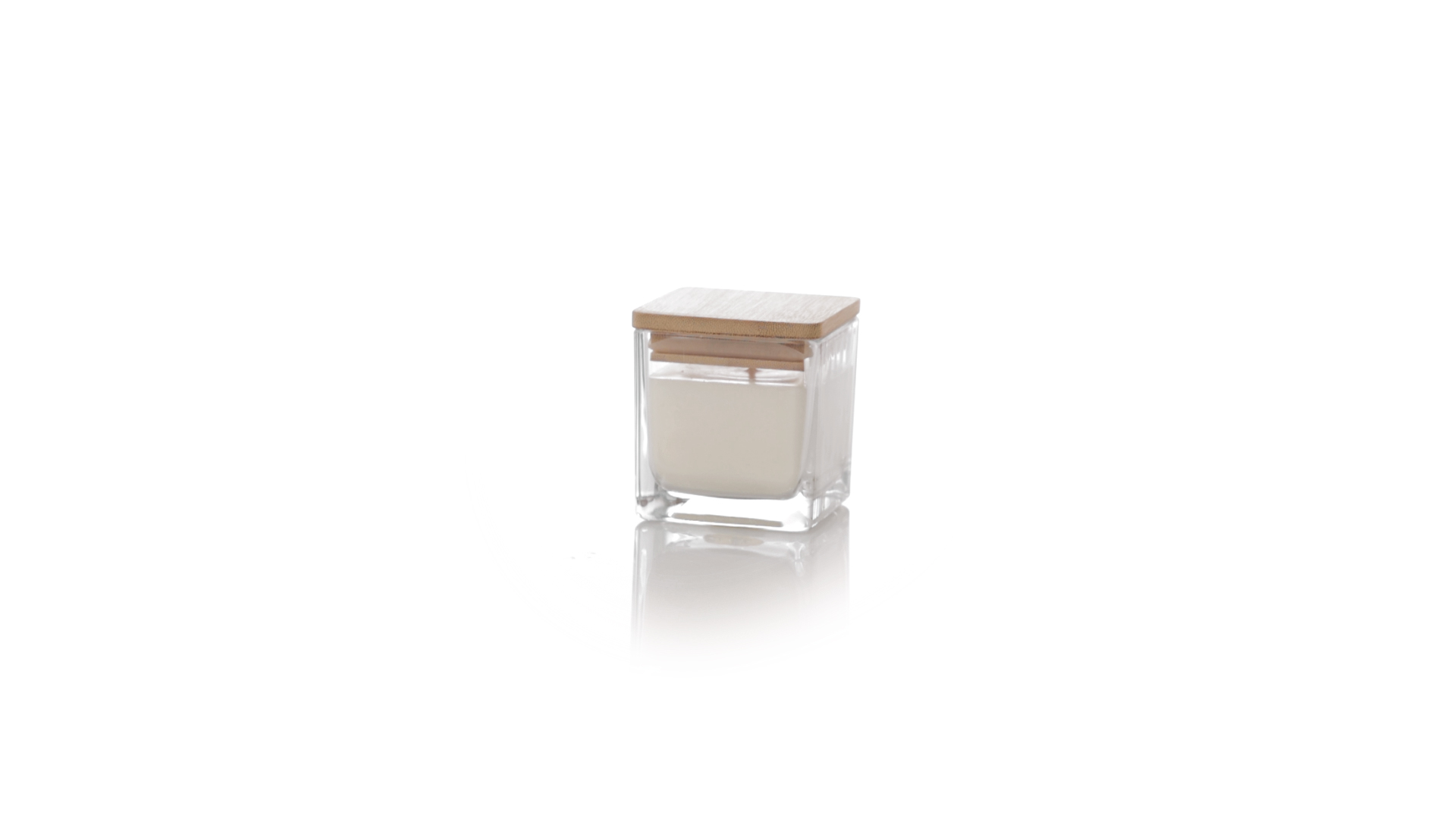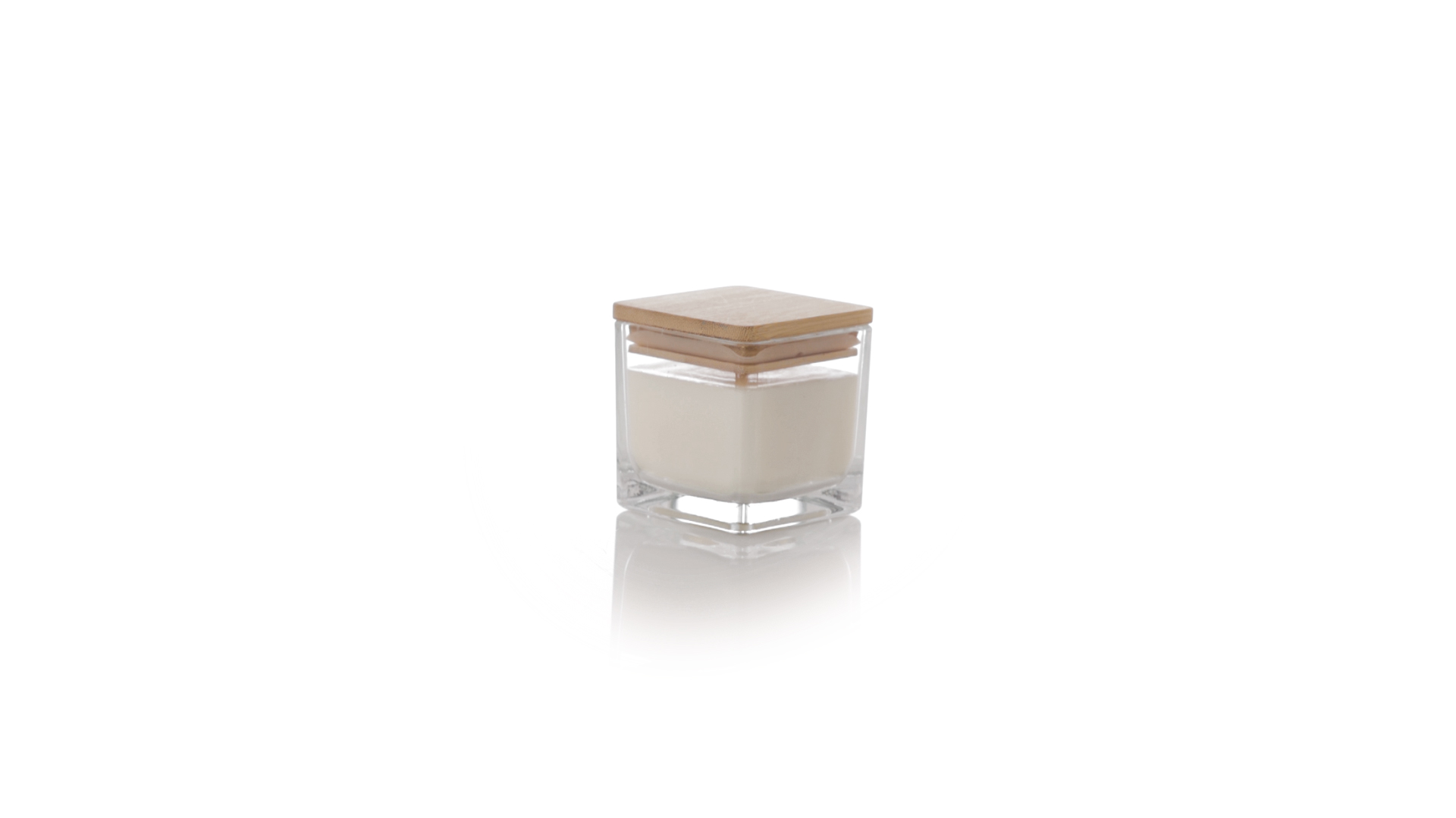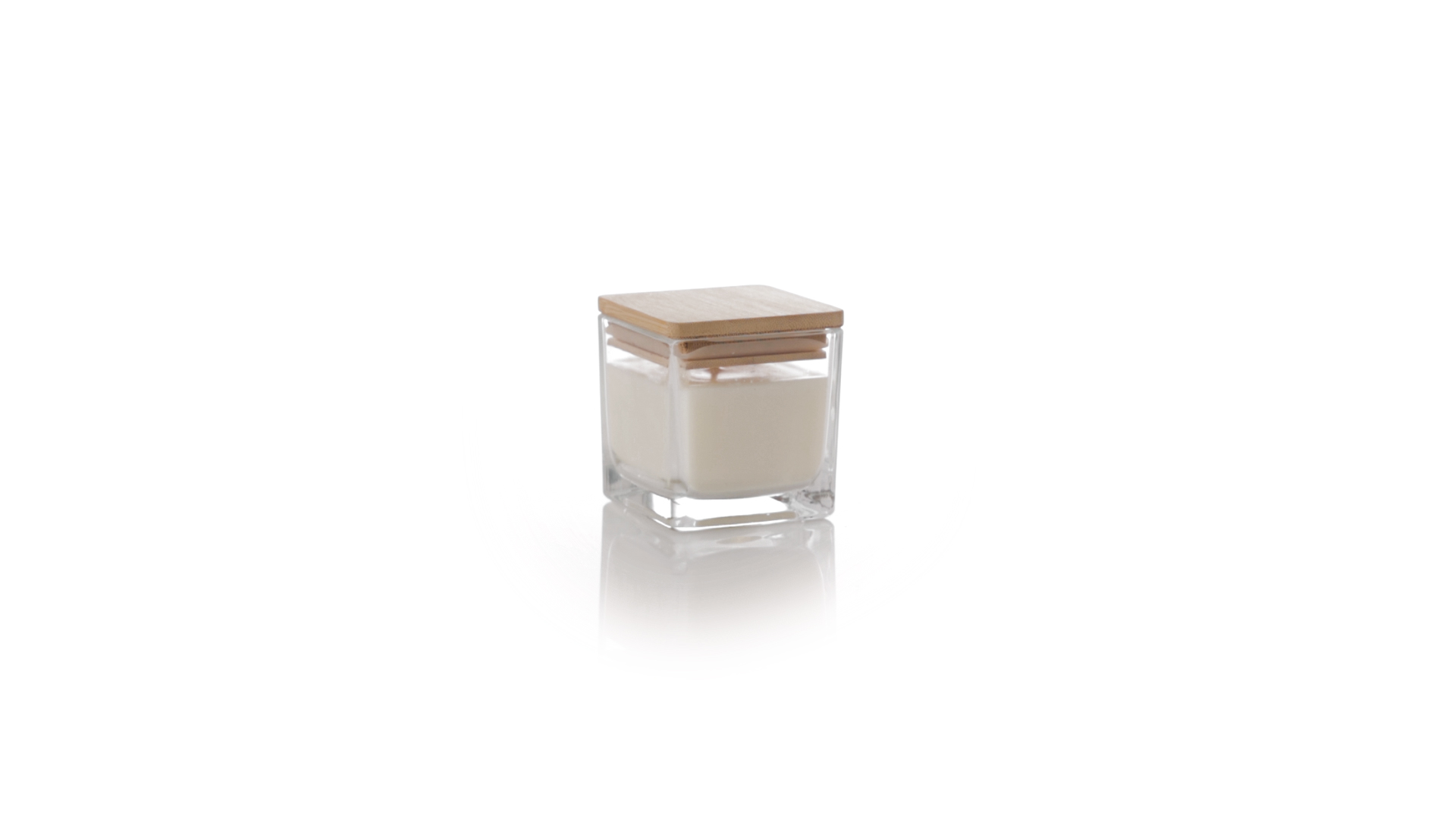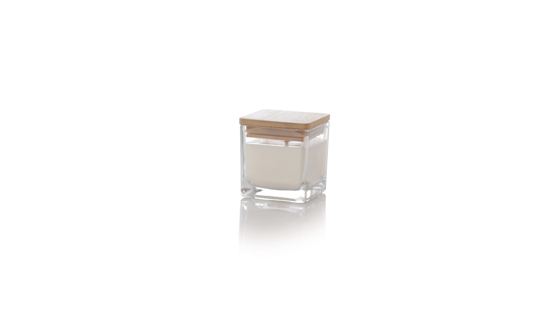 Aromatische Kerze im transparenten Glasbehälter, quadratische Form mit Bambusdeckel. In verschiedenen Duftvarianten erhältlich: