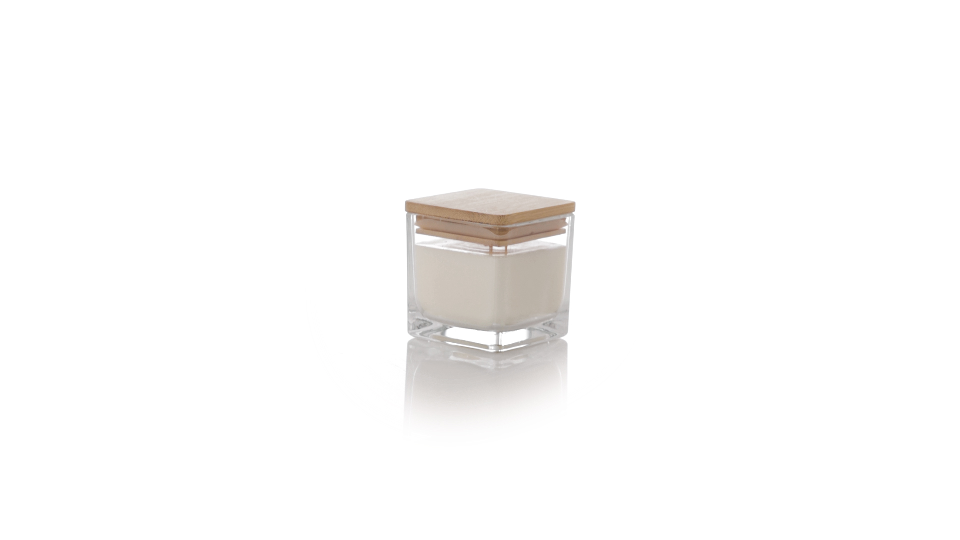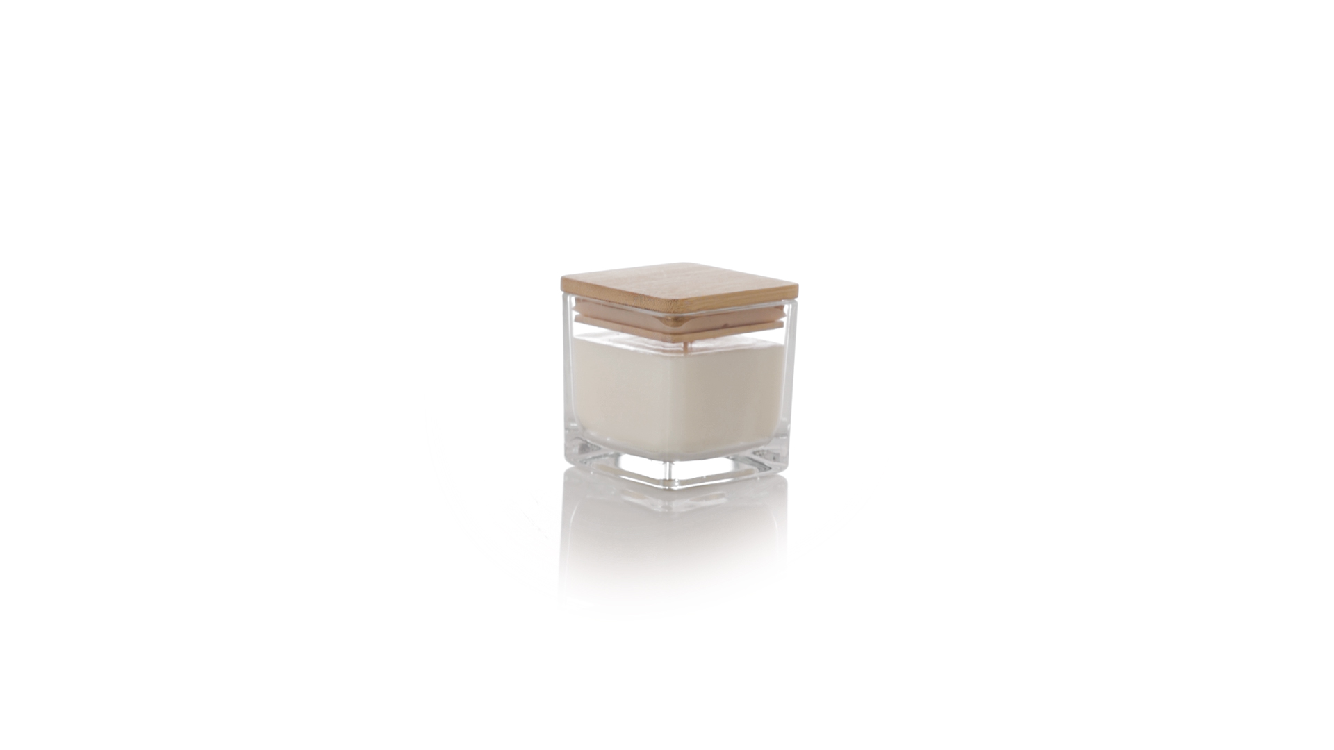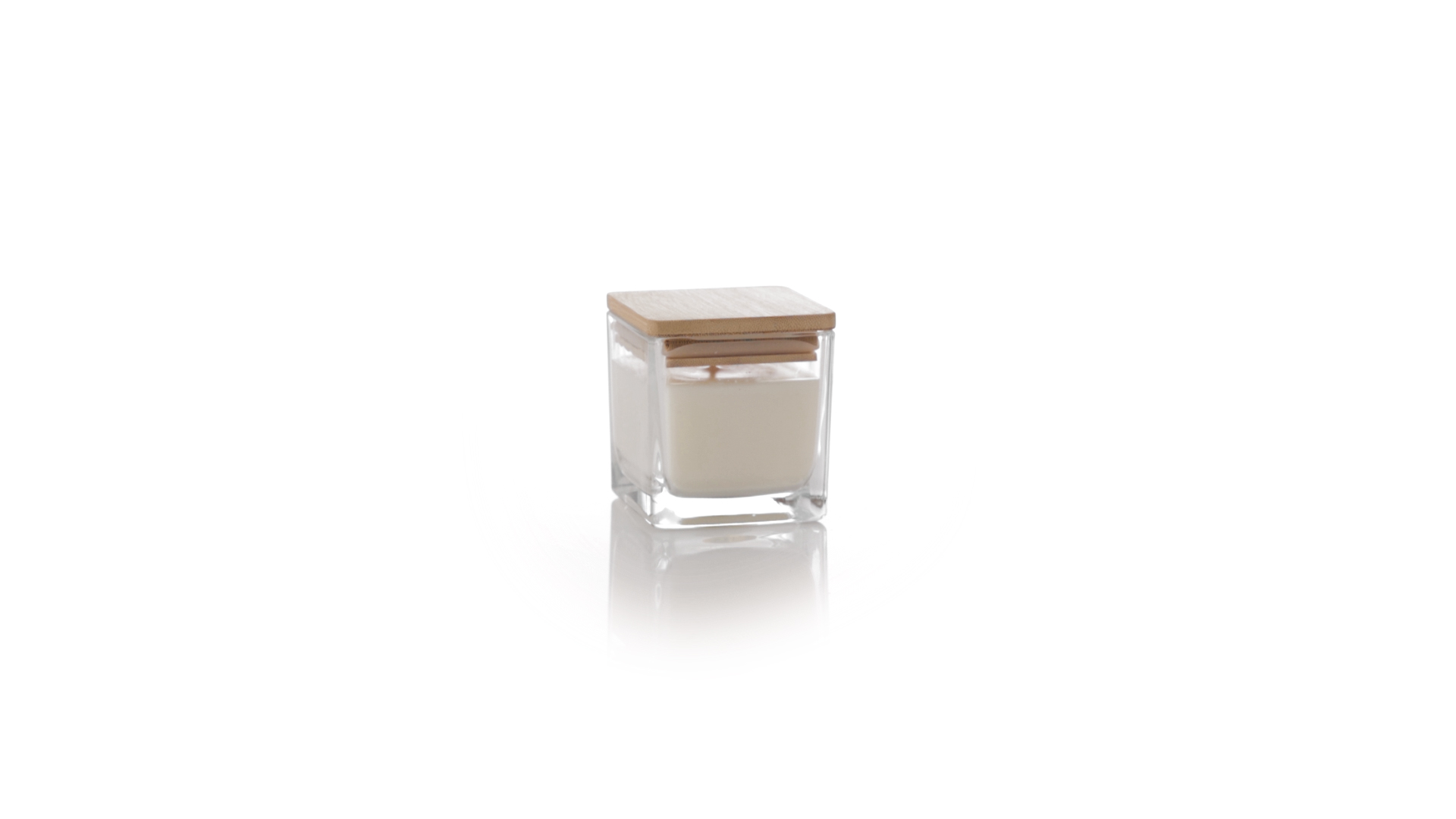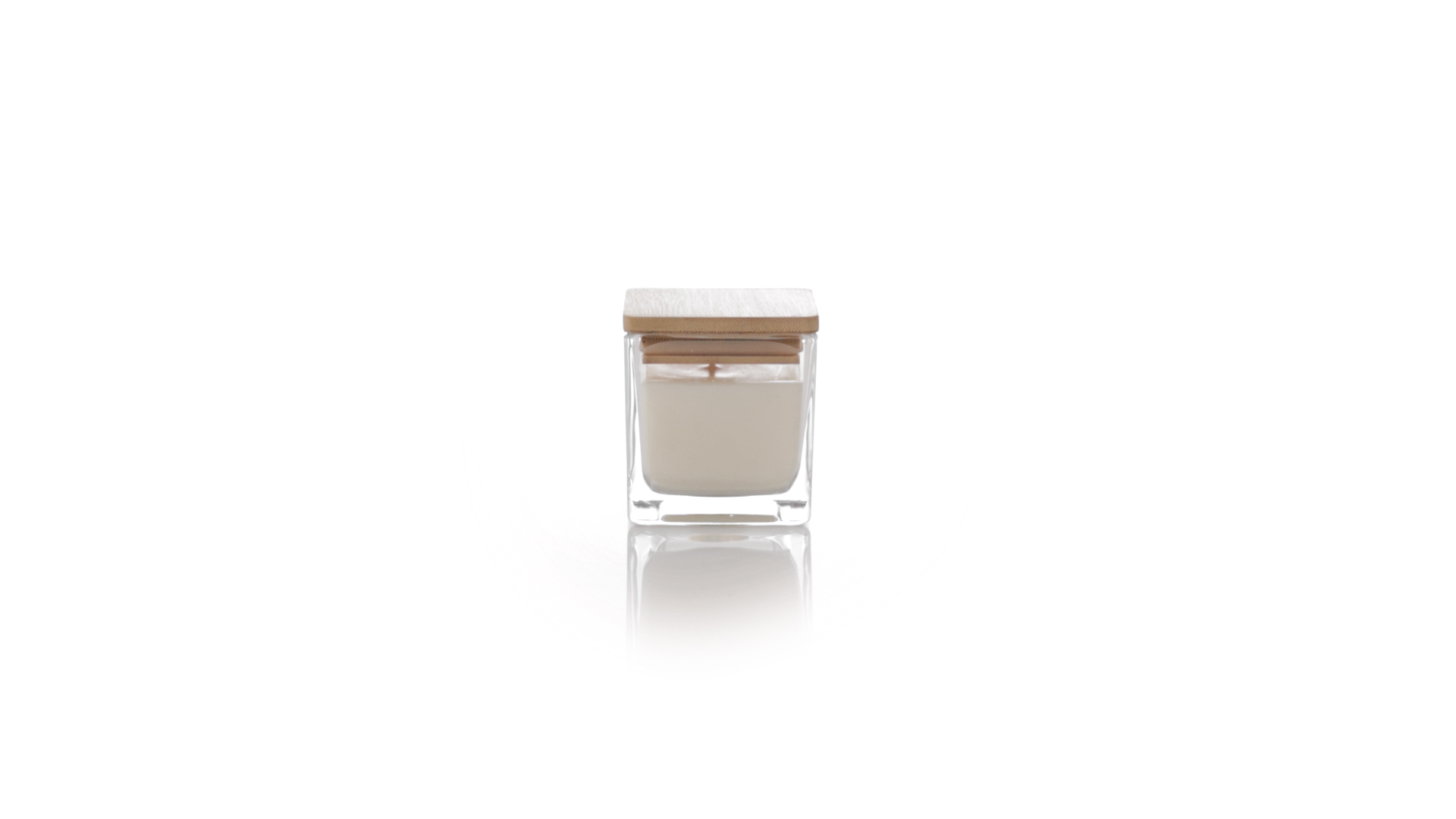Aromatische Kerze im transparenten Glasbehälter, quadratische Form mit Bambusdeckel. In verschiedenen Duftvarianten erhältlich: