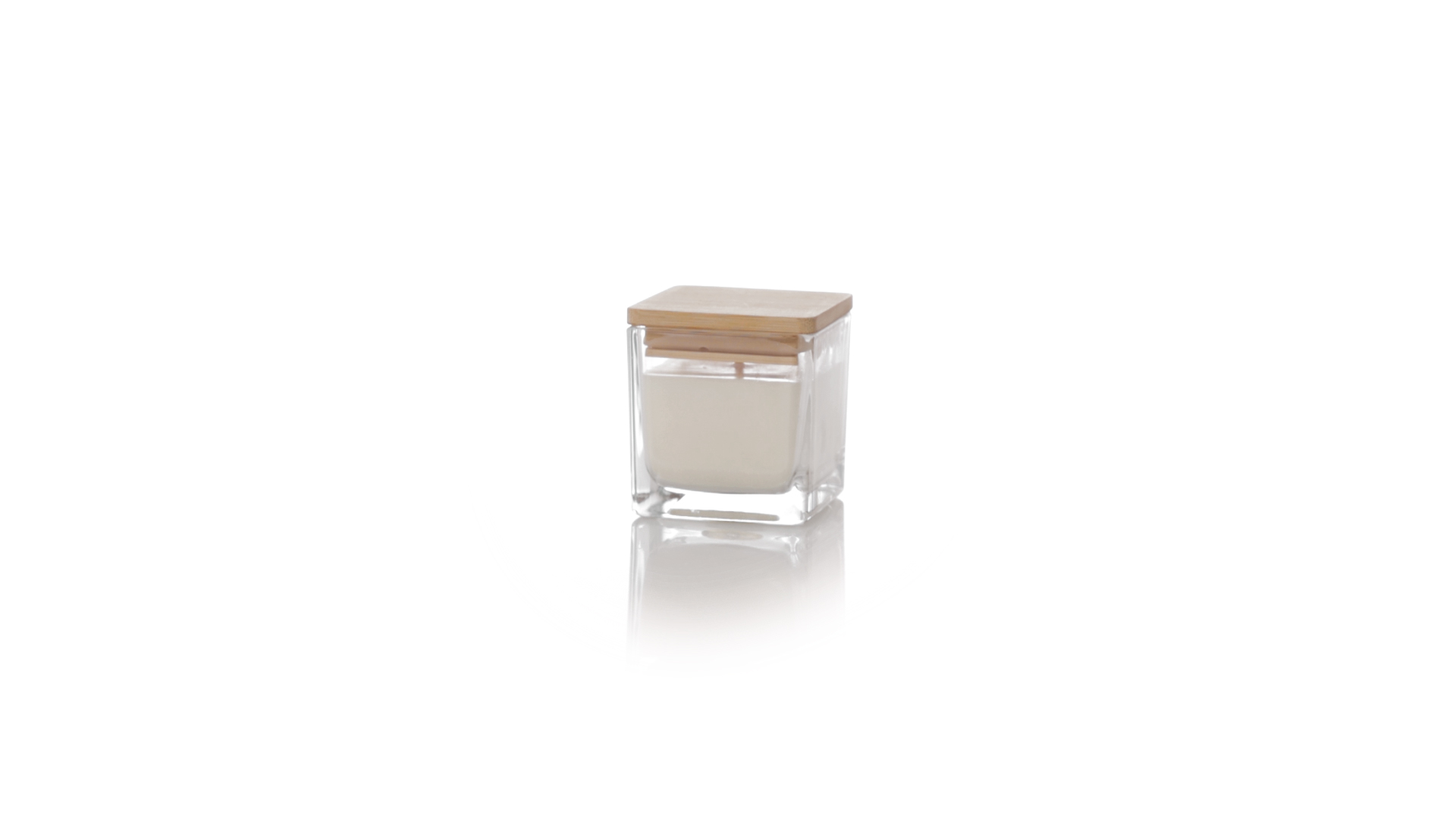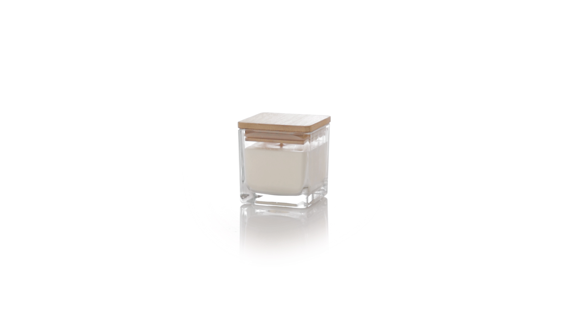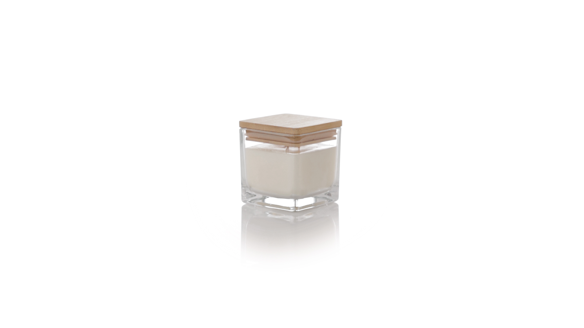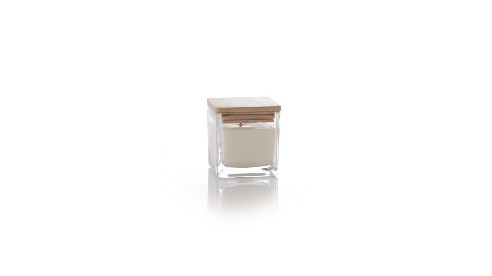Aromatische Kerze im transparenten Glasbehälter, quadratische Form mit Bambusdeckel. In verschiedenen Duftvarianten erhältlich: