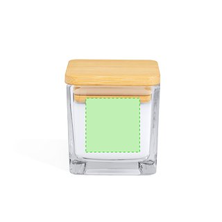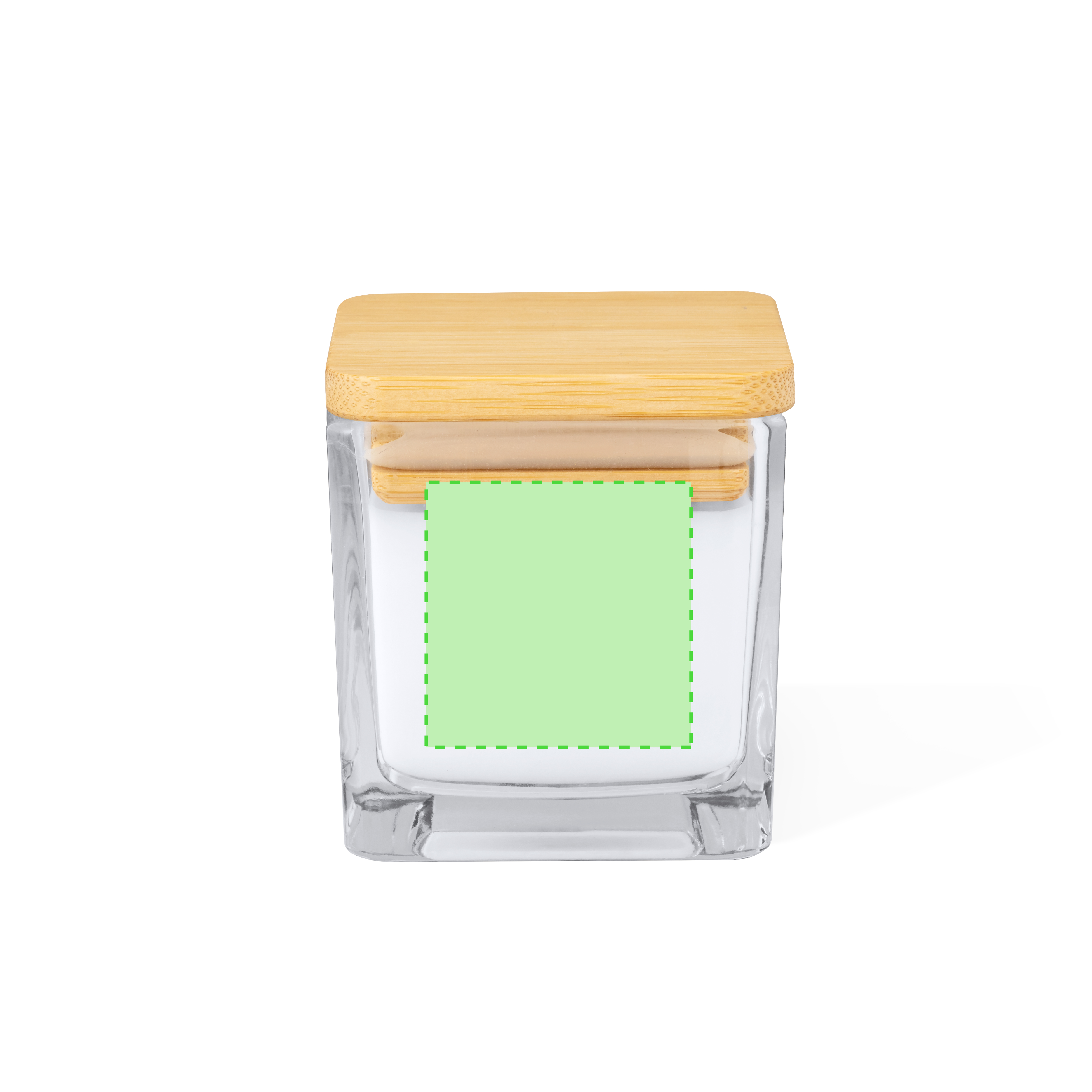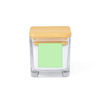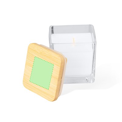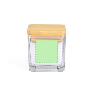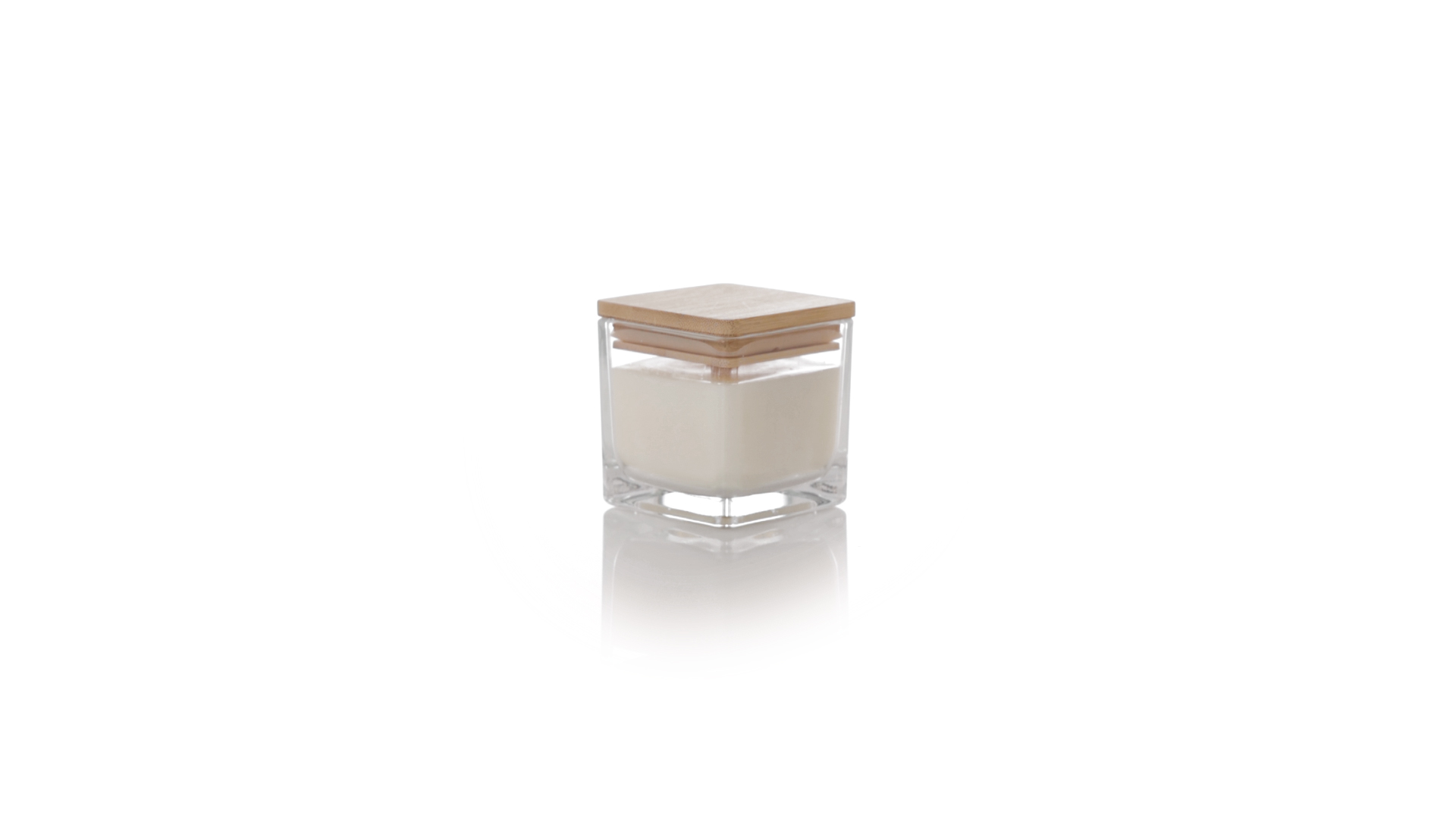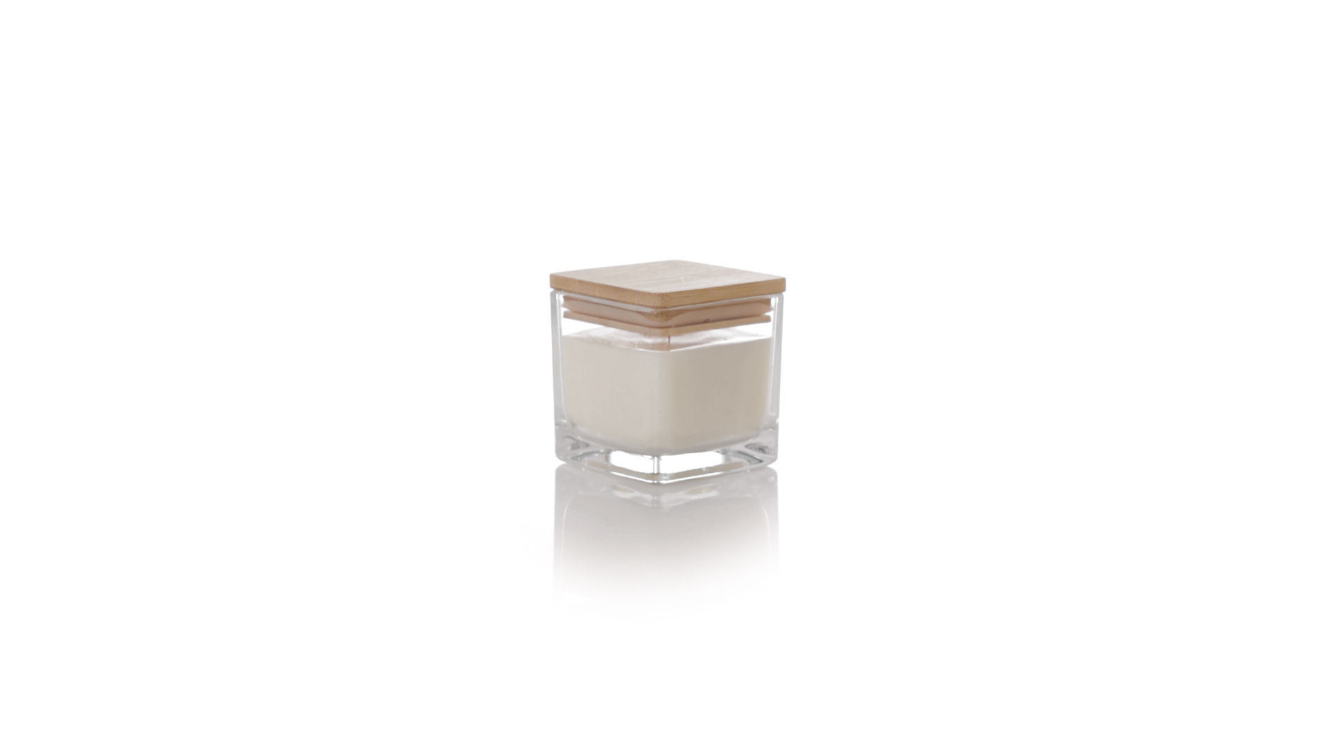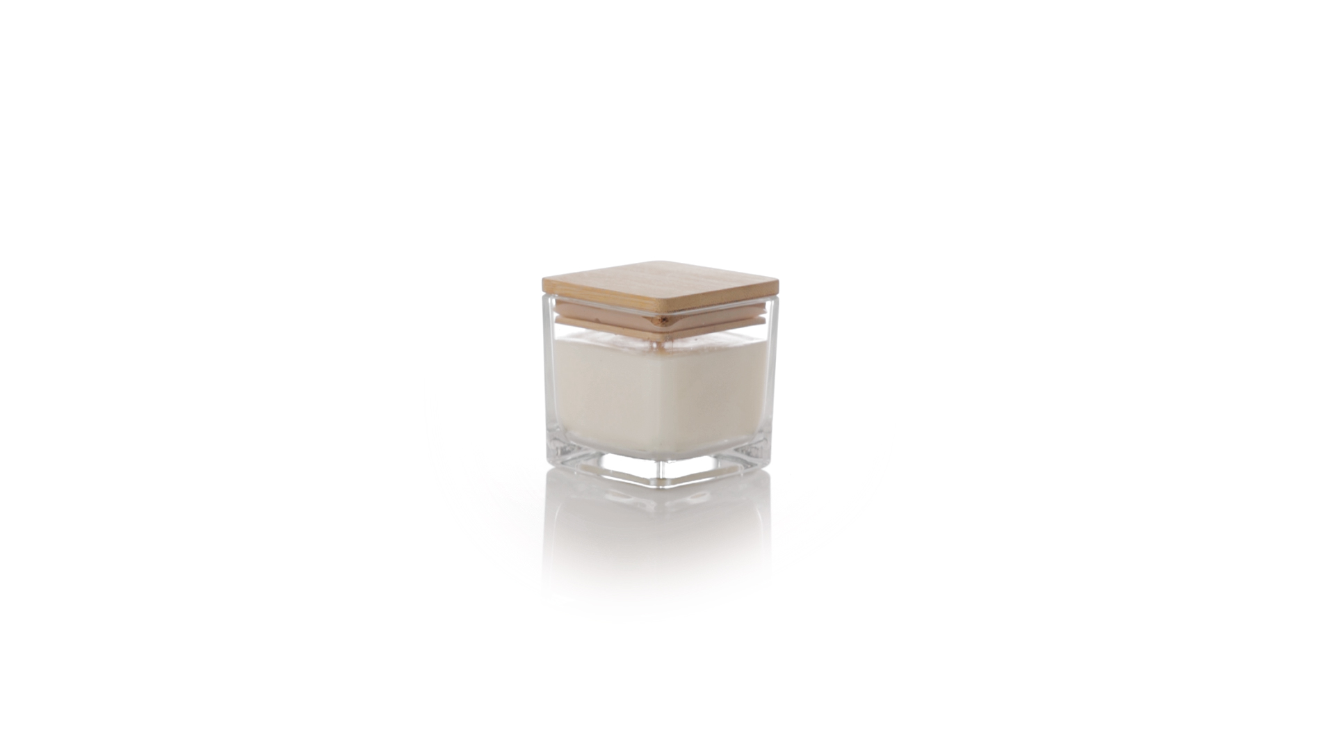 Aromatische Kerze im transparenten Glasbehälter, quadratische Form mit Bambusdeckel. In verschiedenen Duftvarianten erhältlich:
