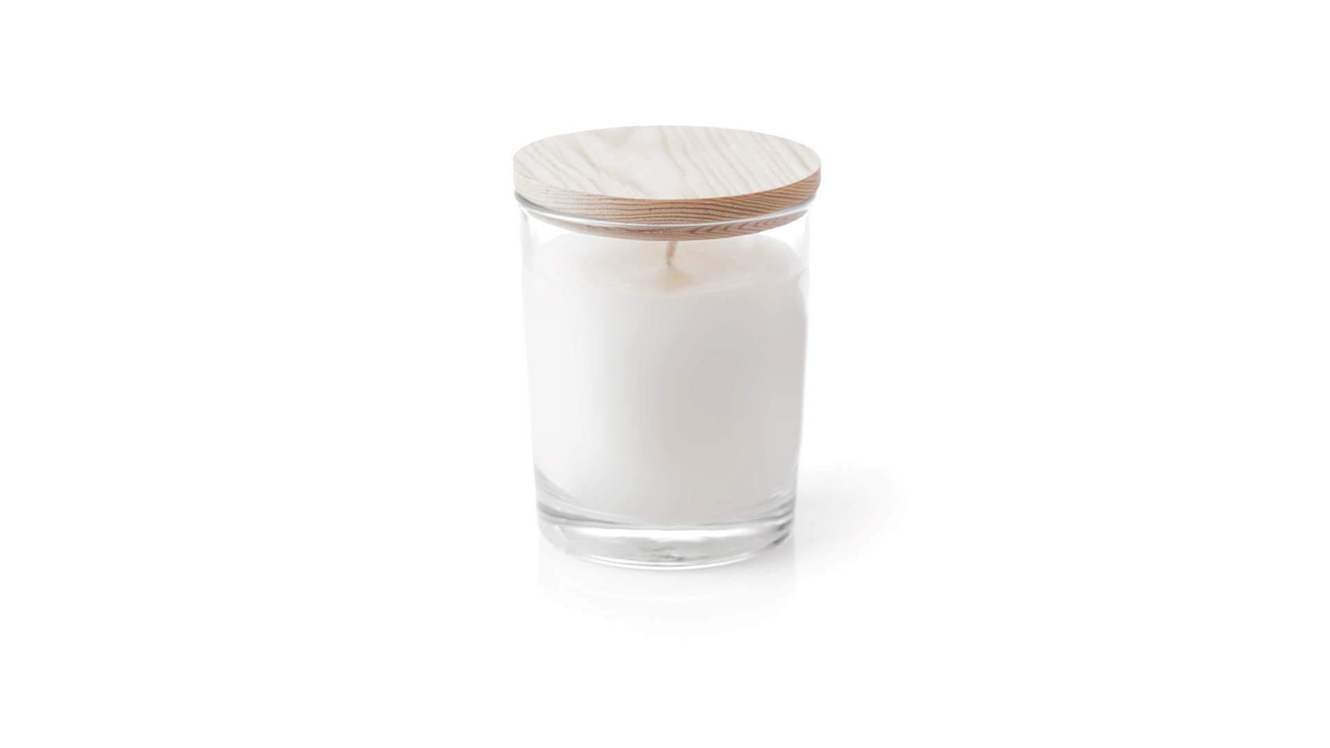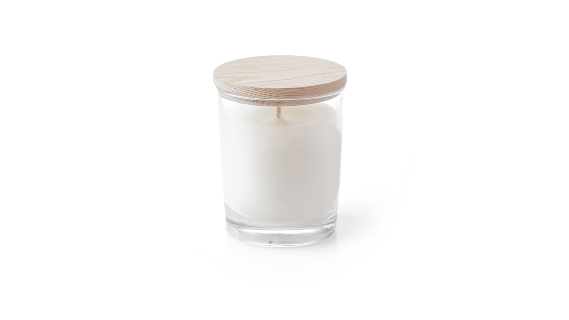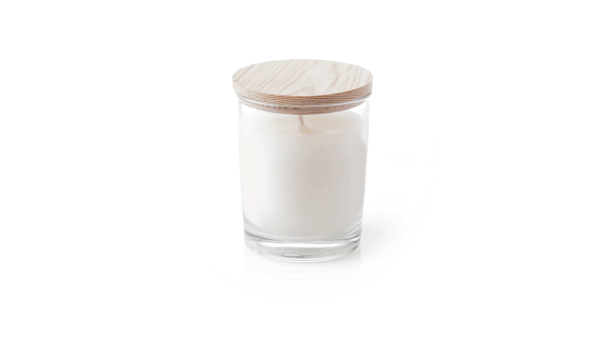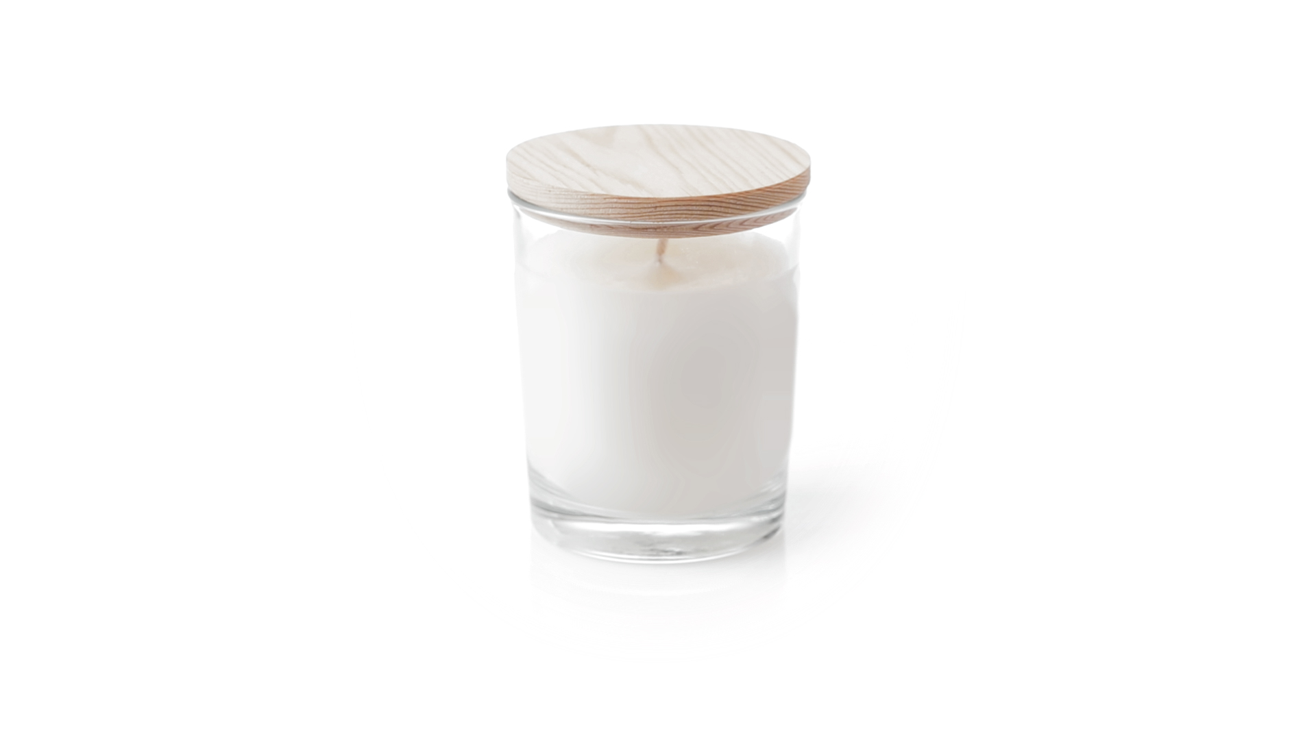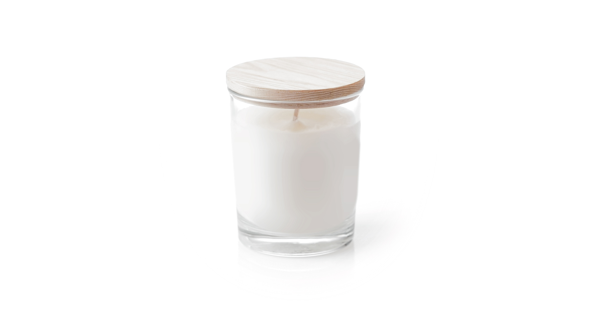 Duftkerze im Glasgefäss mit natürlichem Holzdeckel und Vanilleduft. Logo Made in Europe.