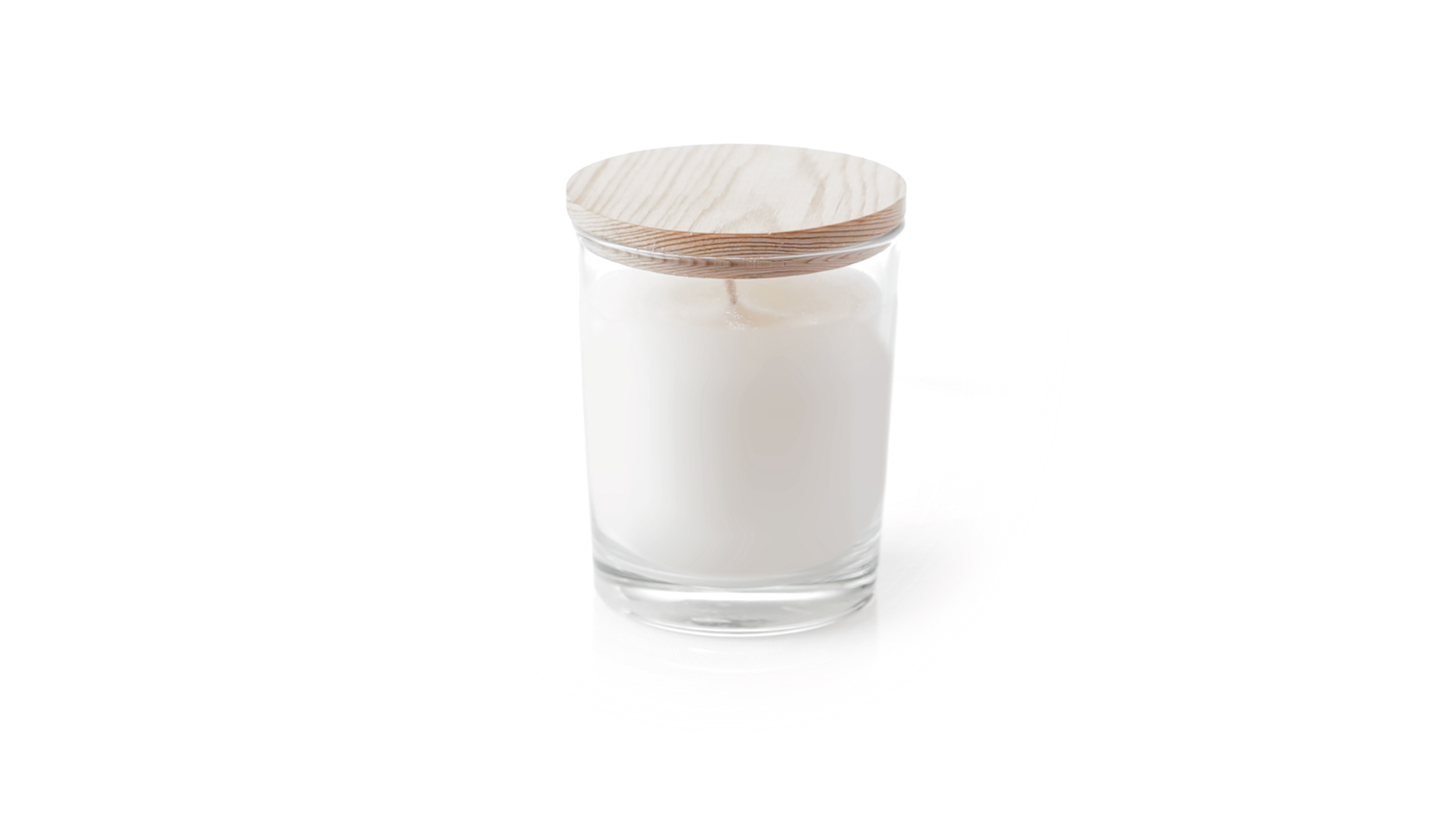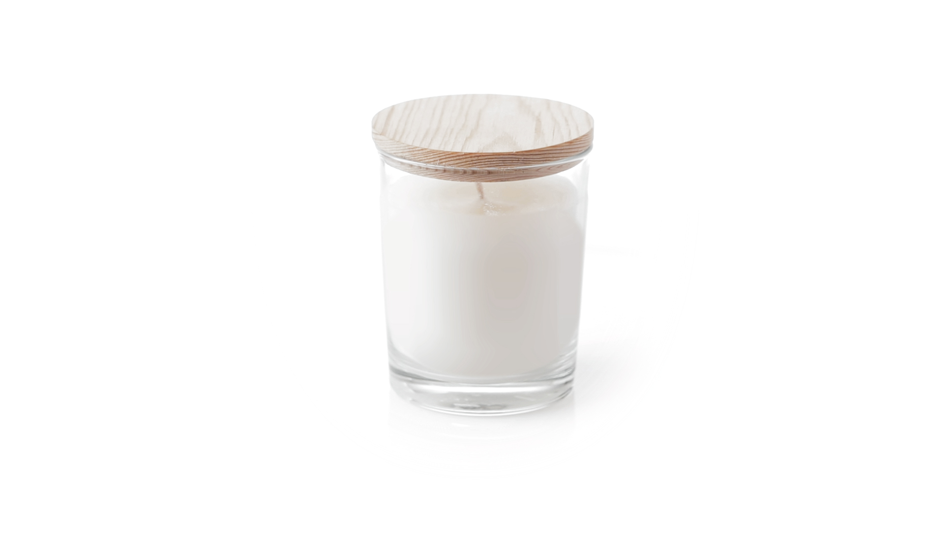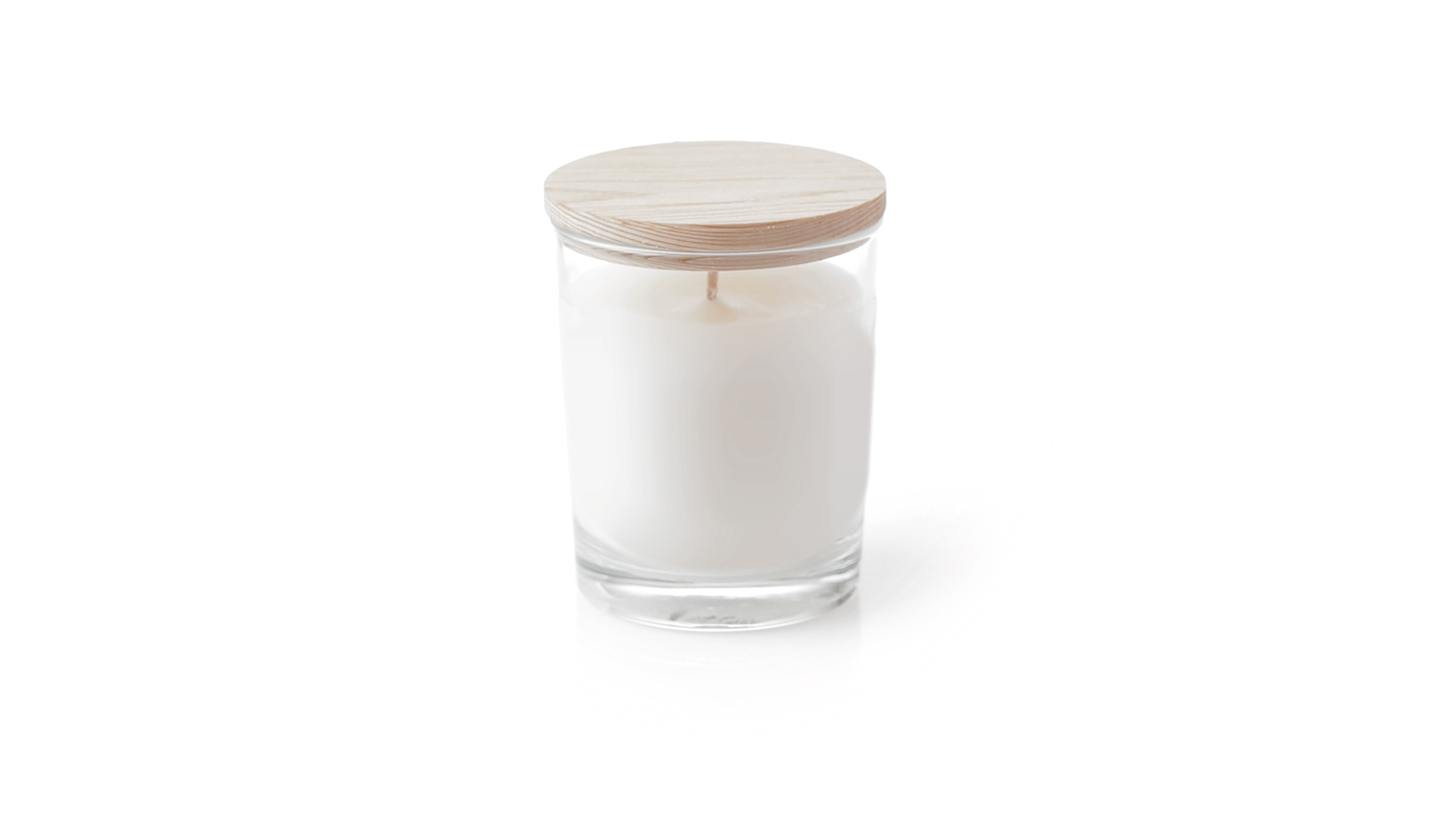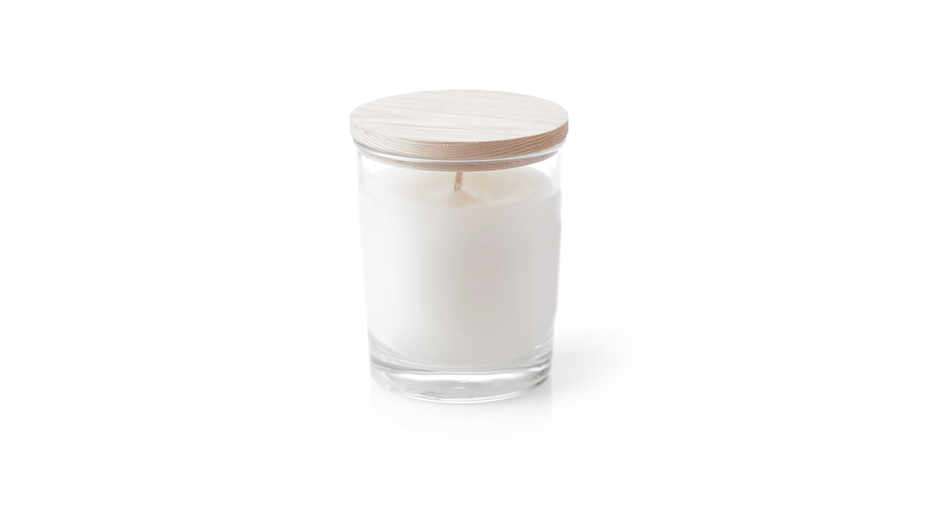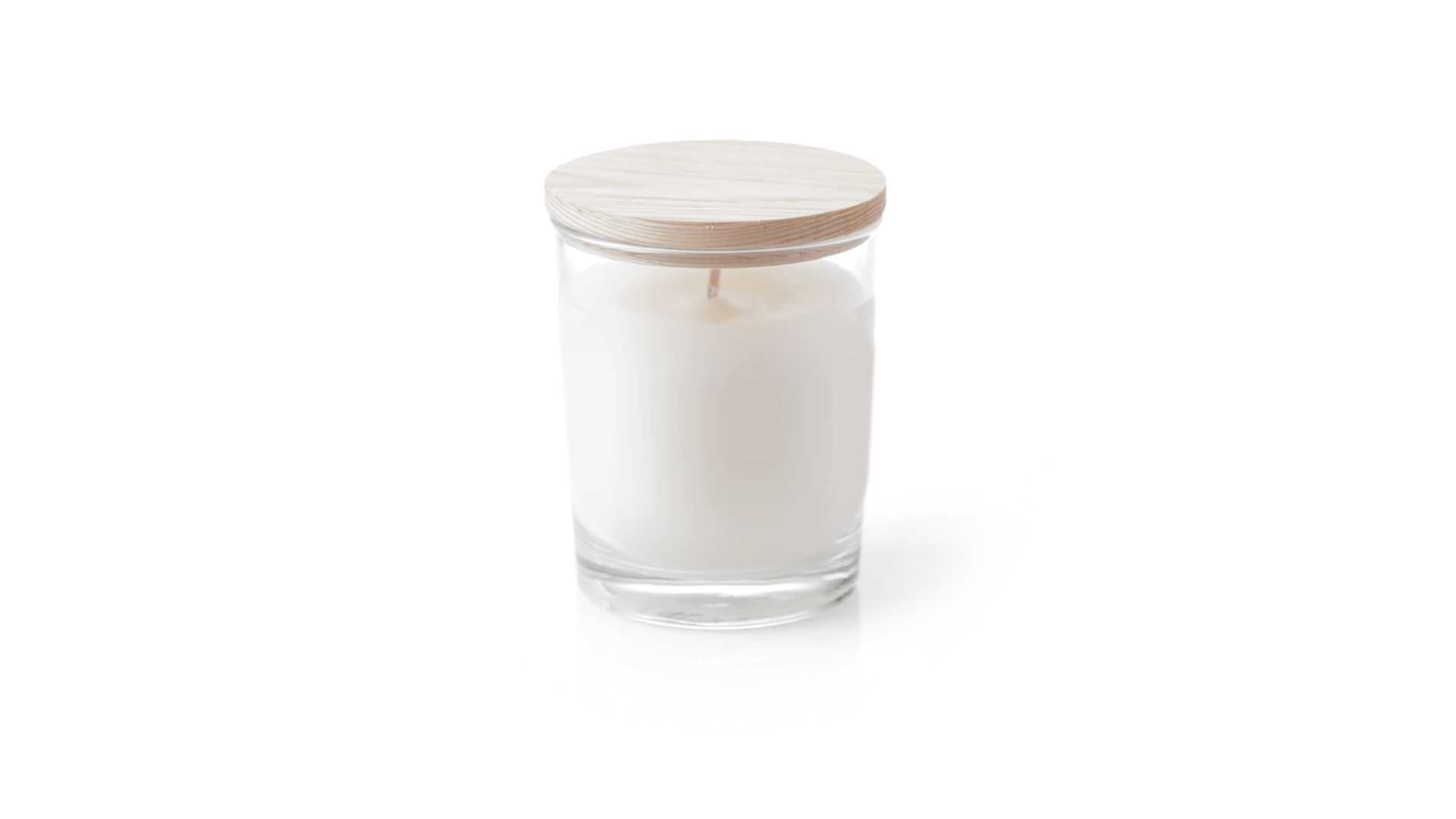 Duftkerze im Glasgefäss mit natürlichem Holzdeckel und Vanilleduft. Logo Made in Europe.