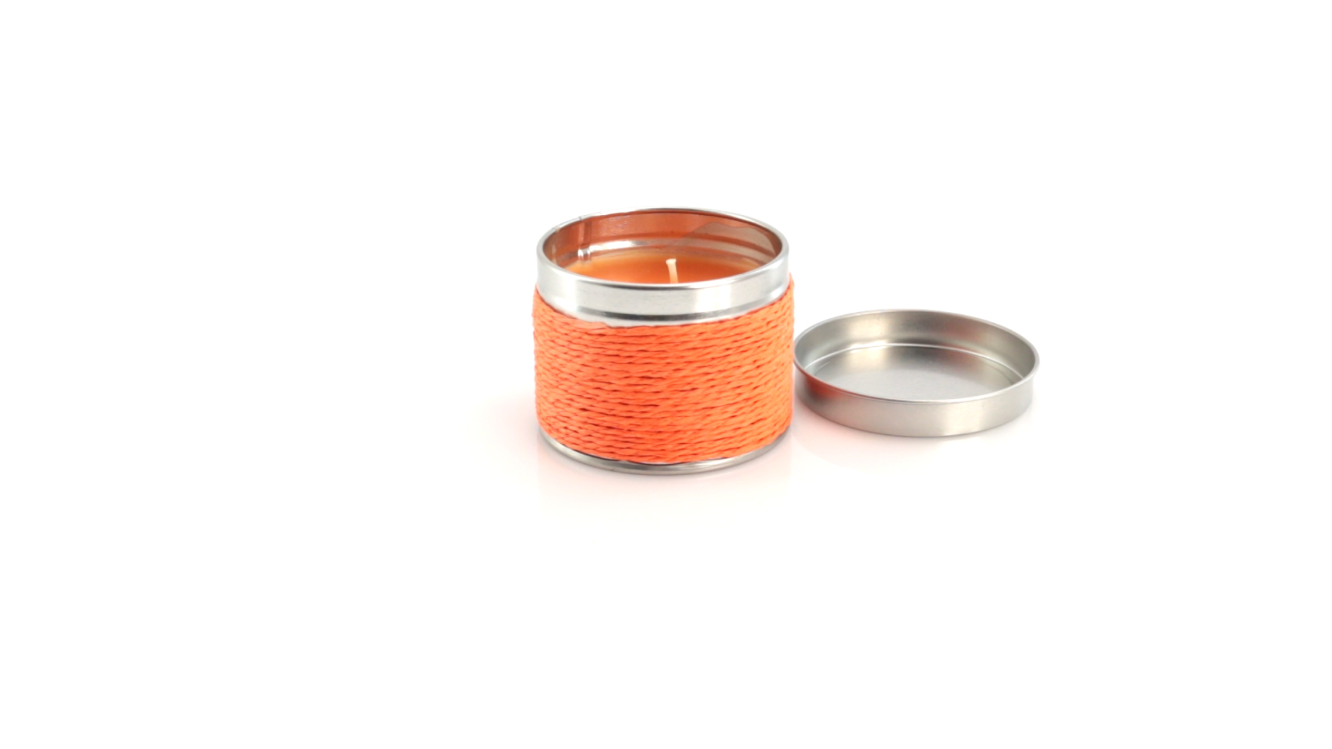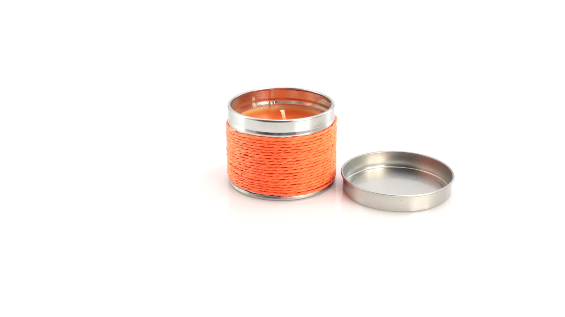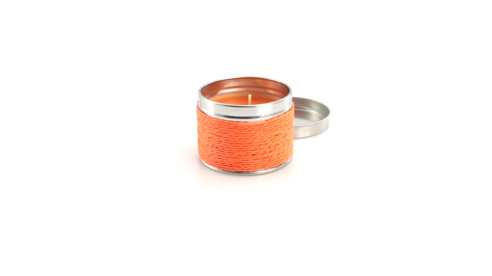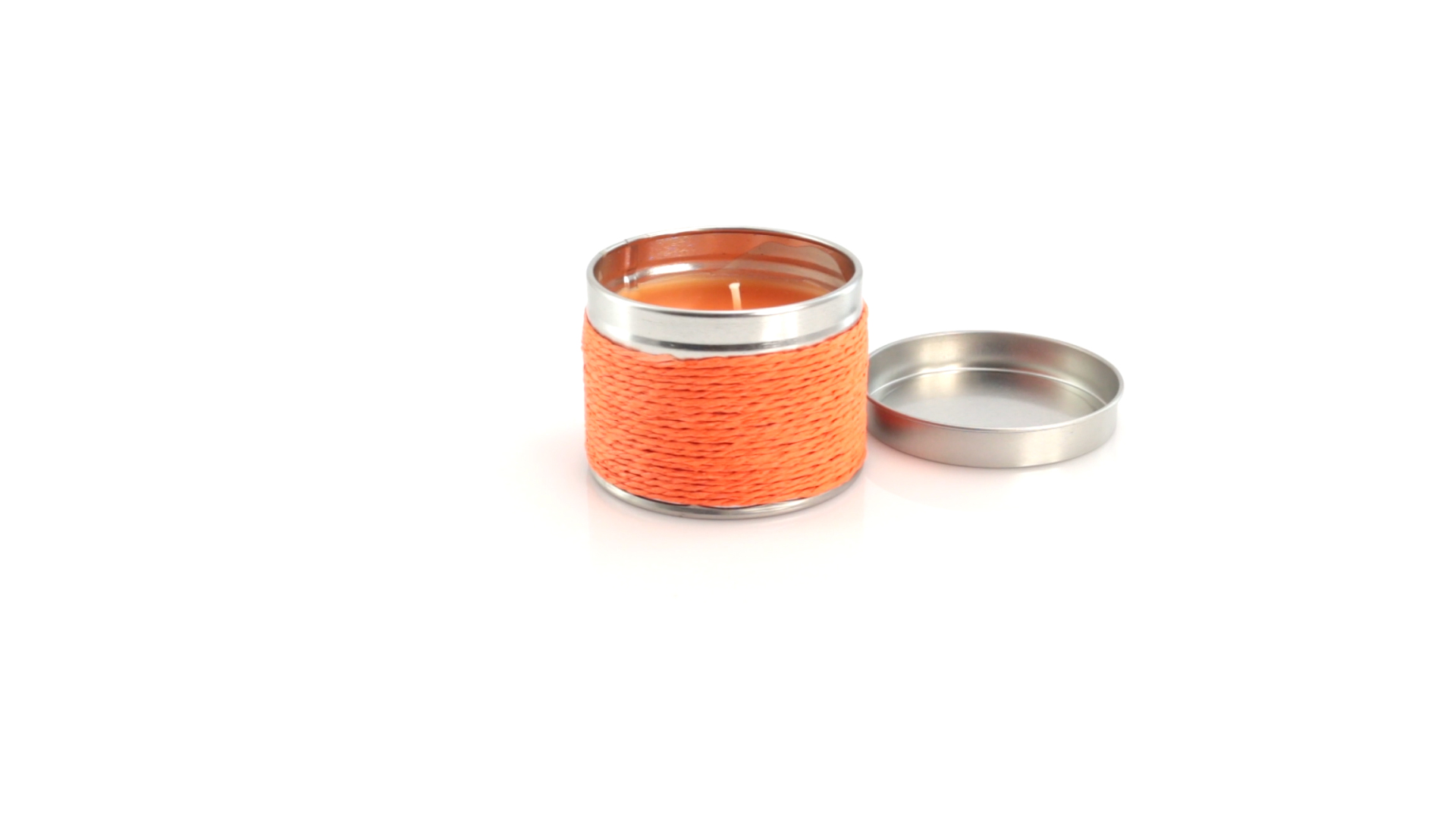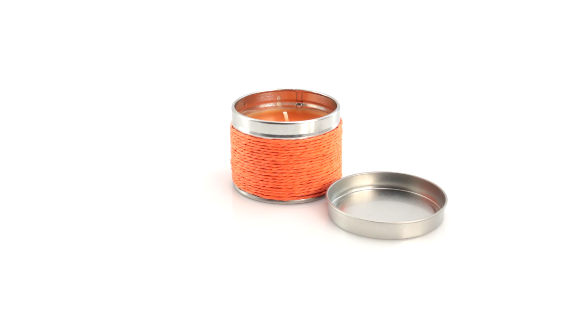 Duftkerze in mit Garn umwickeltem Metallbehälter in einer Vielzahl von Farben. Erhältlich mit Vanille-, Orangen- und Schokoladenaroma.