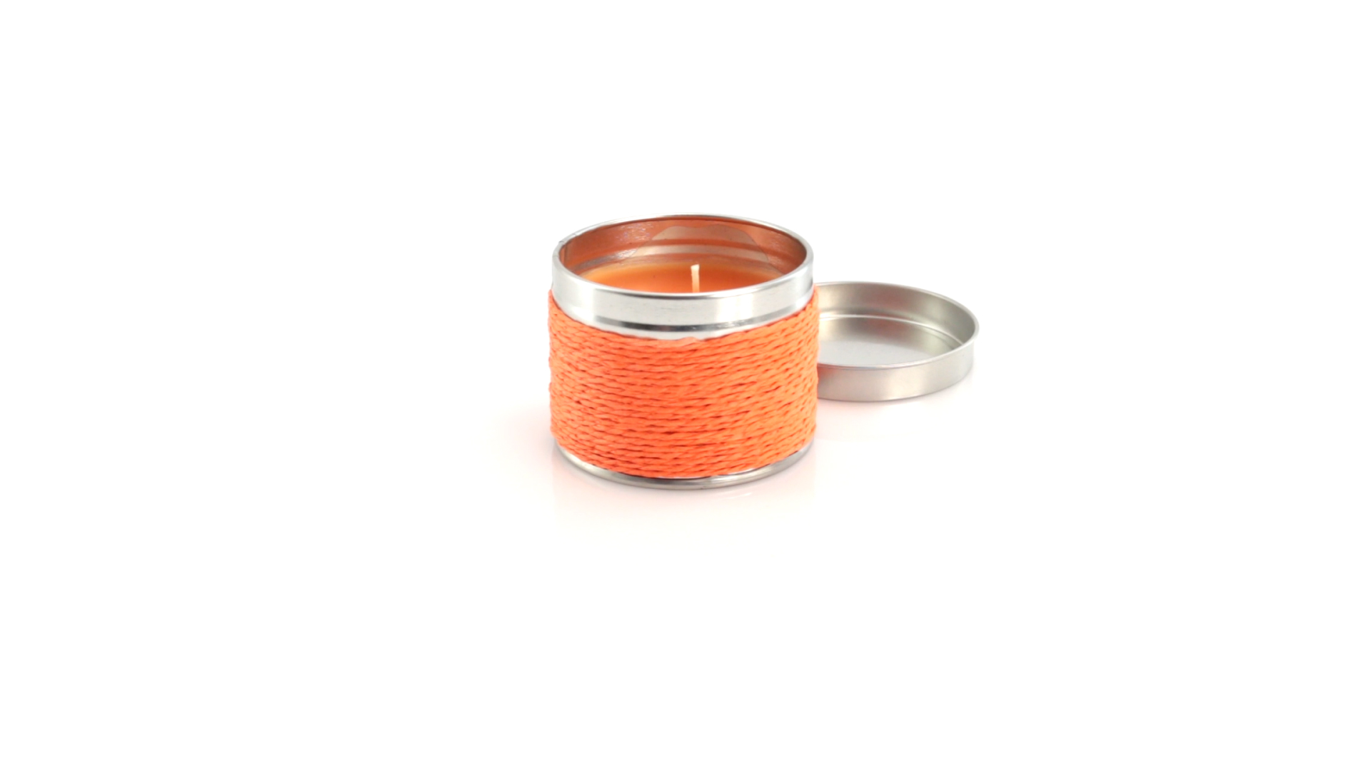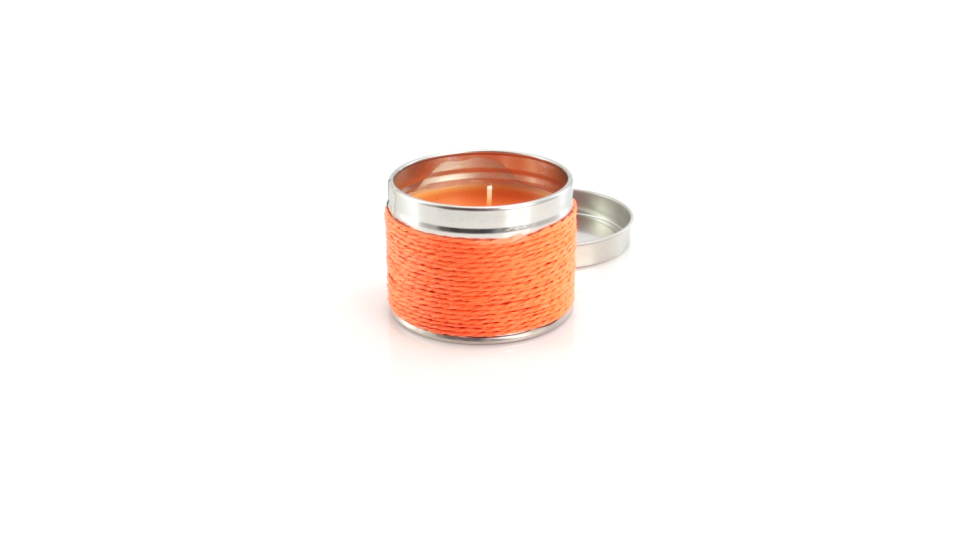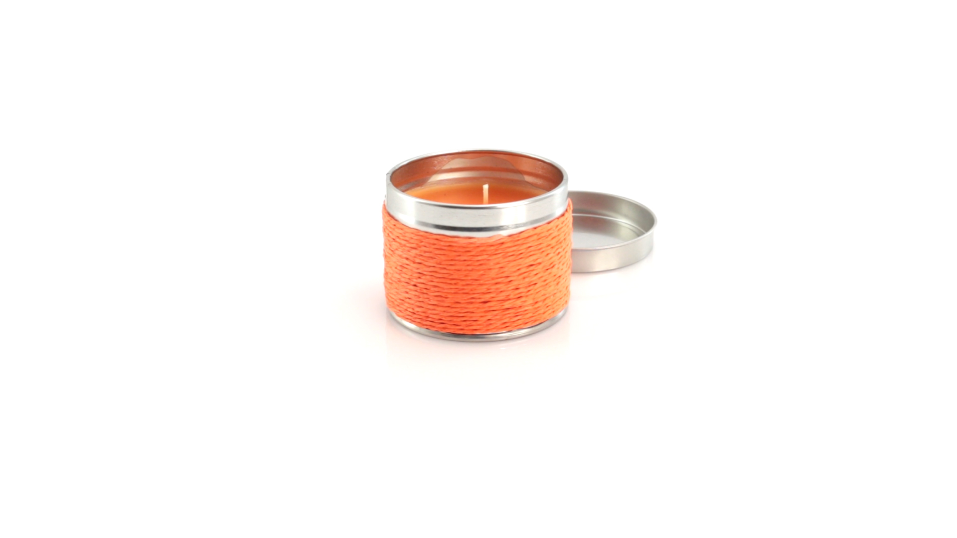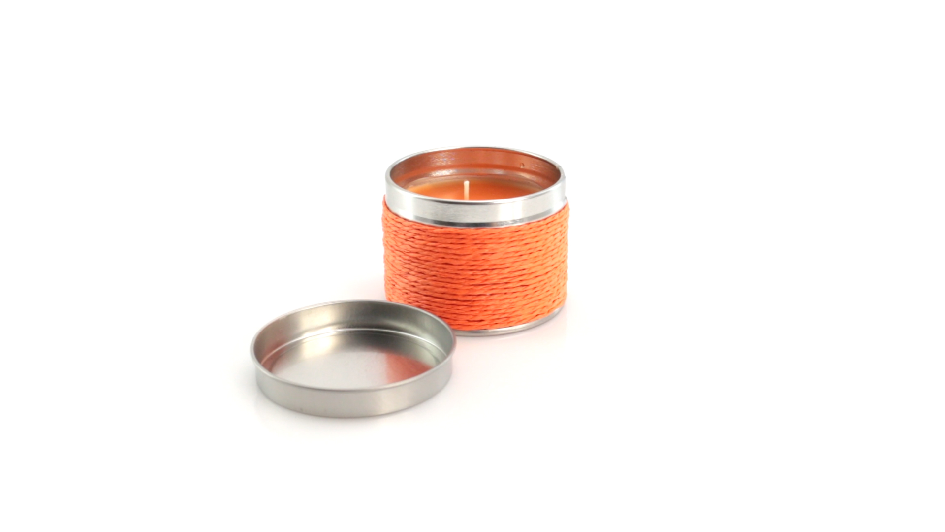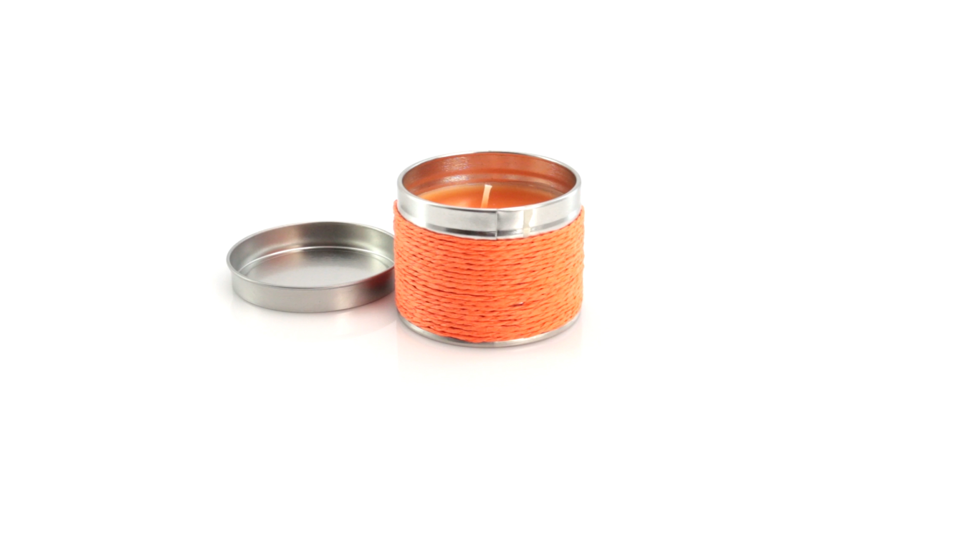 Duftkerze in mit Garn umwickeltem Metallbehälter in einer Vielzahl von Farben. Erhältlich mit Vanille-, Orangen- und Schokoladenaroma.
