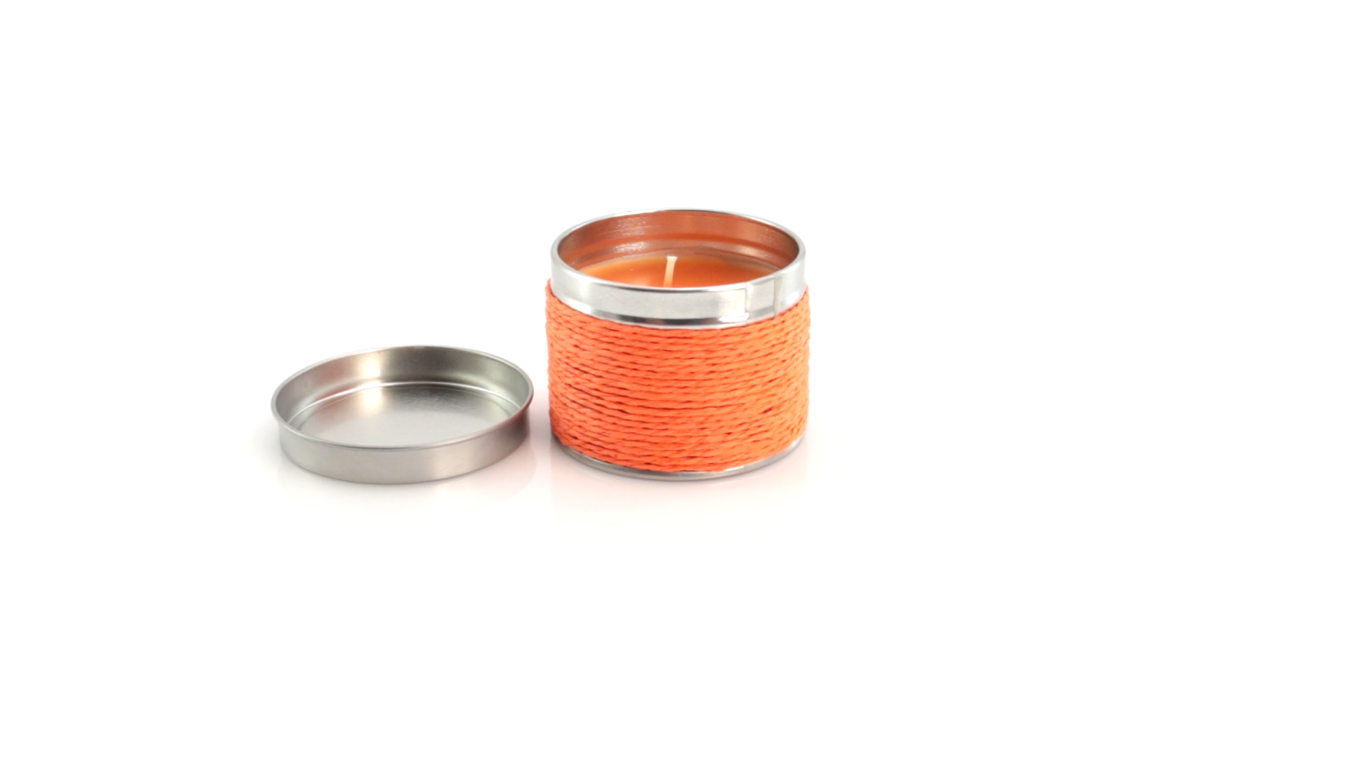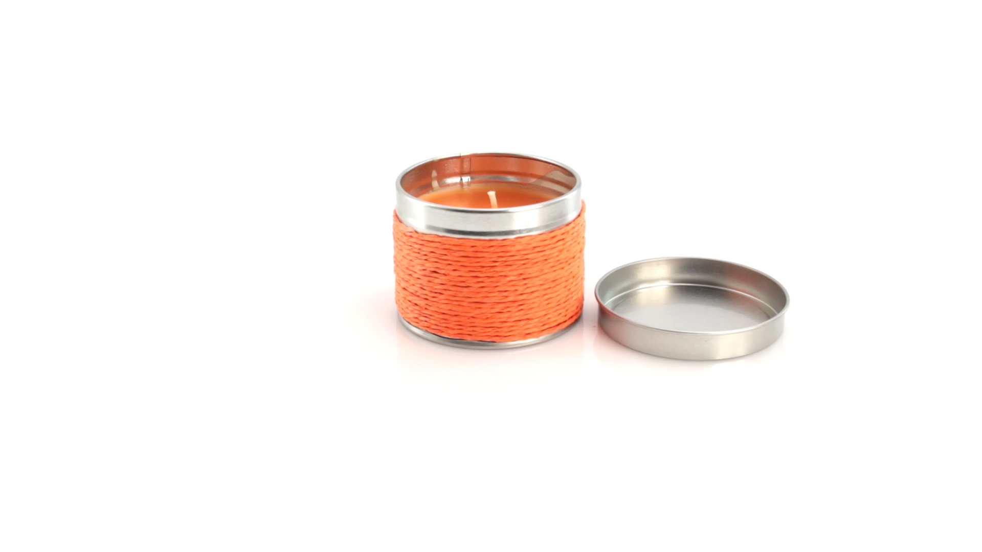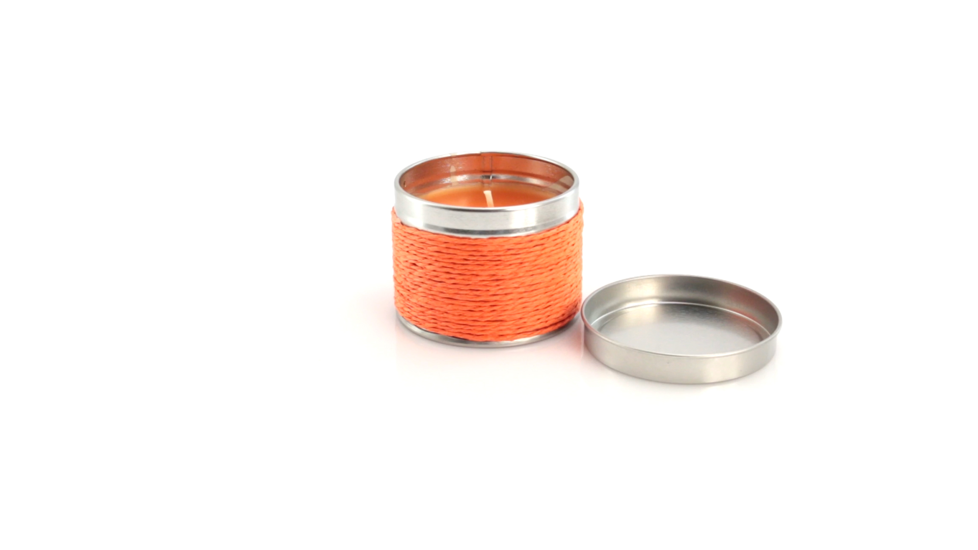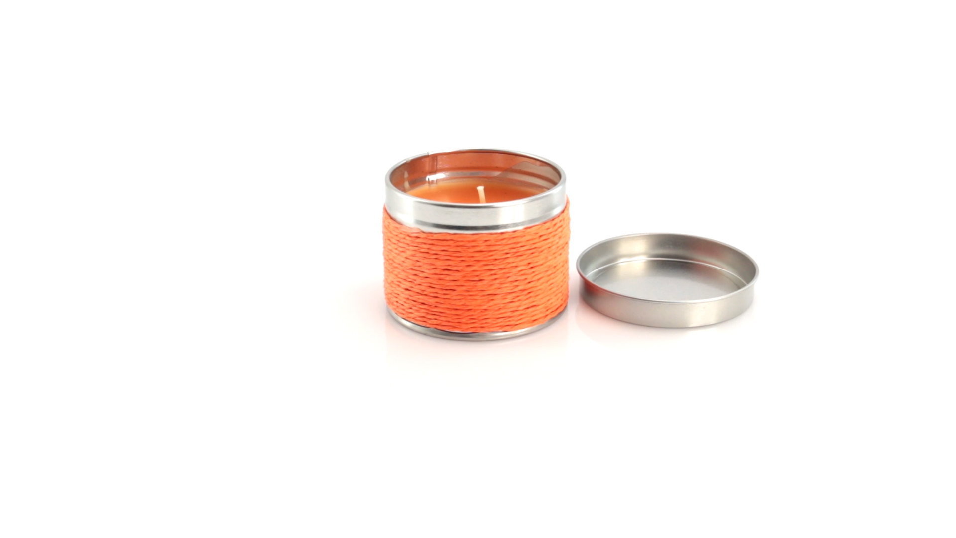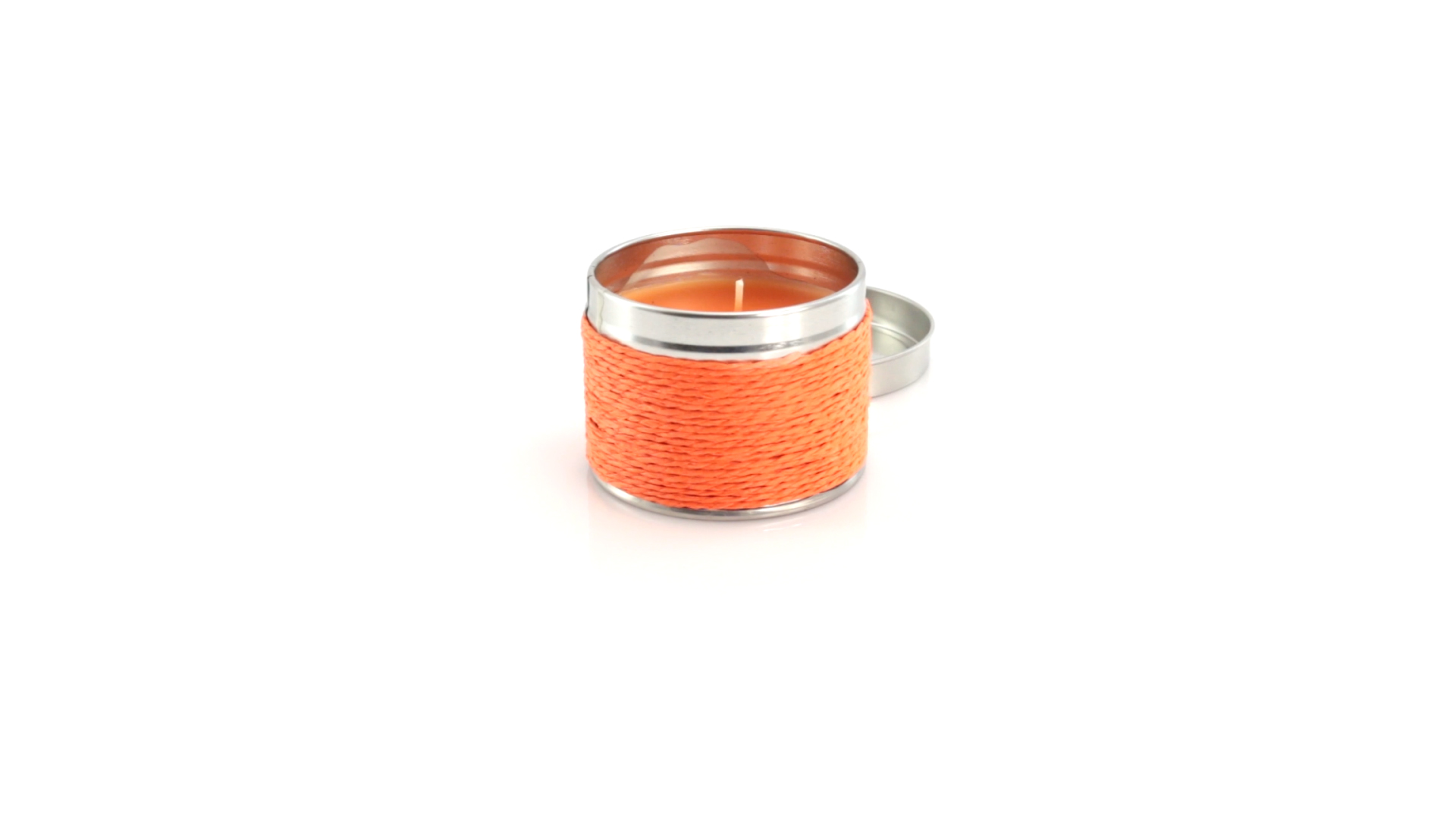 Duftkerze in mit Garn umwickeltem Metallbehälter in einer Vielzahl von Farben. Erhältlich mit Vanille-, Orangen- und Schokoladenaroma.