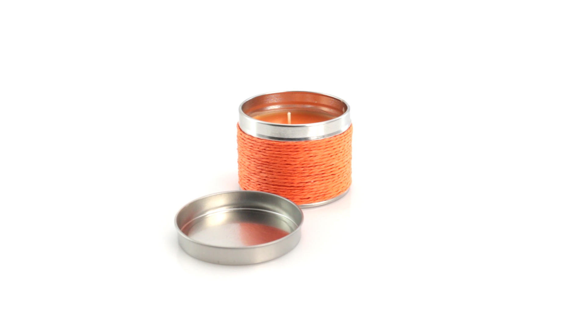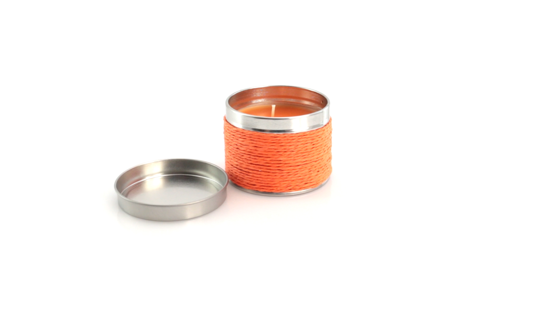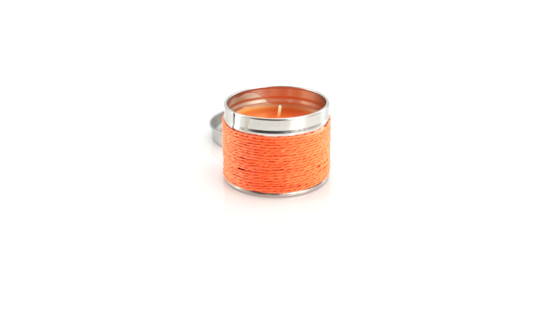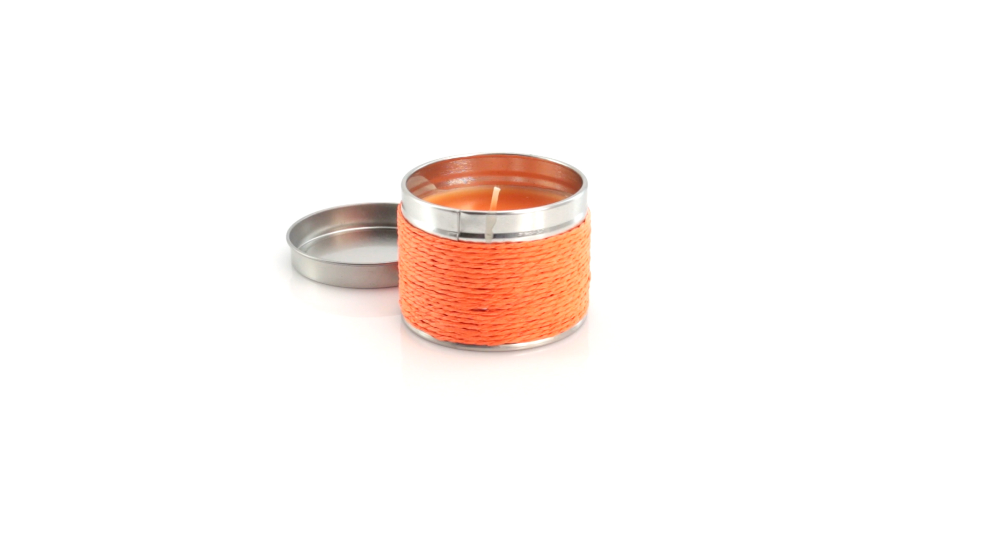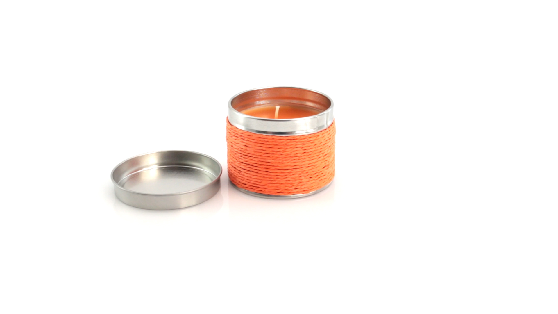 Duftkerze in mit Garn umwickeltem Metallbehälter in einer Vielzahl von Farben. Erhältlich mit Vanille-, Orangen- und Schokoladenaroma.