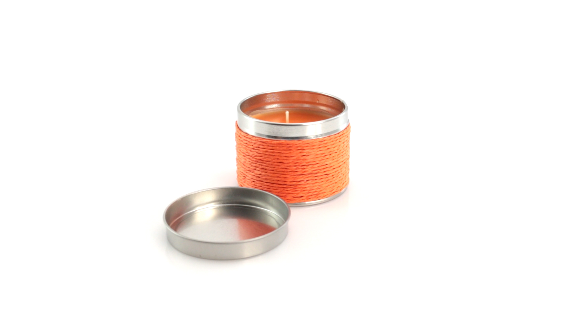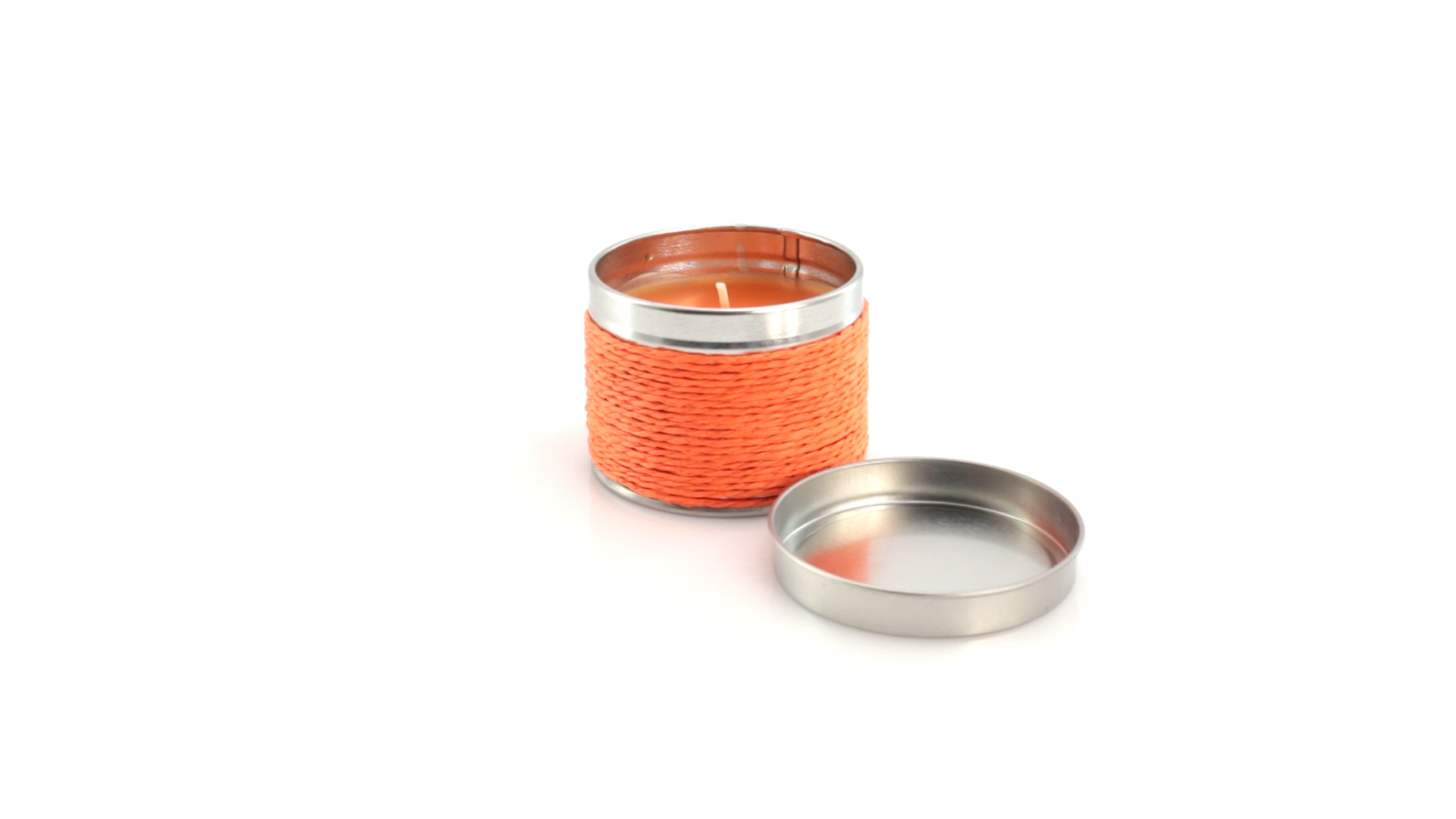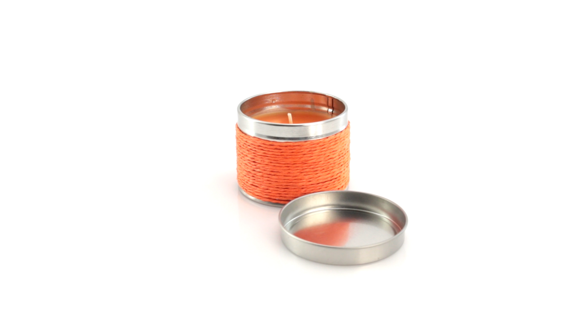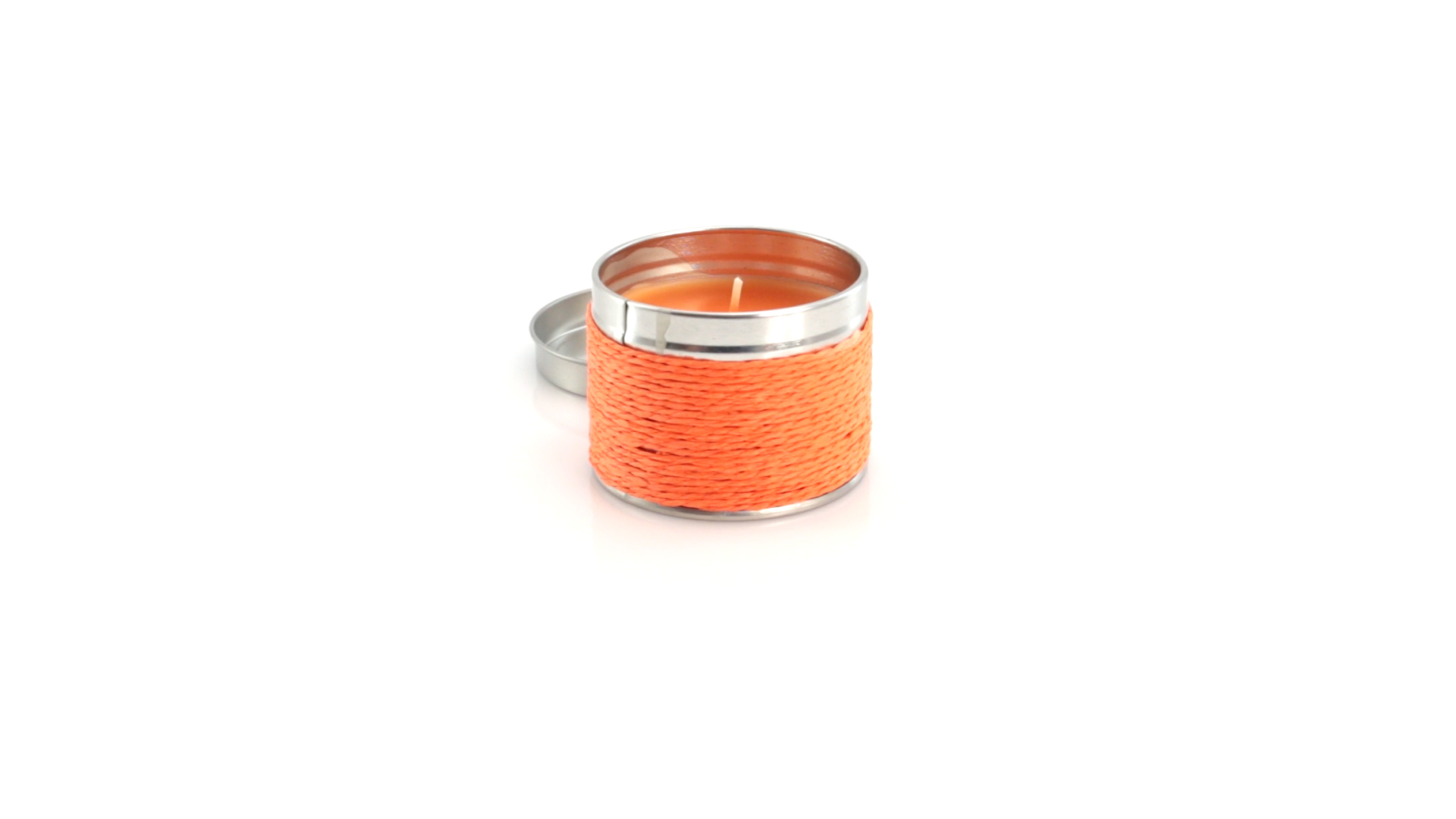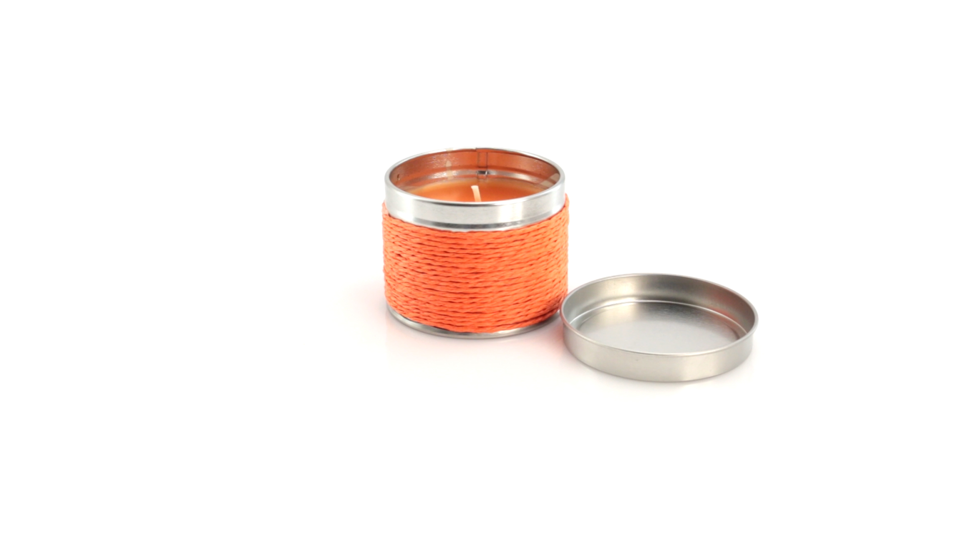 Duftkerze in mit Garn umwickeltem Metallbehälter in einer Vielzahl von Farben. Erhältlich mit Vanille-, Orangen- und Schokoladenaroma.