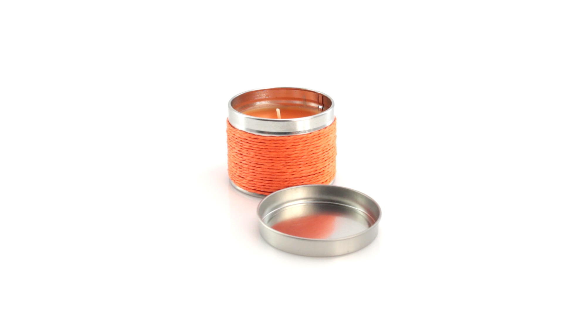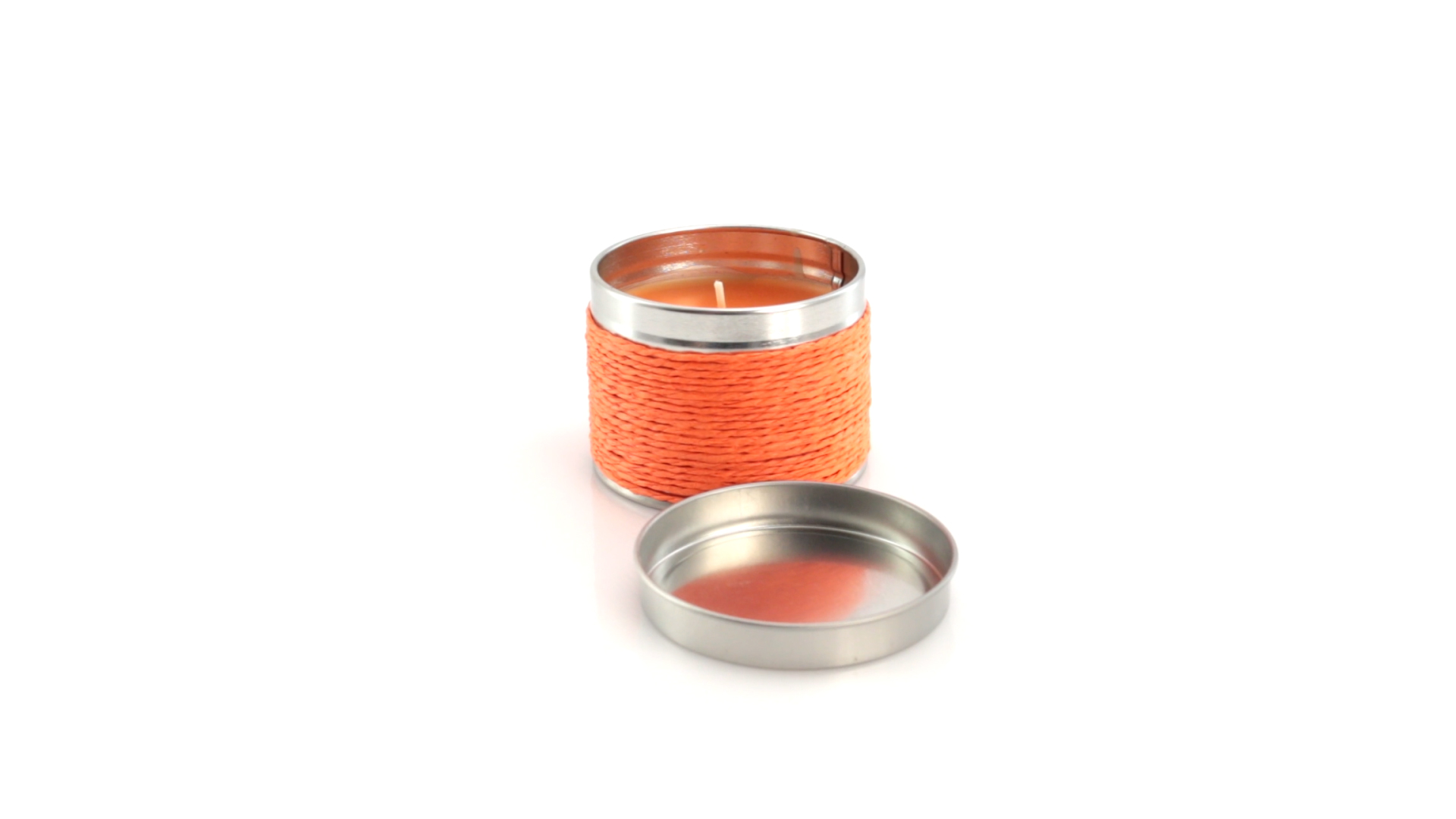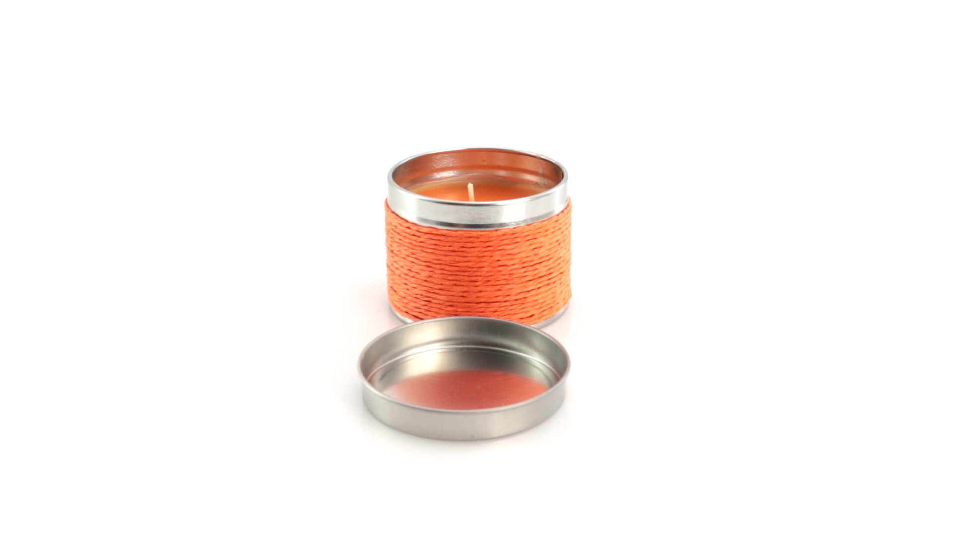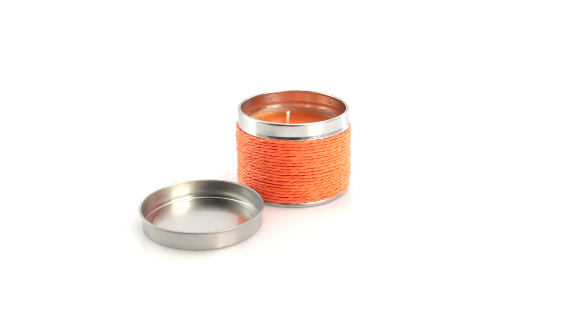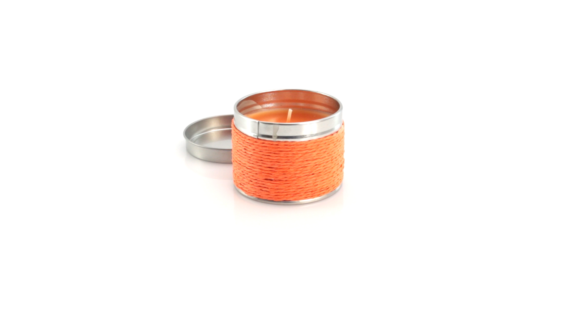 Duftkerze in mit Garn umwickeltem Metallbehälter in einer Vielzahl von Farben. Erhältlich mit Vanille-, Orangen- und Schokoladenaroma.