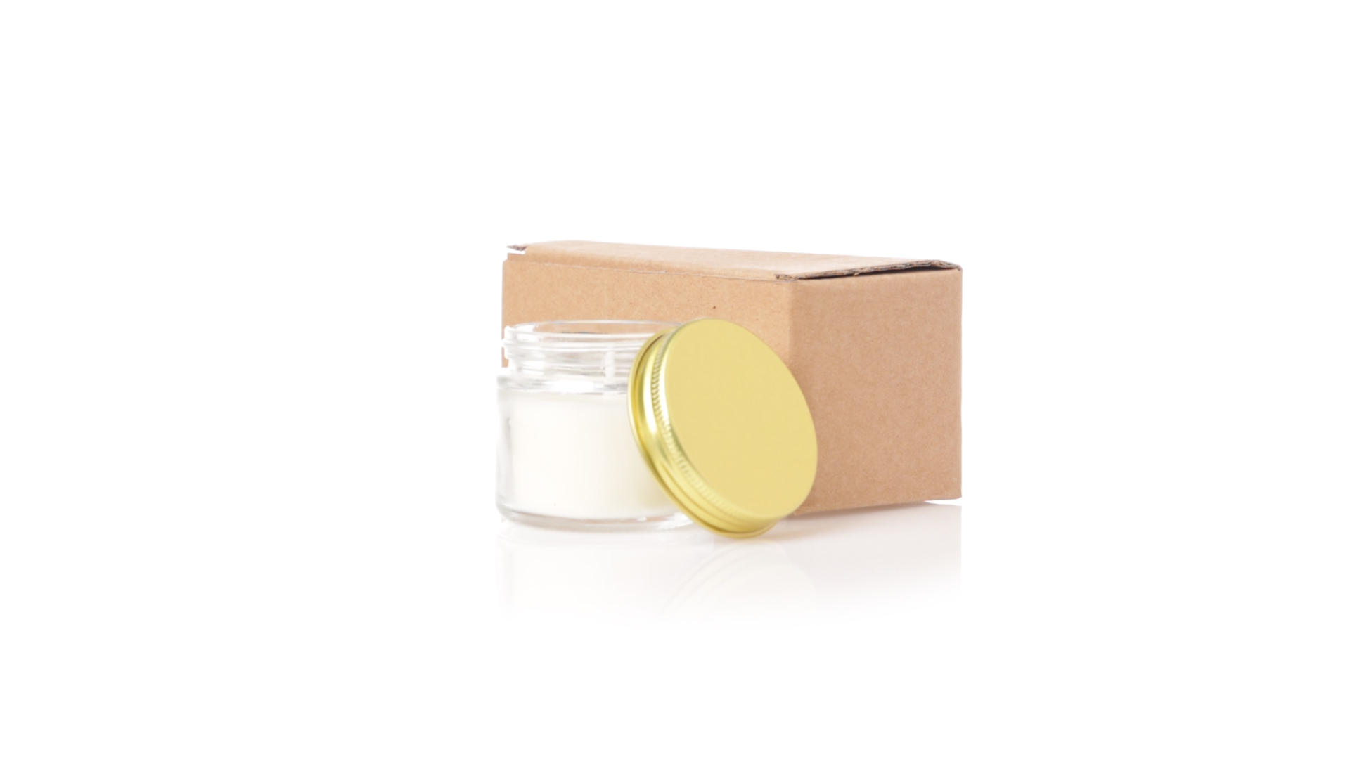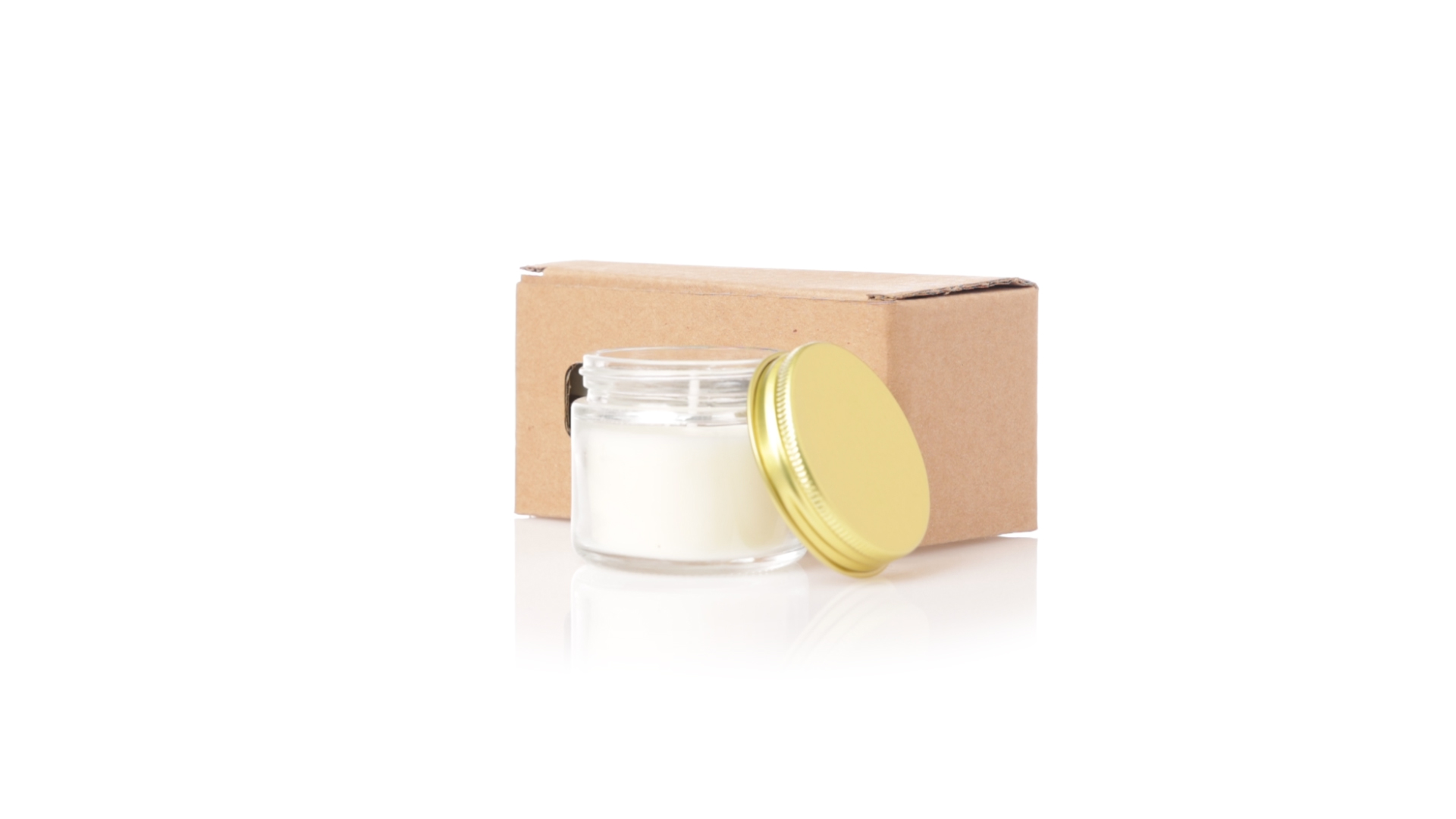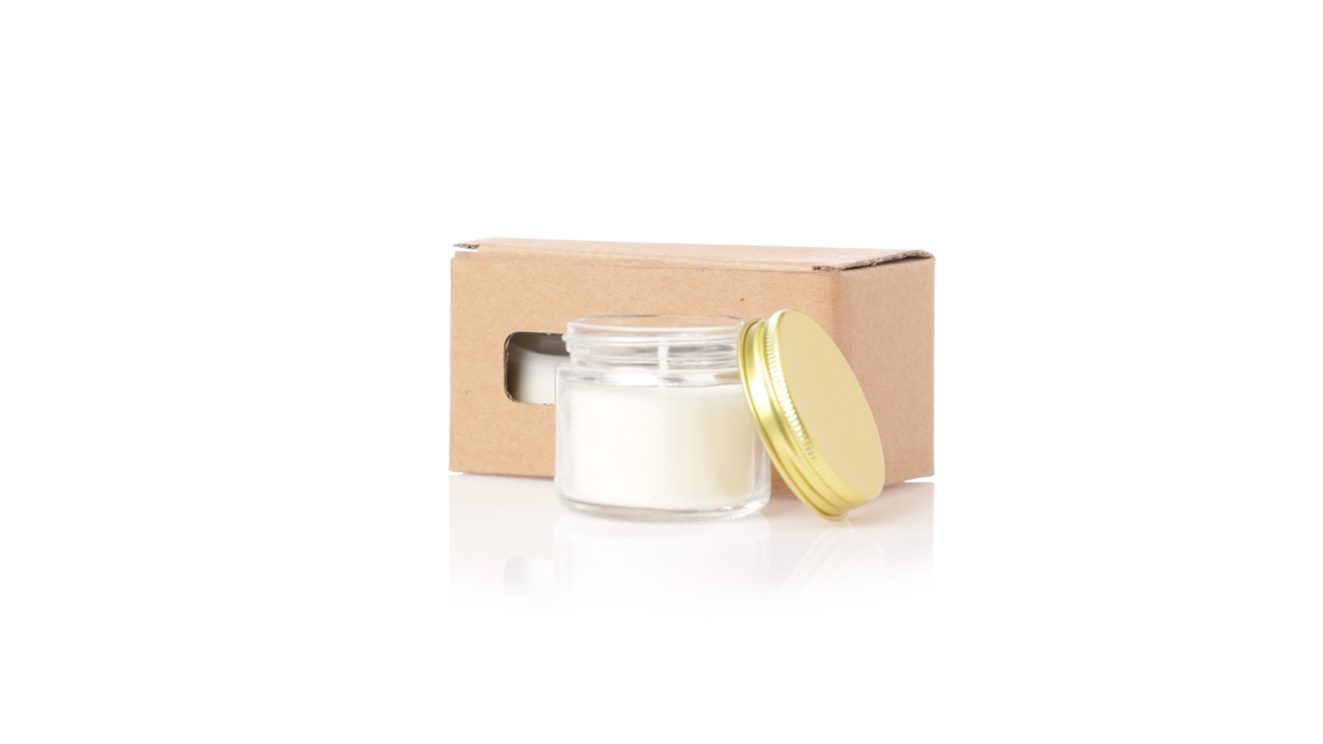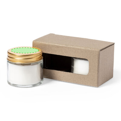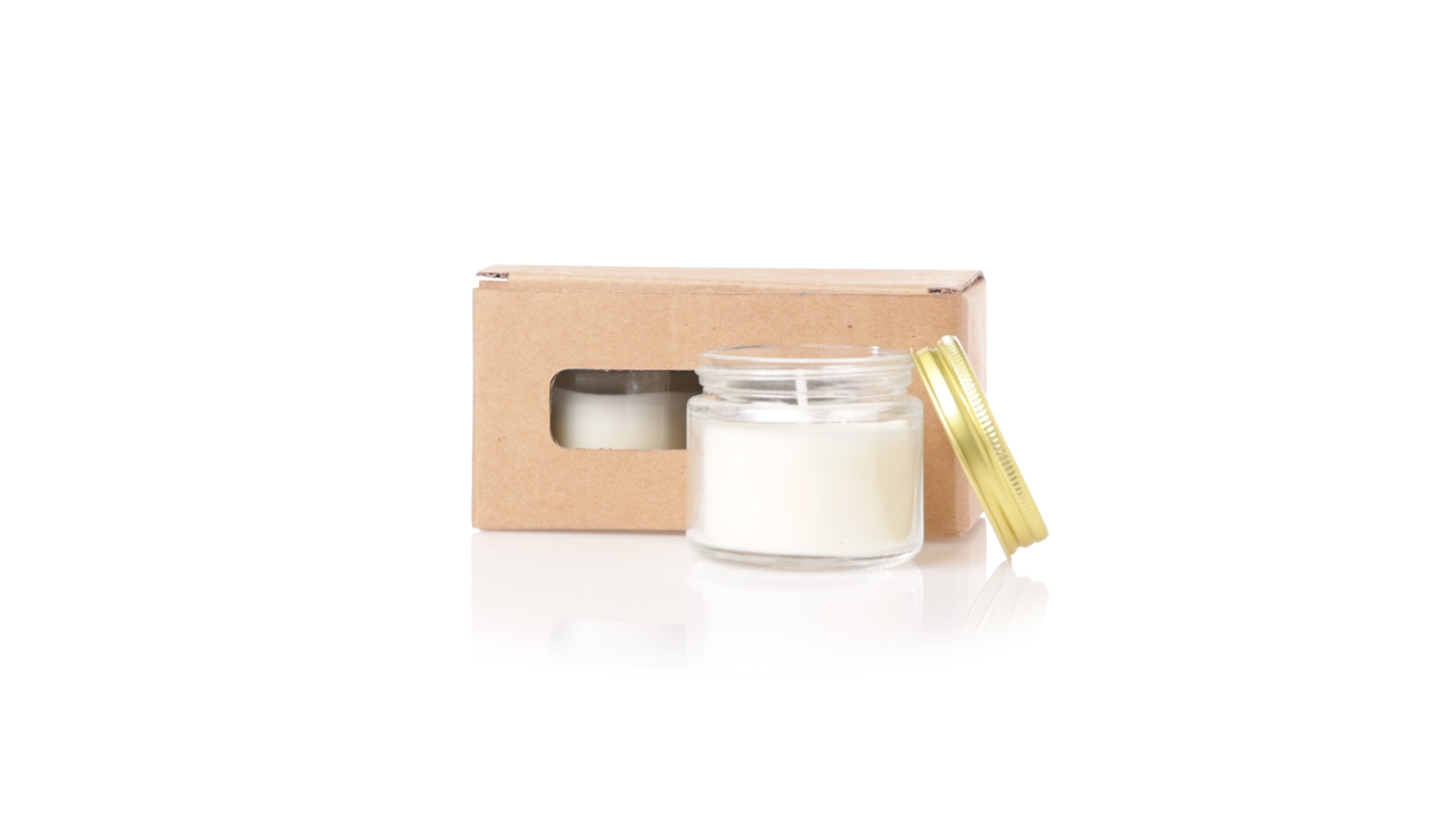 Duftkerzen-Set mit pflanzlichem Wachs und Fresienblüten-Duft. In einem Glasgefäss mit metallischem Schraubverschluss und goldener Oberfläche. Präsentiert in einer individuellen Kraftbox.