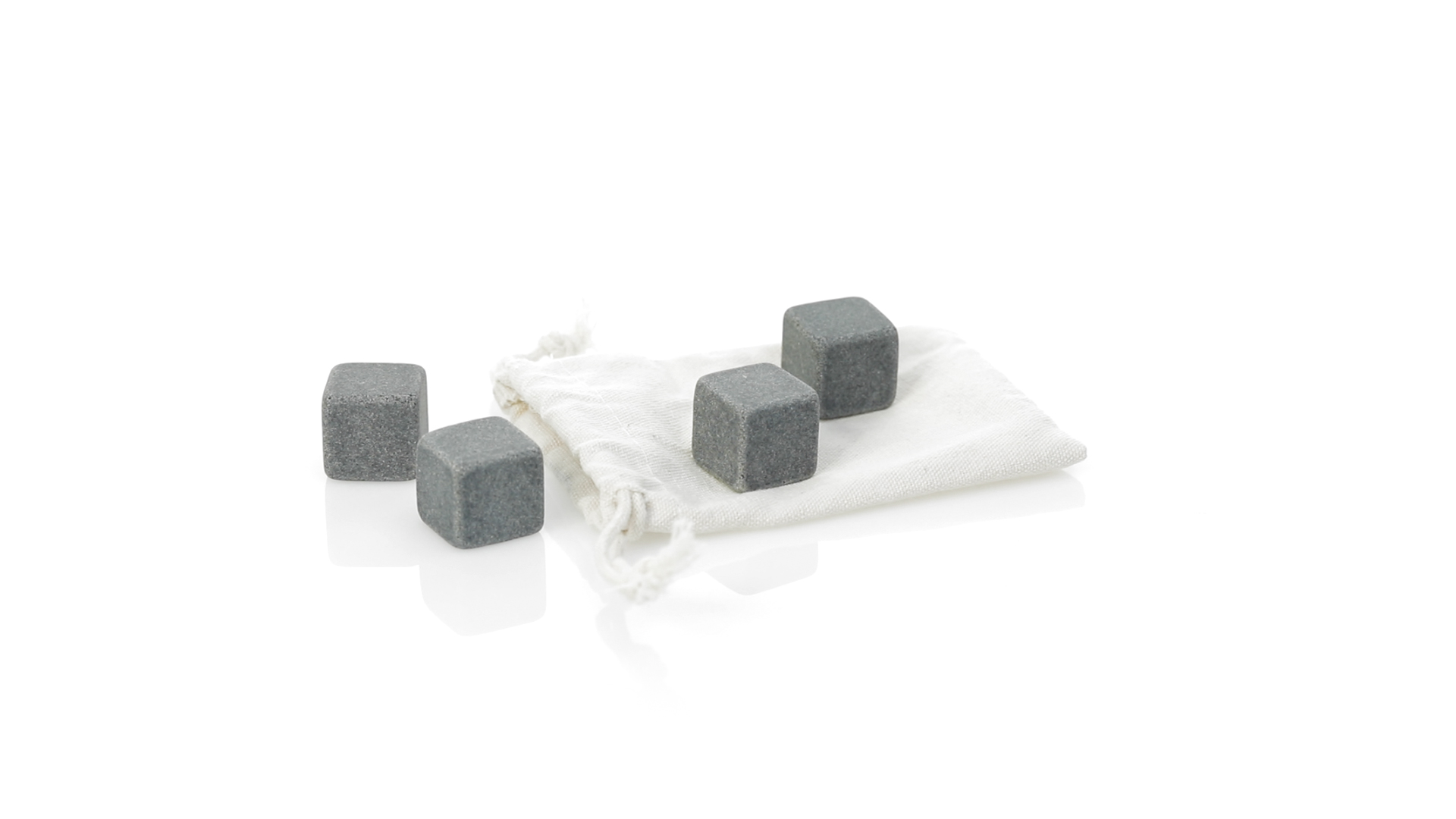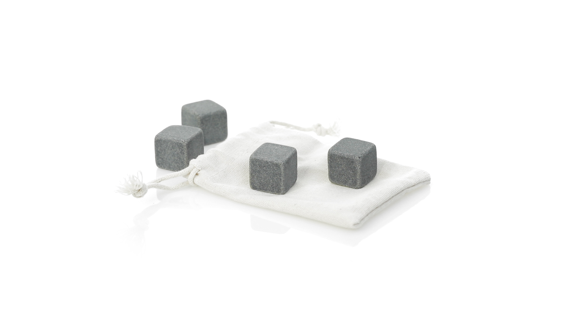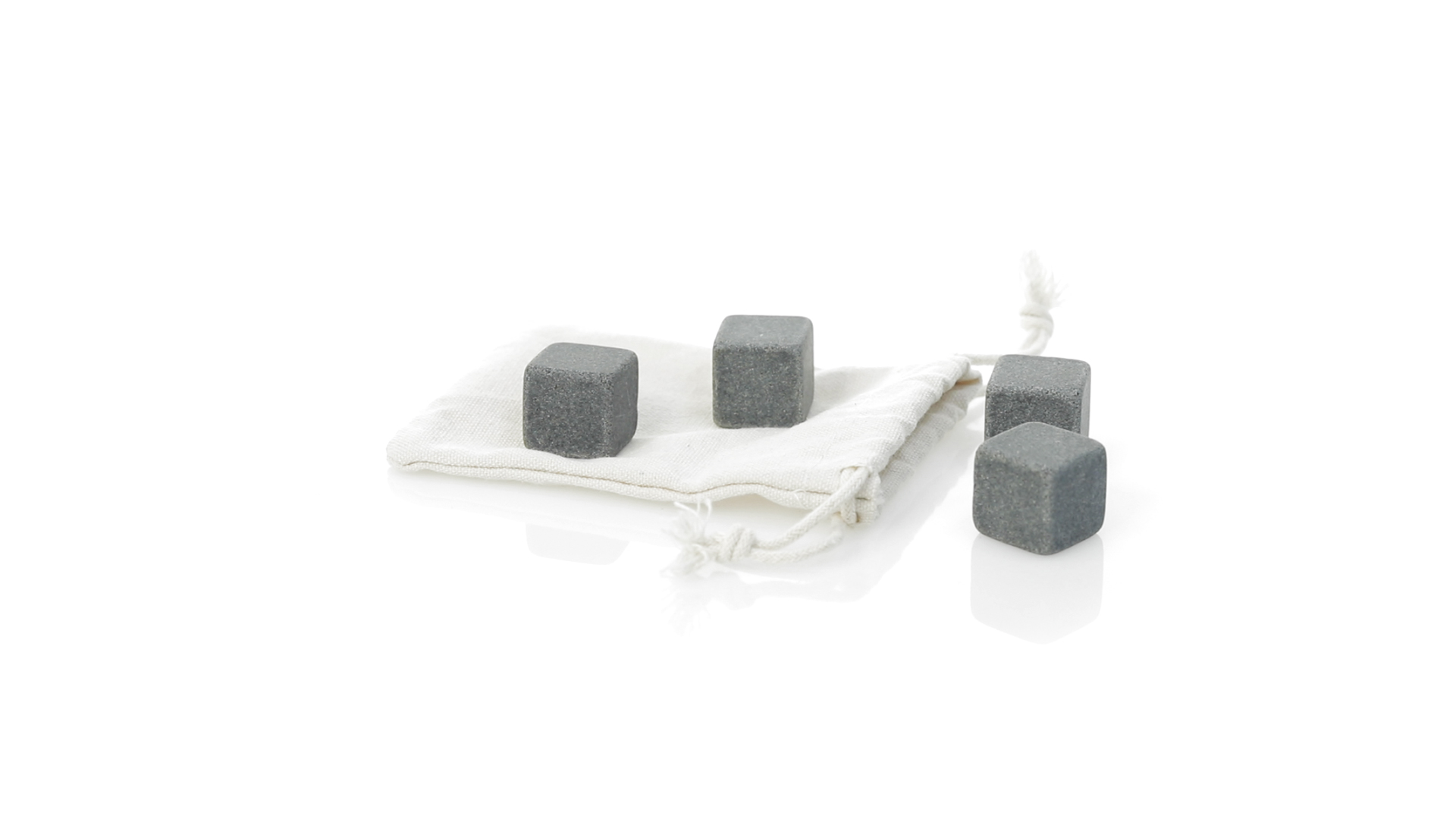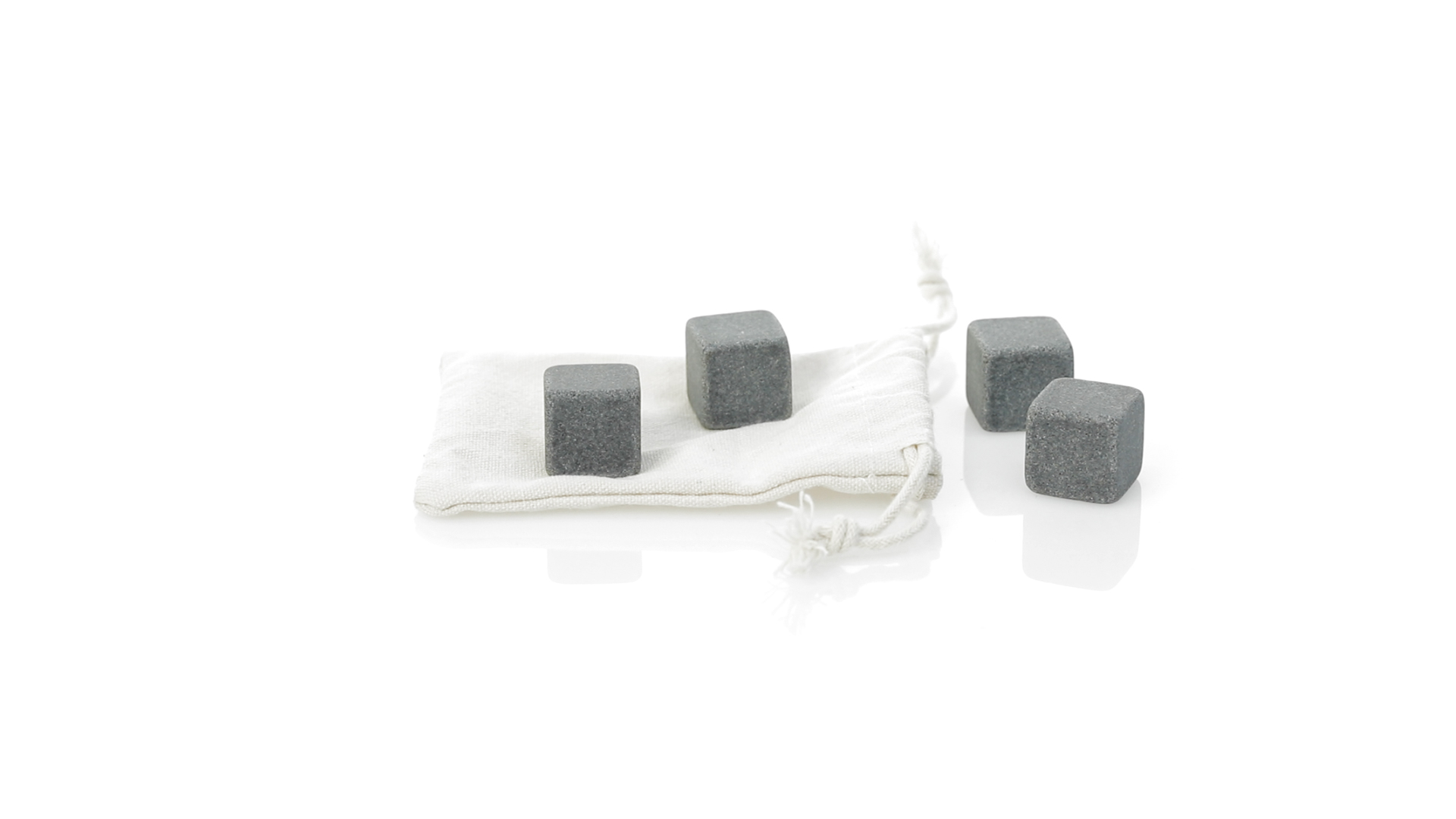 Set aus 4 wiederverwendbaren Eiswürfeln. Hergestellt aus natürlichem Speckstein, der das Getränk kalt hält, ohne seine Eigenschaften zu verändern, indem er seinen Inhalt nicht mit Wasser verdünnt und seinen ursprünglichen Geschmack beibehält. Präsentiert in einem Baumwollbeutel mit Schnurverschluss.