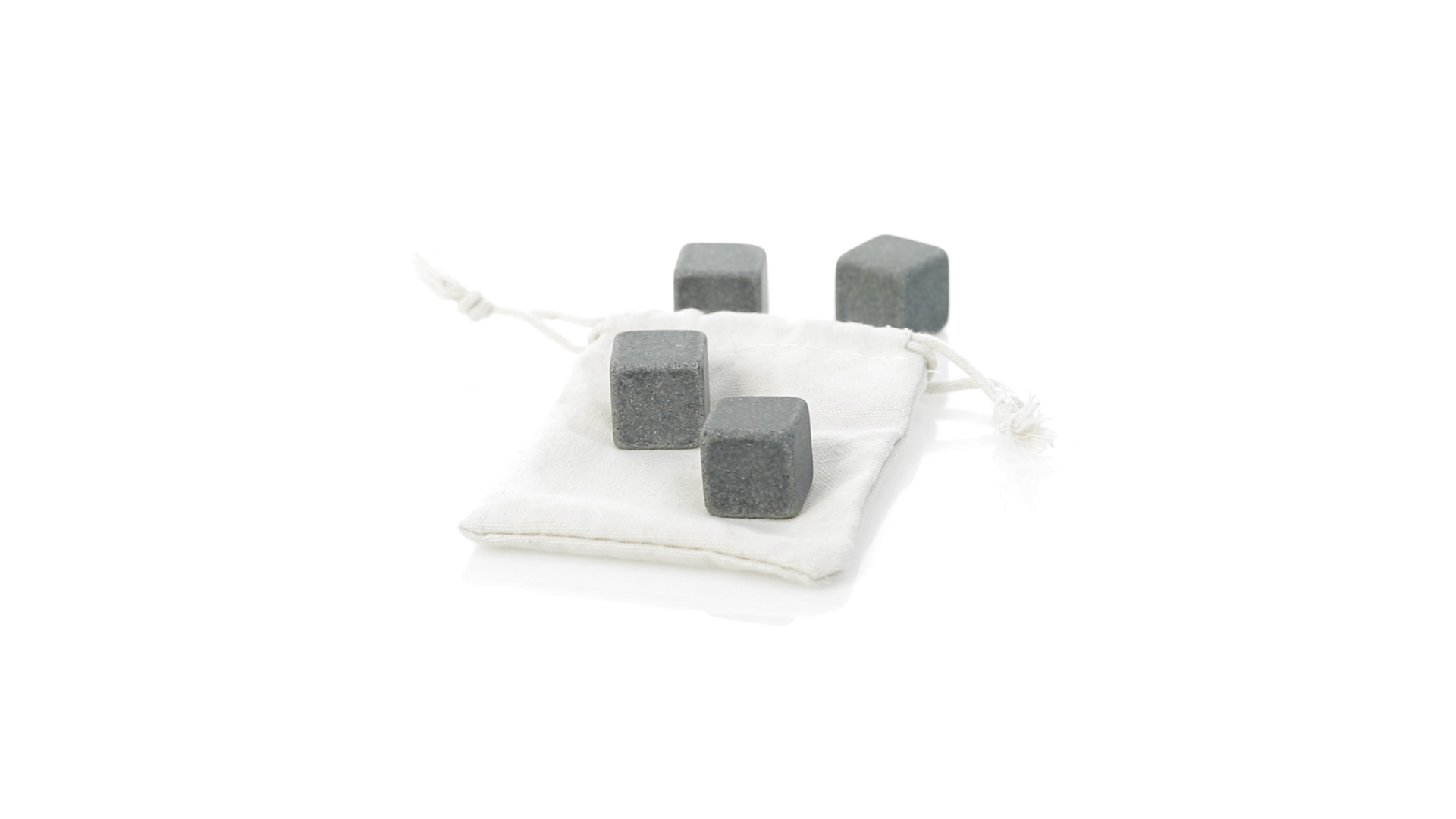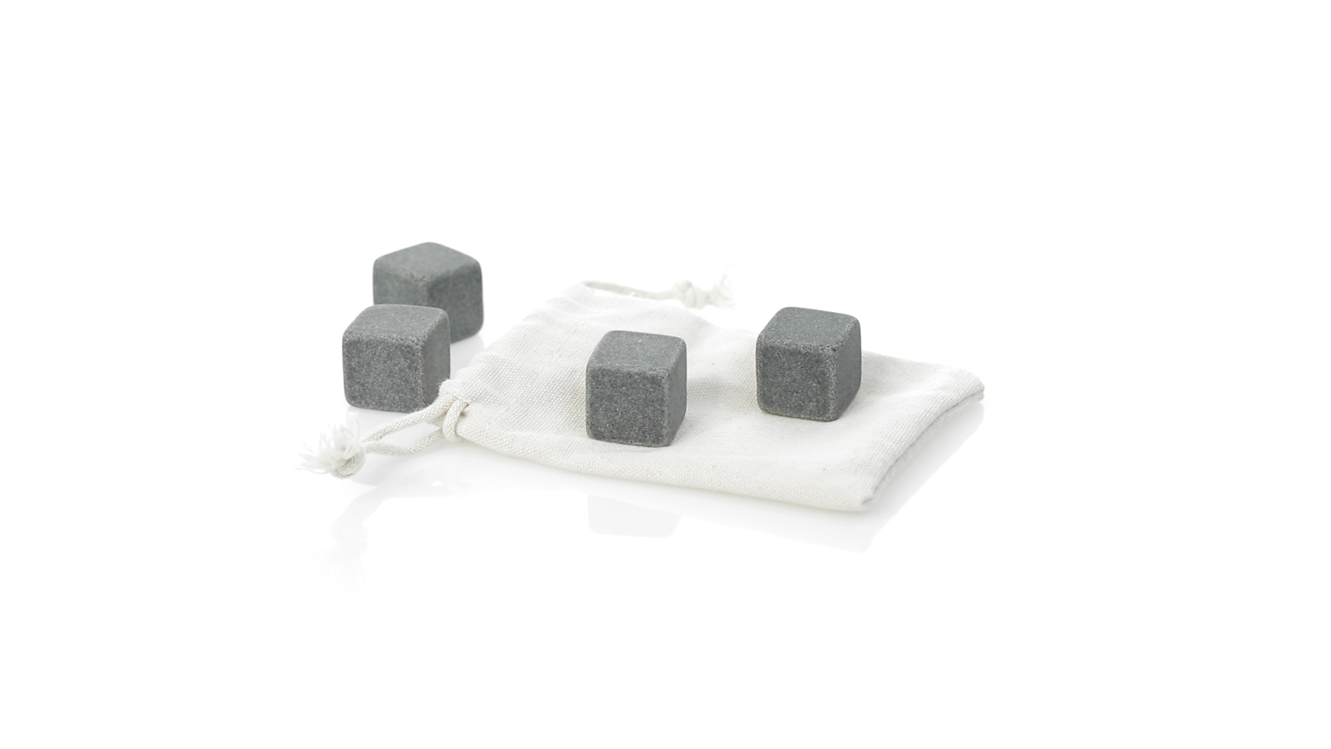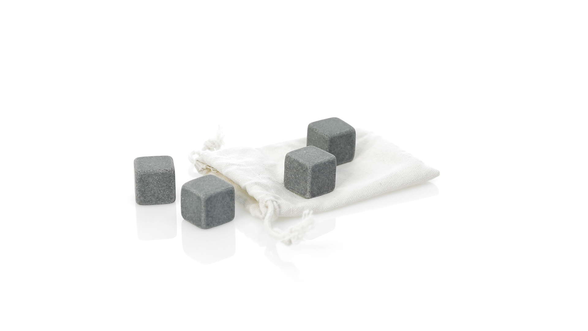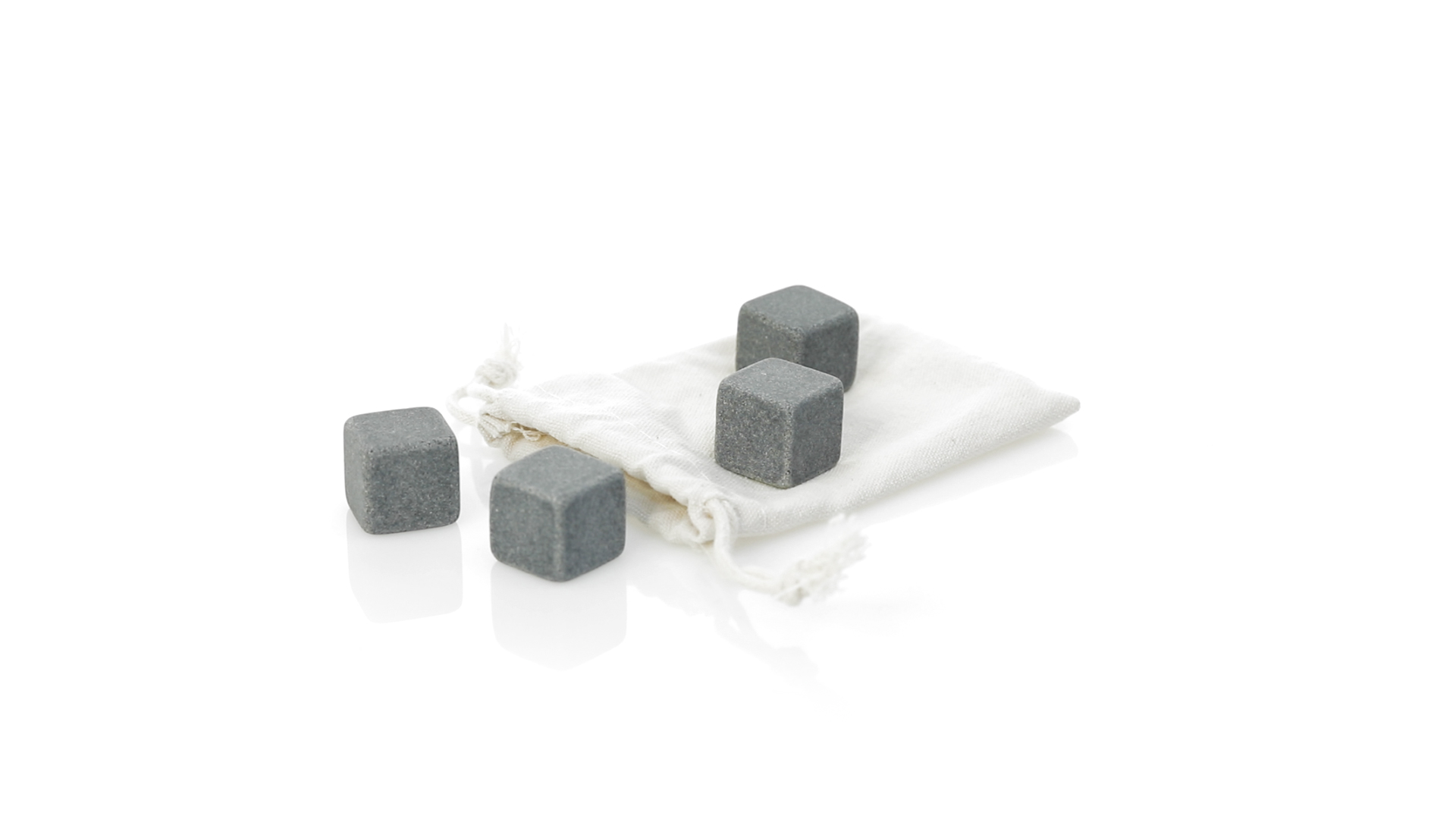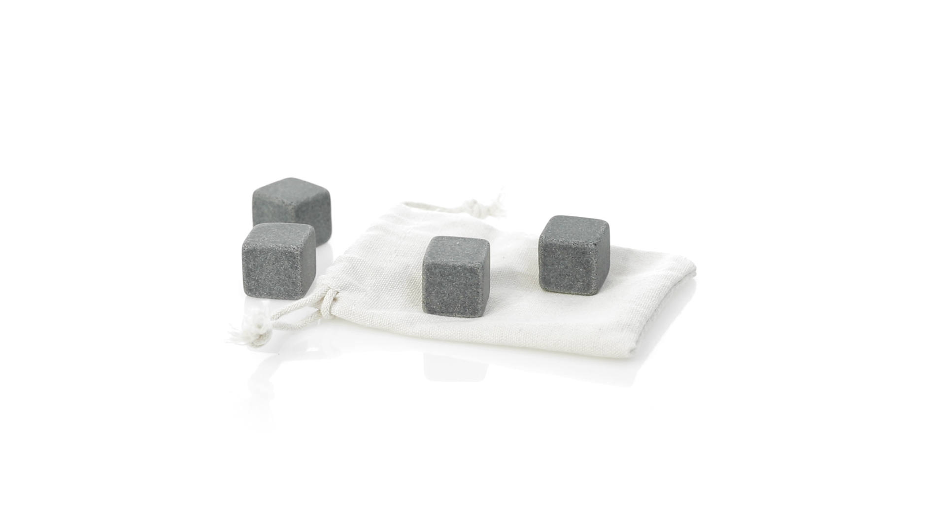 Set aus 4 wiederverwendbaren Eiswürfeln. Hergestellt aus natürlichem Speckstein, der das Getränk kalt hält, ohne seine Eigenschaften zu verändern, indem er seinen Inhalt nicht mit Wasser verdünnt und seinen ursprünglichen Geschmack beibehält. Präsentiert in einem Baumwollbeutel mit Schnurverschluss.
