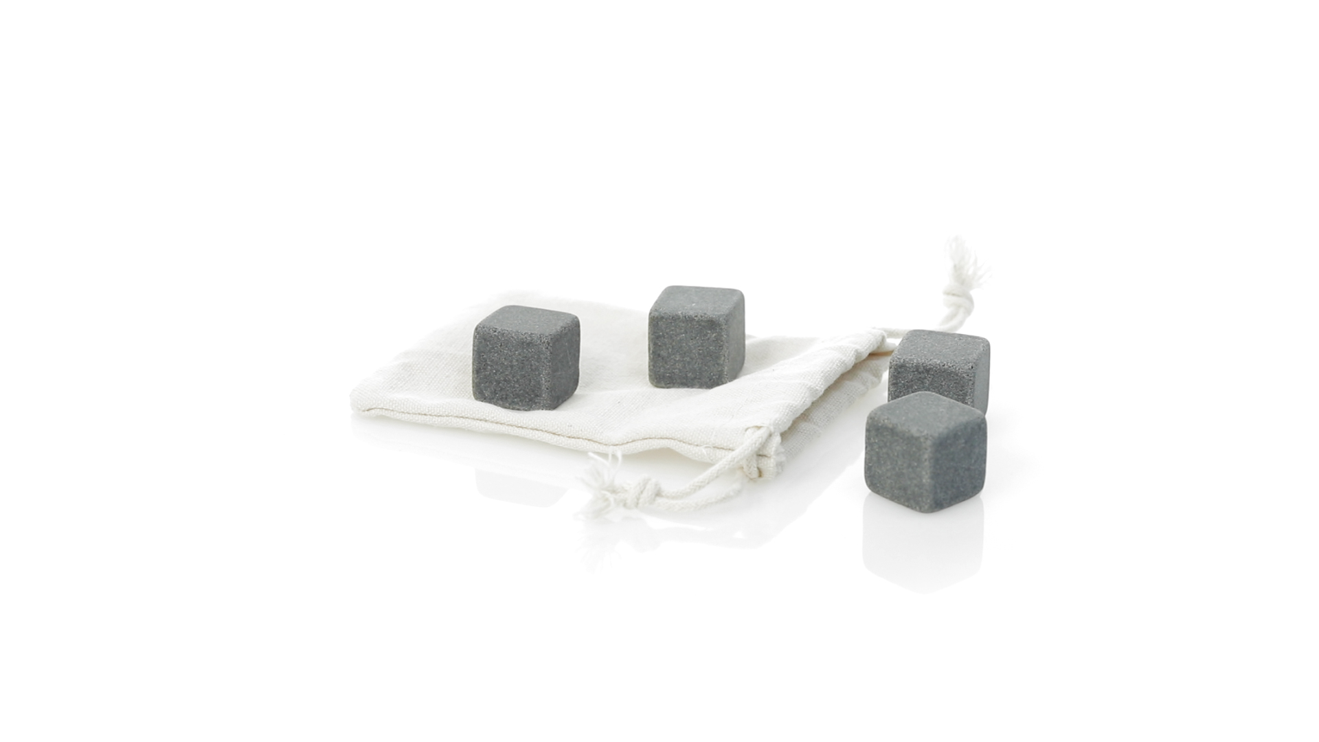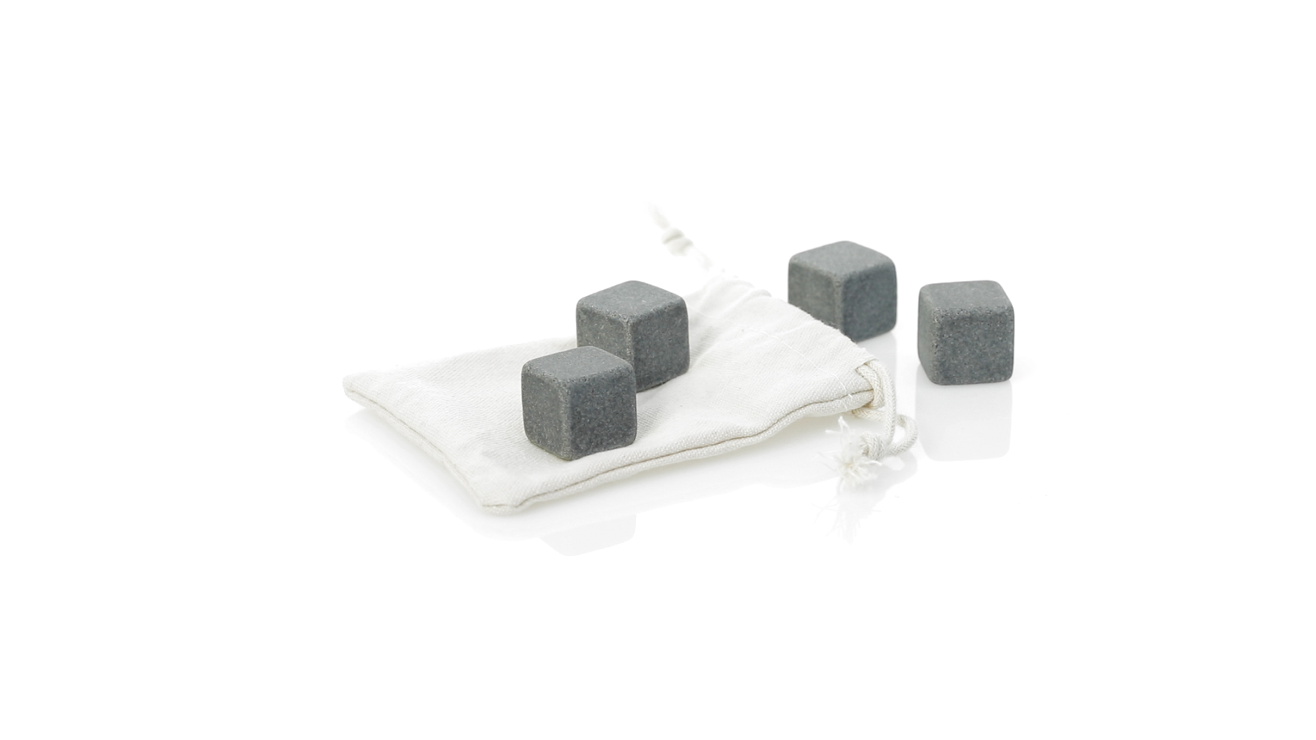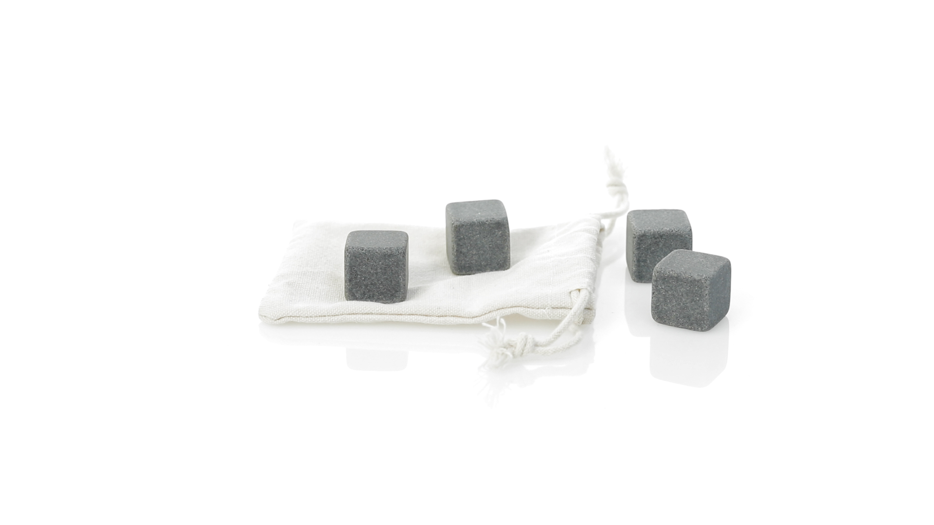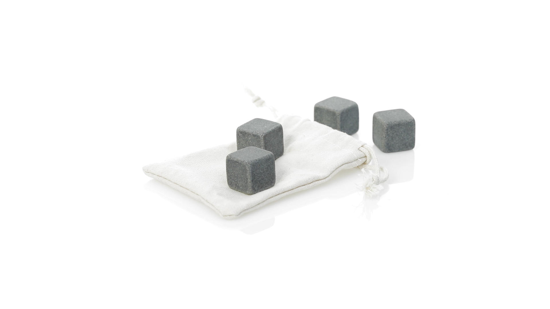 Set aus 4 wiederverwendbaren Eiswürfeln. Hergestellt aus natürlichem Speckstein, der das Getränk kalt hält, ohne seine Eigenschaften zu verändern, indem er seinen Inhalt nicht mit Wasser verdünnt und seinen ursprünglichen Geschmack beibehält. Präsentiert in einem Baumwollbeutel mit Schnurverschluss.