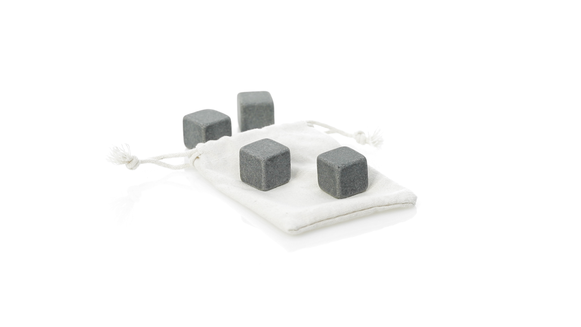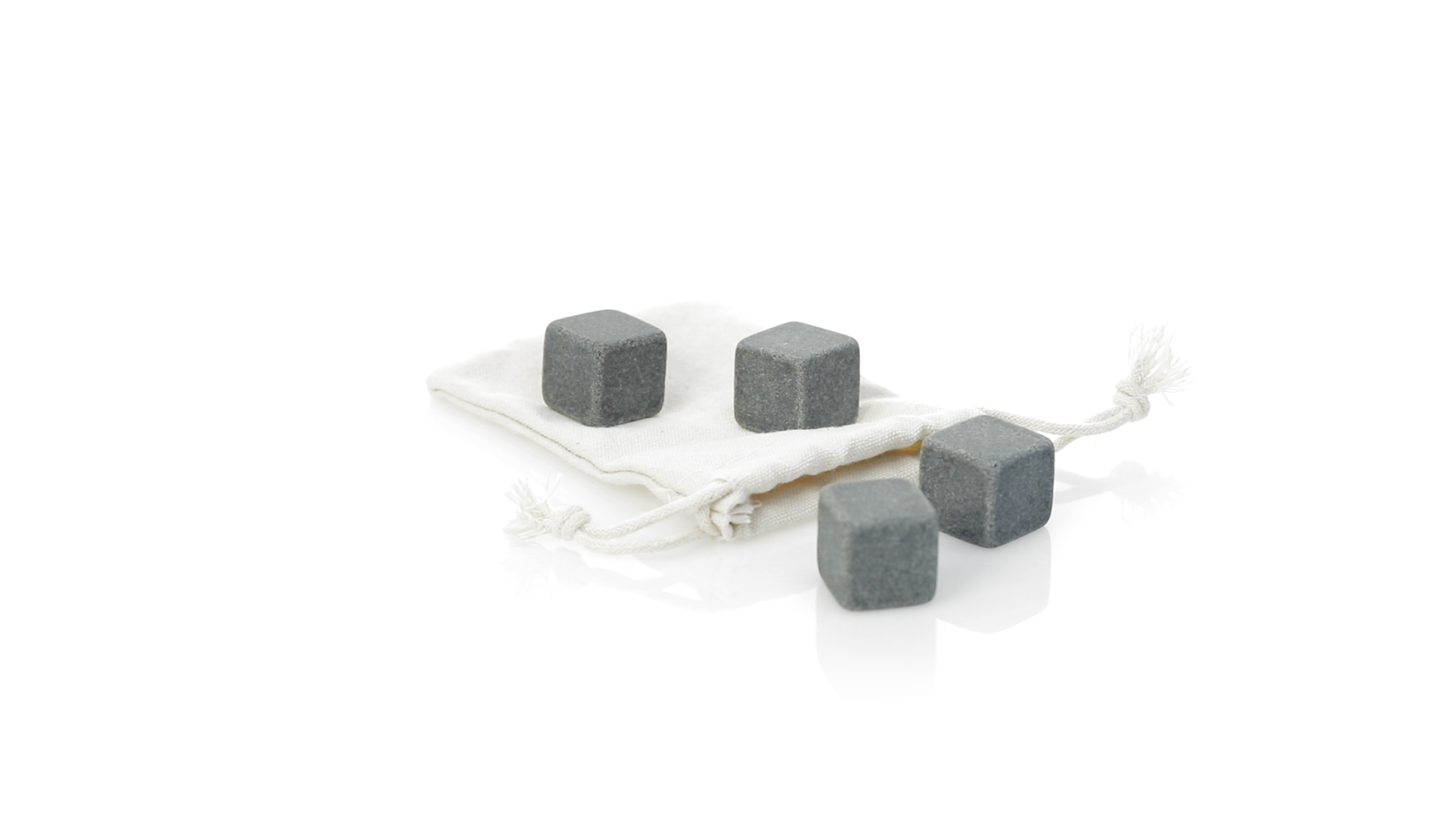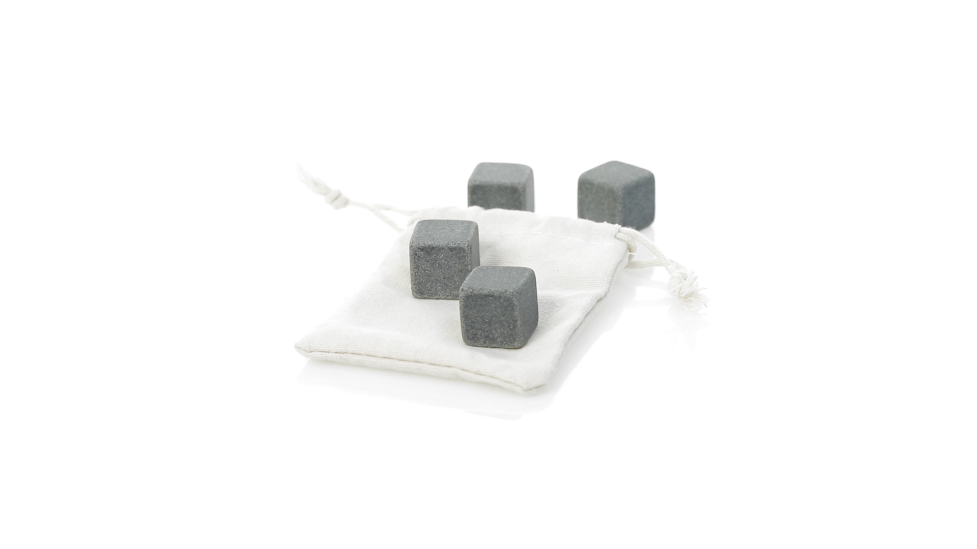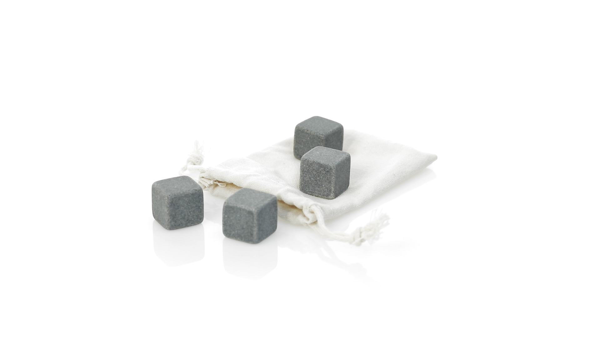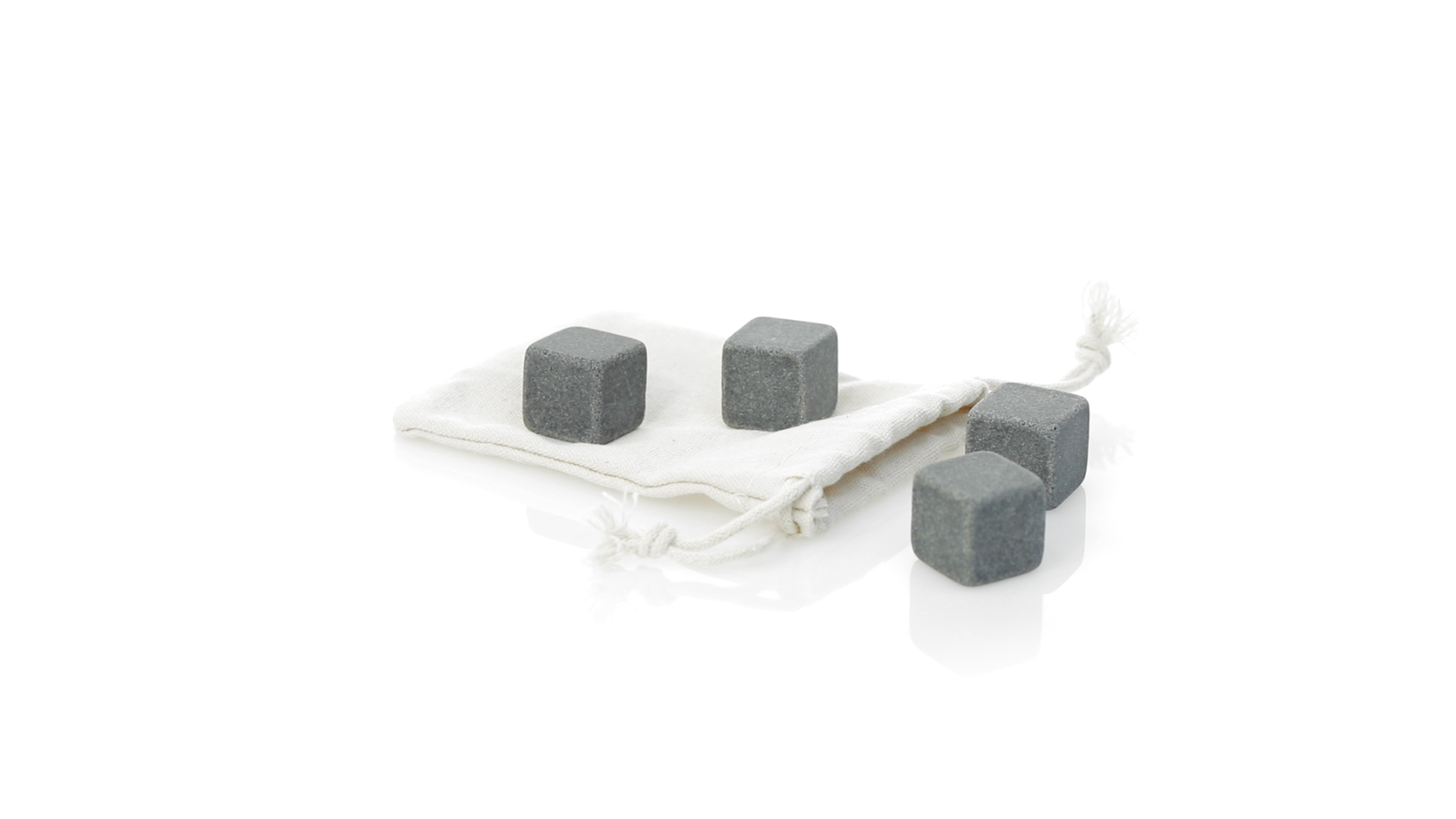 Set aus 4 wiederverwendbaren Eiswürfeln. Hergestellt aus natürlichem Speckstein, der das Getränk kalt hält, ohne seine Eigenschaften zu verändern, indem er seinen Inhalt nicht mit Wasser verdünnt und seinen ursprünglichen Geschmack beibehält. Präsentiert in einem Baumwollbeutel mit Schnurverschluss.