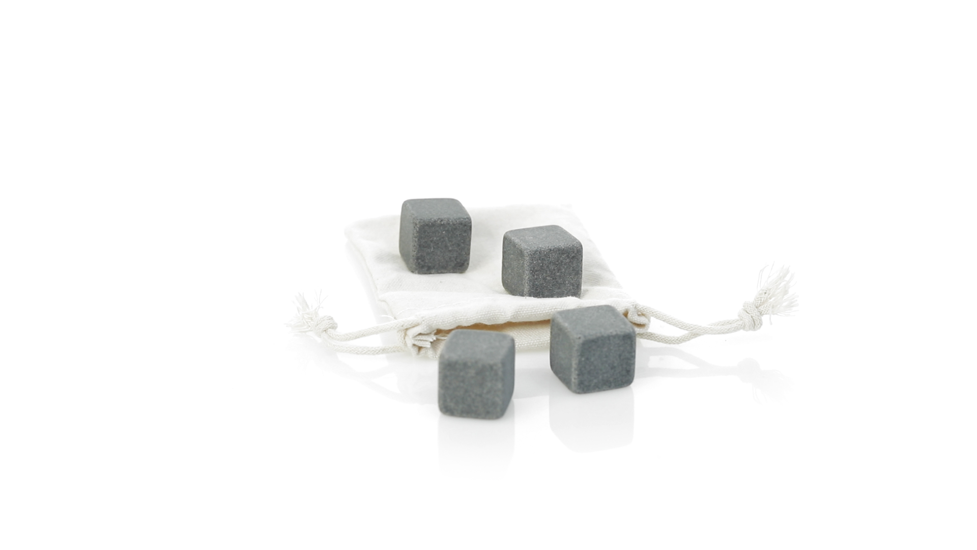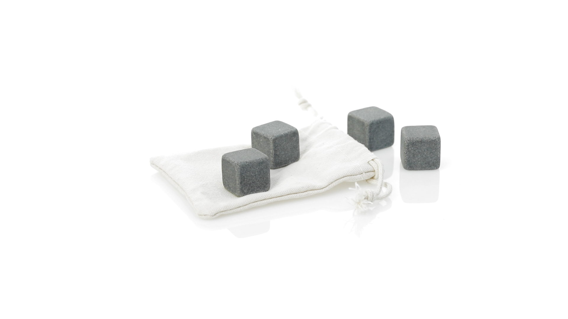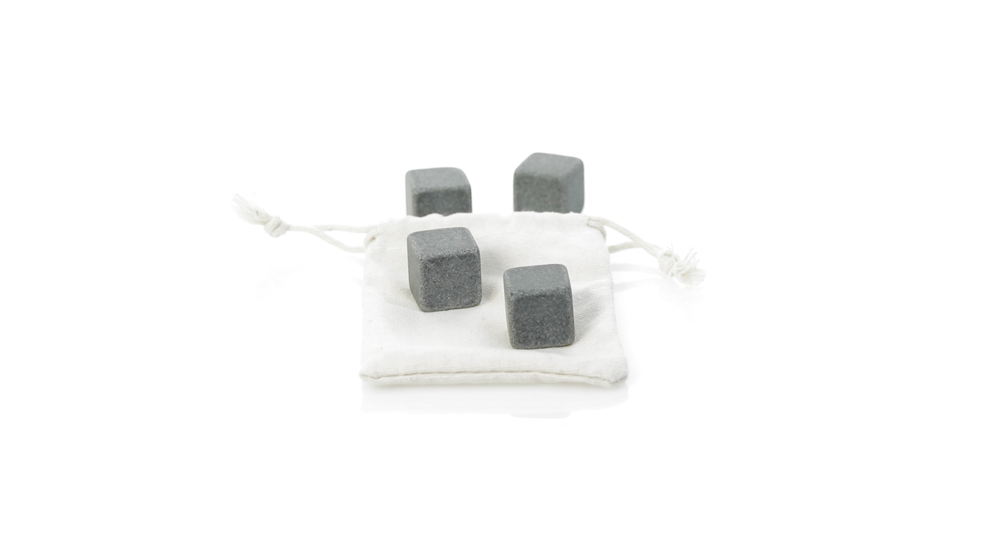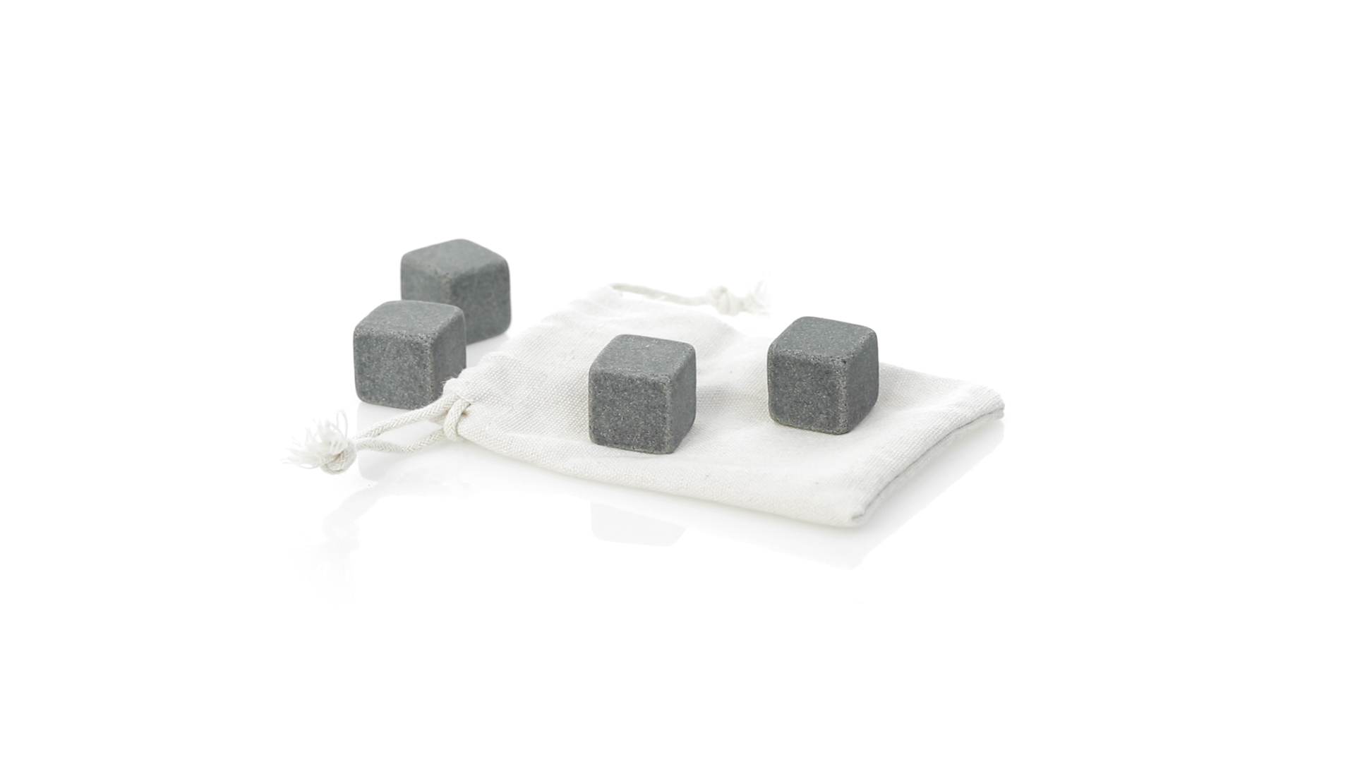 Set aus 4 wiederverwendbaren Eiswürfeln. Hergestellt aus natürlichem Speckstein, der das Getränk kalt hält, ohne seine Eigenschaften zu verändern, indem er seinen Inhalt nicht mit Wasser verdünnt und seinen ursprünglichen Geschmack beibehält. Präsentiert in einem Baumwollbeutel mit Schnurverschluss.