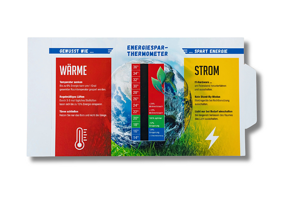 Mit dem Energiesparthermometer als Tischaufsteller machst Du Deine Werbung zu einem echten Mehrwert. Es ist ein cleverer Blickfang, der sowohl Deine Marke ins Gespräch bringt als auch den Kunden hilft, ihre Energiekosten zu senken. Hol Dir Deinen Tischaufsteller und bring Deine Werbung direkt auf den Schreibtisch Deiner Kunden!
