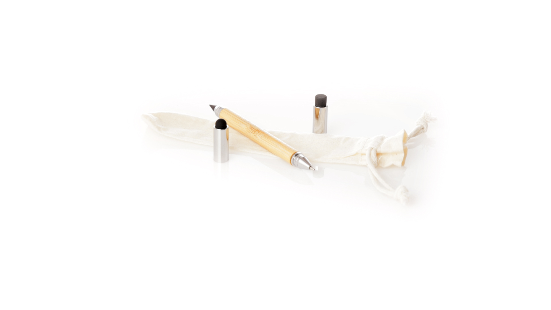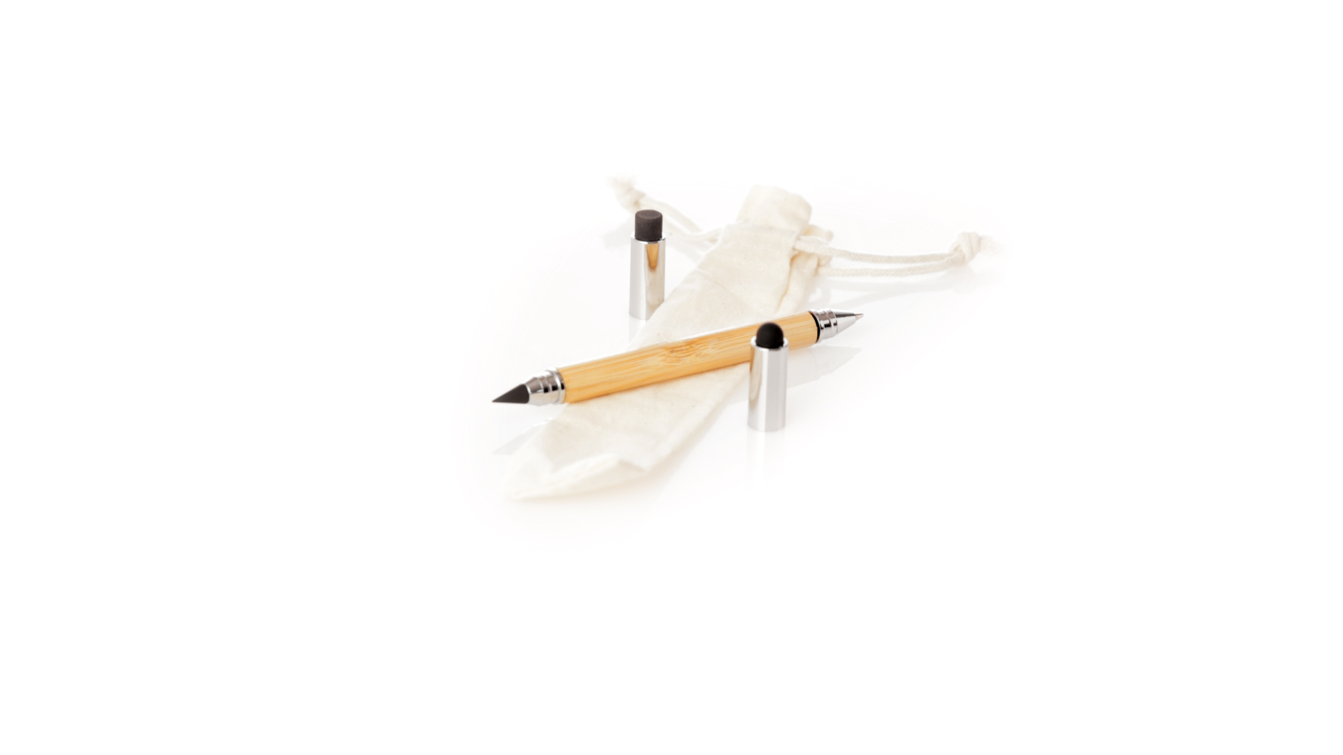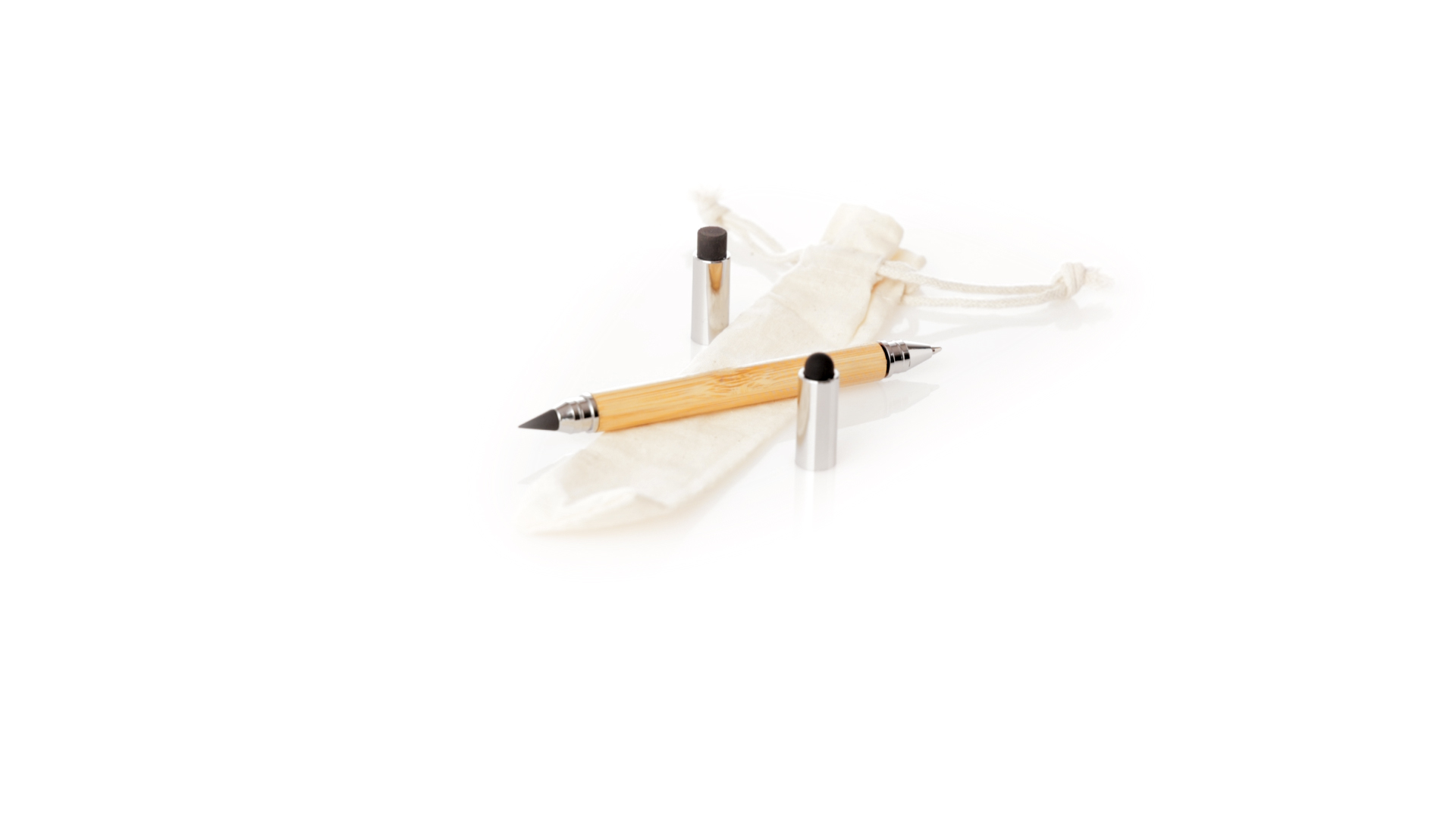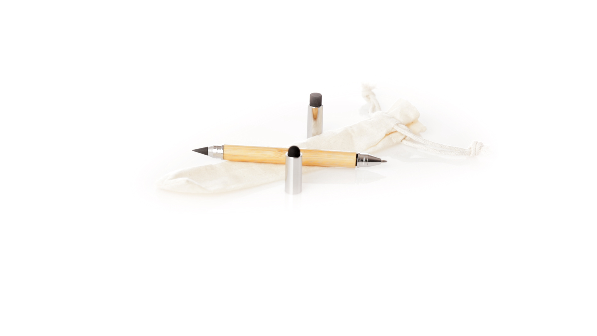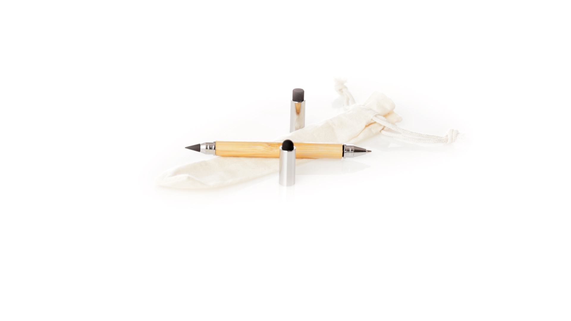 2-in-1-Dauerbleistift aus Bambus, mit glattem Schaft und verchromten Beschlägen. Mit Kapuzenverschluss, Radiergummi und Stift an beiden Enden, mit Kugelschreibern an einem Ende (Jumbo-Füllung und blaue Tinte) und ewigem Bleistift am anderen Ende, so dass Sie immer denselben Bleistift verwenden und keinen Abfall produzieren. Präsentiert in einem Etui aus Baumwolle mit Kordelzugverschluss.