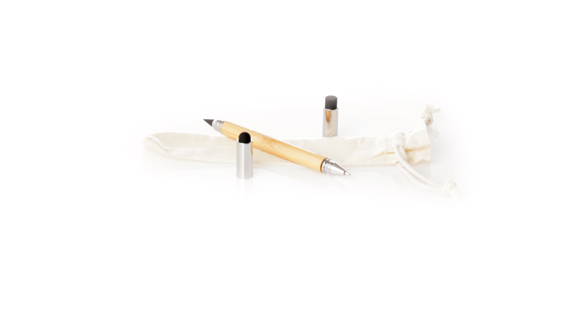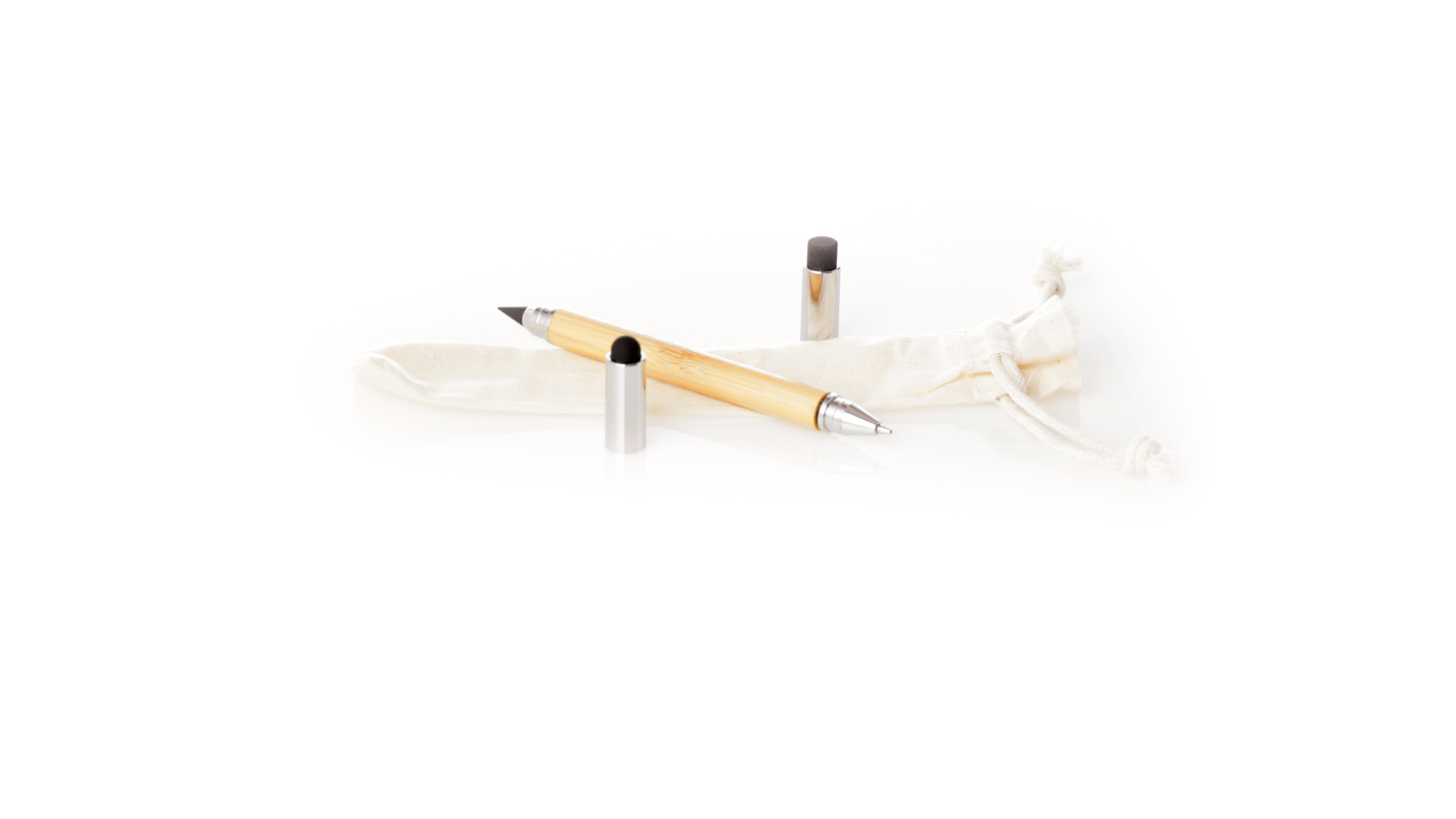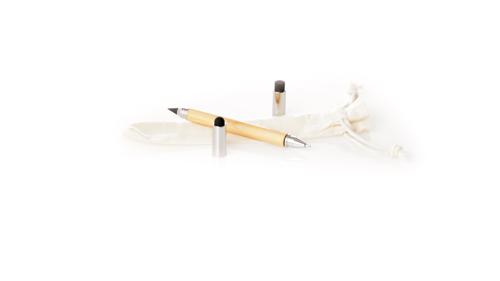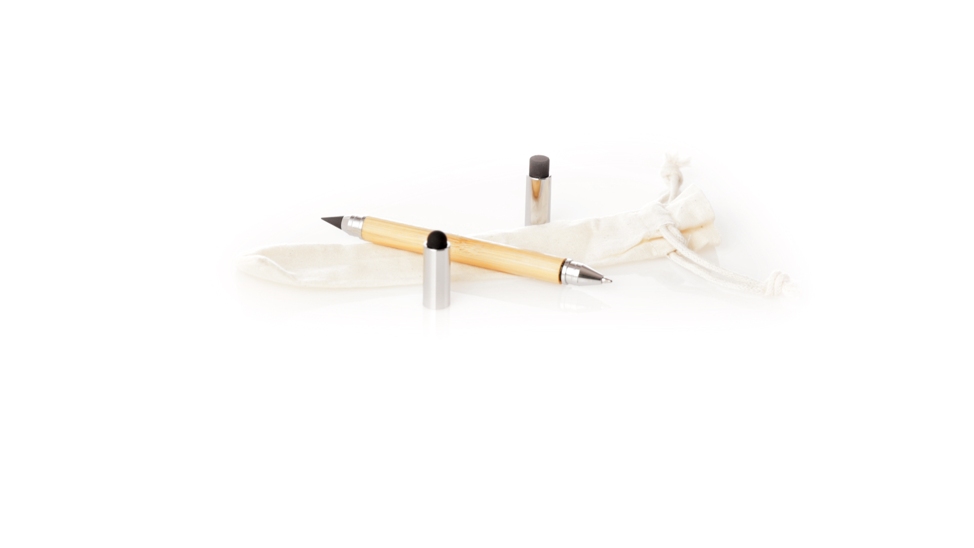 2-in-1-Dauerbleistift aus Bambus, mit glattem Schaft und verchromten Beschlägen. Mit Kapuzenverschluss, Radiergummi und Stift an beiden Enden, mit Kugelschreibern an einem Ende (Jumbo-Füllung und blaue Tinte) und ewigem Bleistift am anderen Ende, so dass Sie immer denselben Bleistift verwenden und keinen Abfall produzieren. Präsentiert in einem Etui aus Baumwolle mit Kordelzugverschluss.