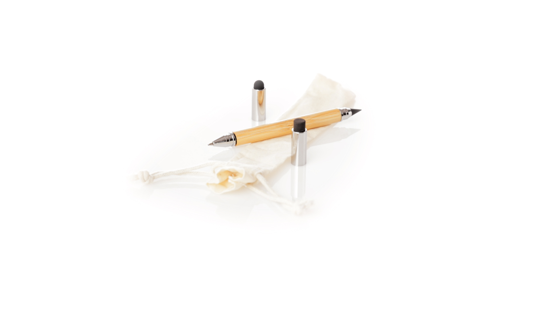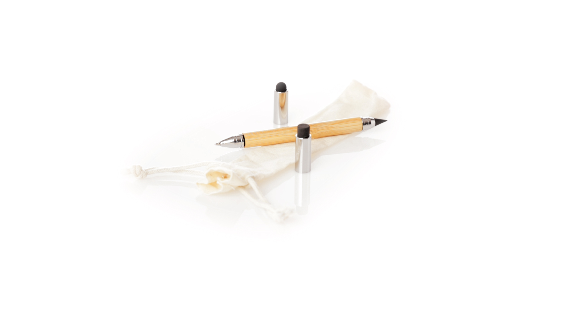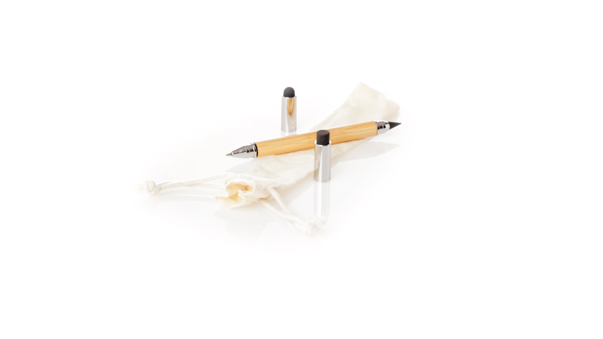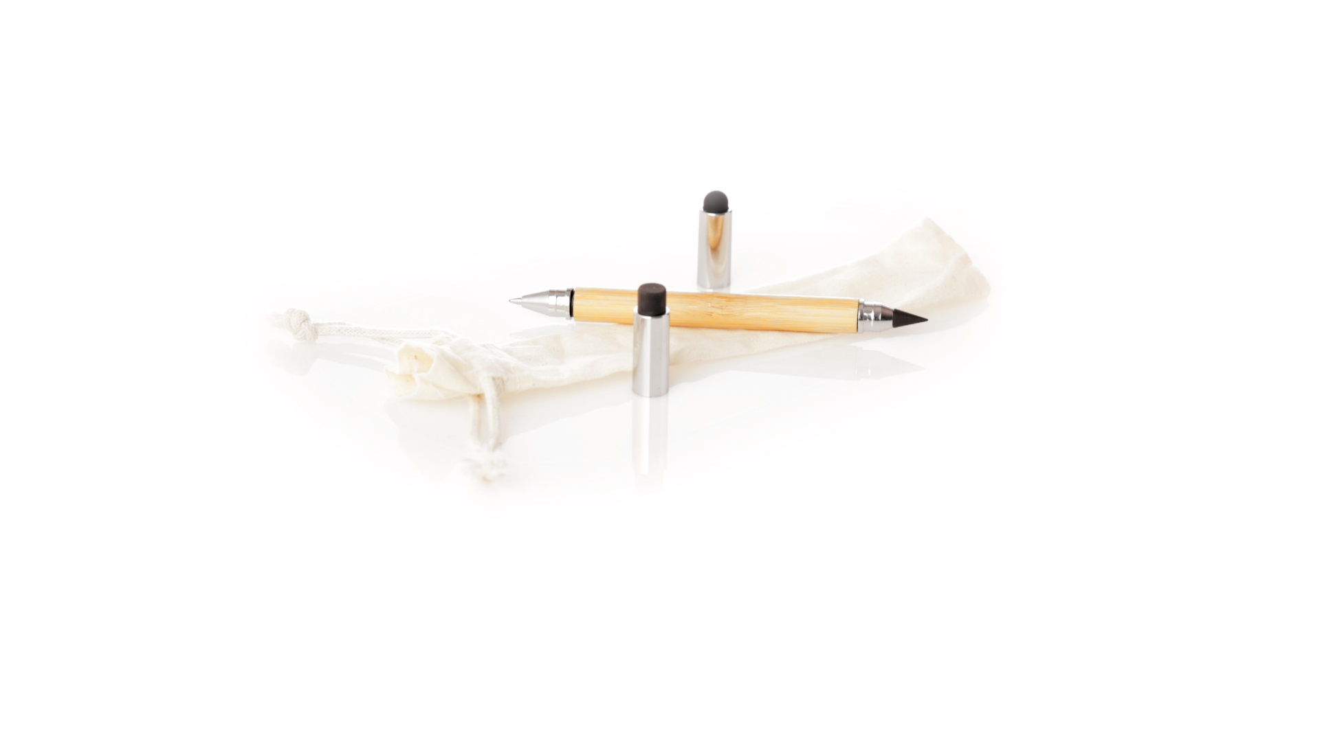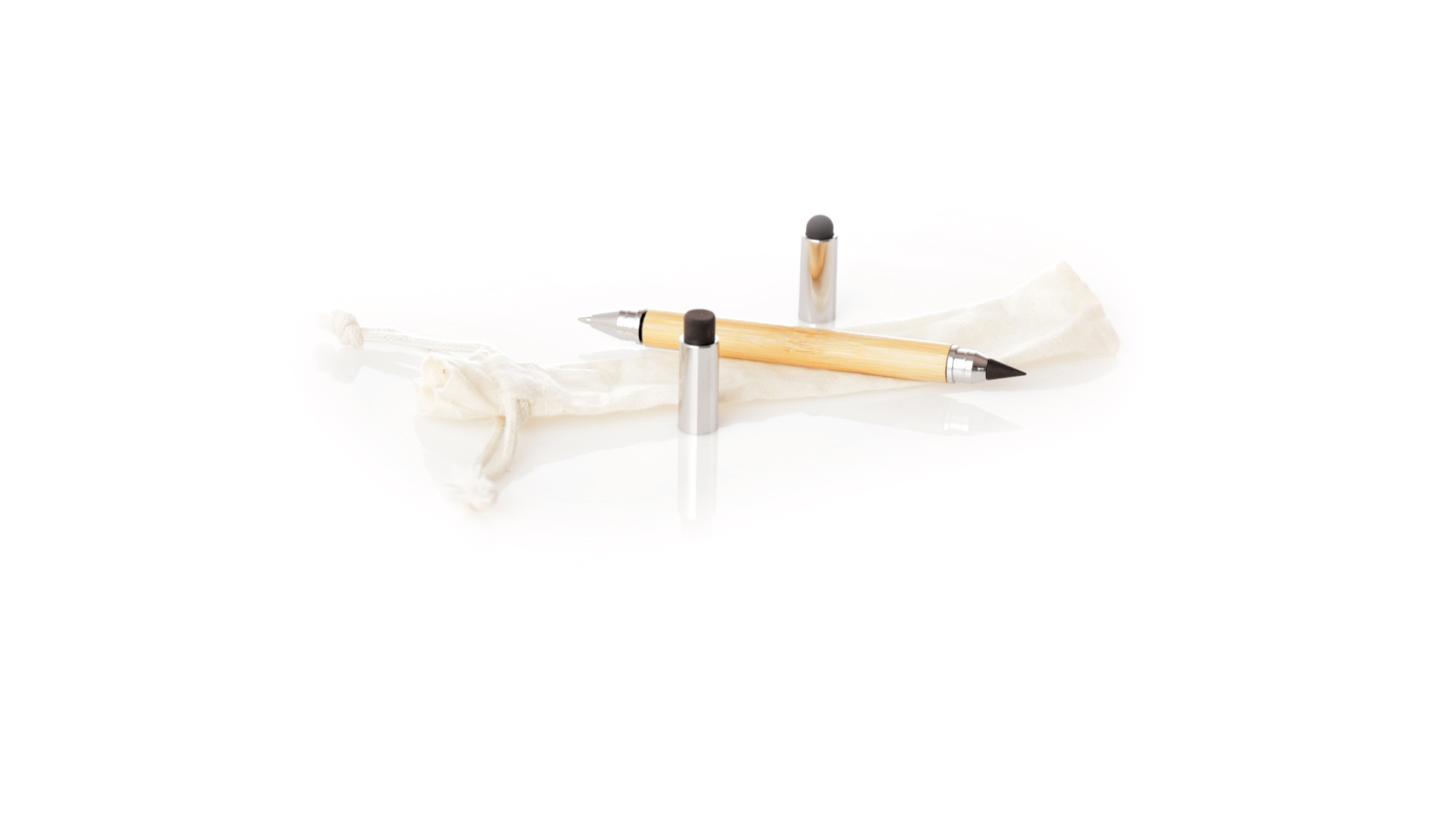 2-in-1-Dauerbleistift aus Bambus, mit glattem Schaft und verchromten Beschlägen. Mit Kapuzenverschluss, Radiergummi und Stift an beiden Enden, mit Kugelschreibern an einem Ende (Jumbo-Füllung und blaue Tinte) und ewigem Bleistift am anderen Ende, so dass Sie immer denselben Bleistift verwenden und keinen Abfall produzieren. Präsentiert in einem Etui aus Baumwolle mit Kordelzugverschluss.