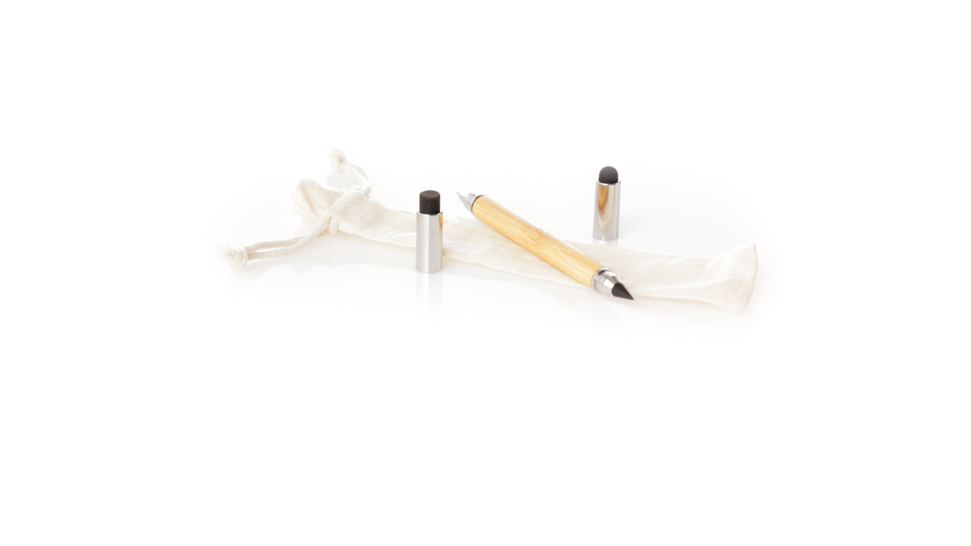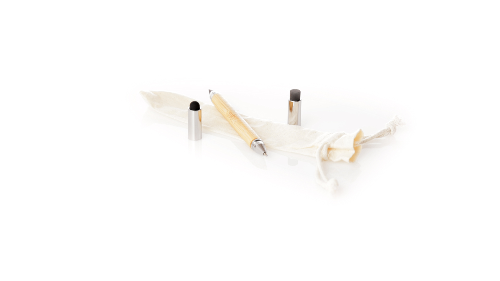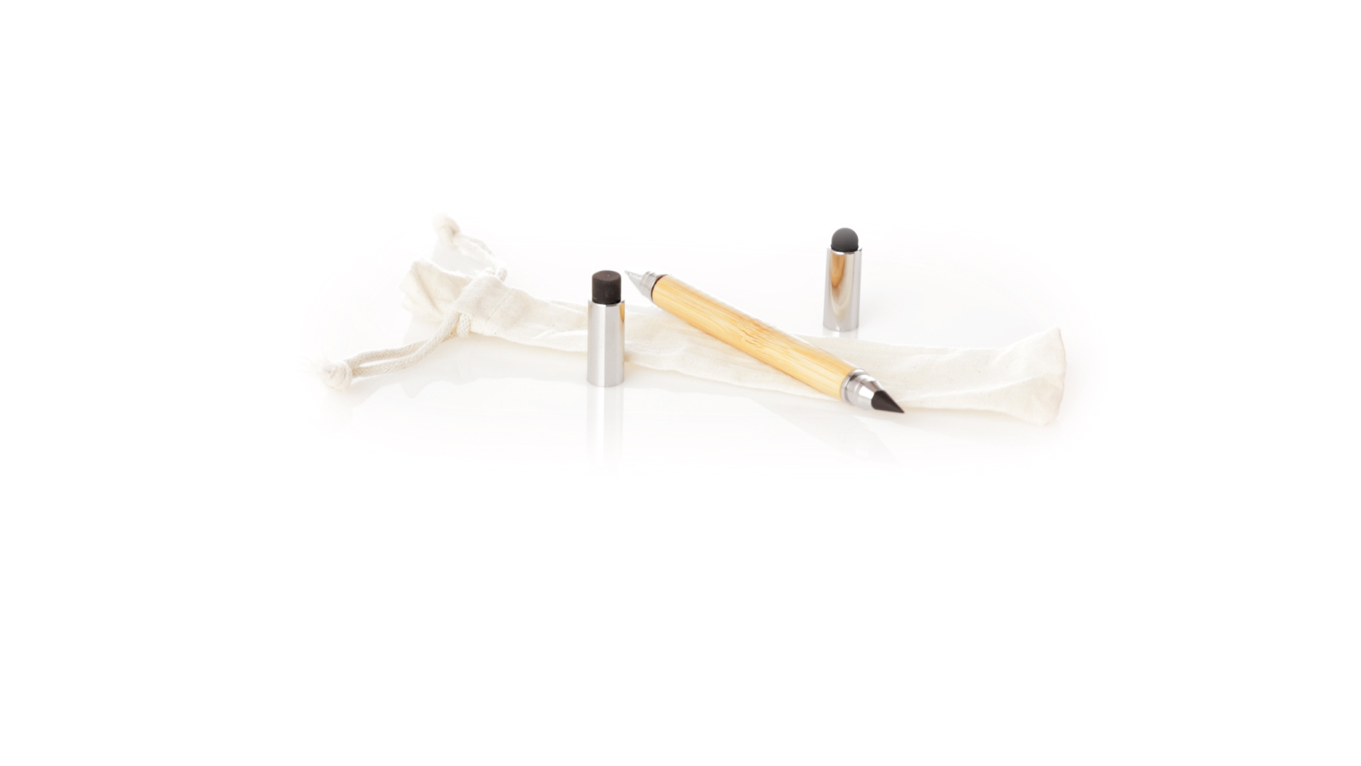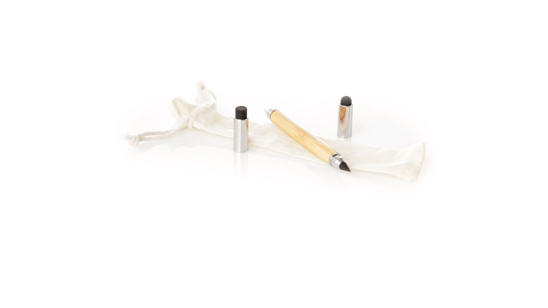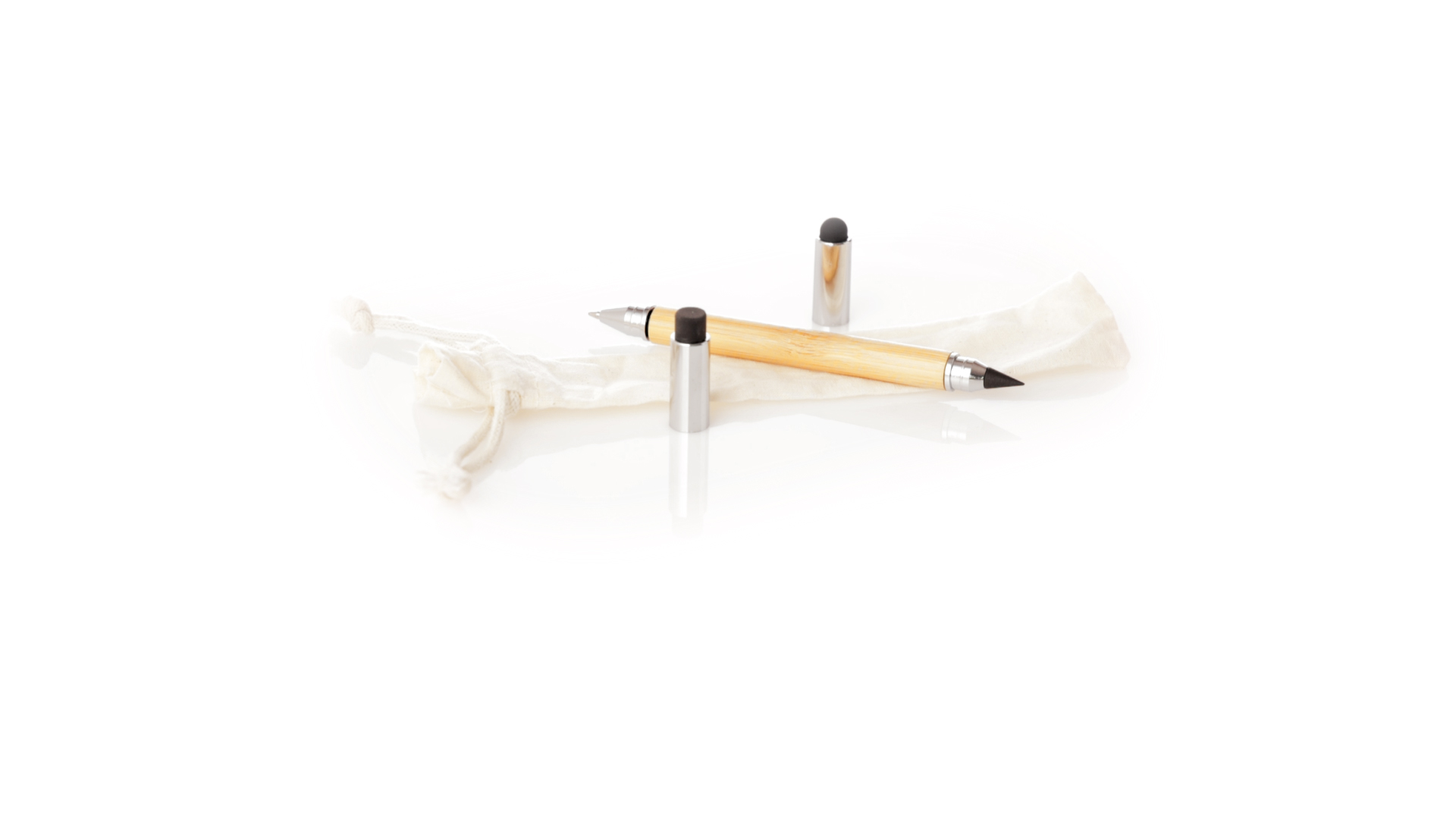 2-in-1-Dauerbleistift aus Bambus, mit glattem Schaft und verchromten Beschlägen. Mit Kapuzenverschluss, Radiergummi und Stift an beiden Enden, mit Kugelschreibern an einem Ende (Jumbo-Füllung und blaue Tinte) und ewigem Bleistift am anderen Ende, so dass Sie immer denselben Bleistift verwenden und keinen Abfall produzieren. Präsentiert in einem Etui aus Baumwolle mit Kordelzugverschluss.