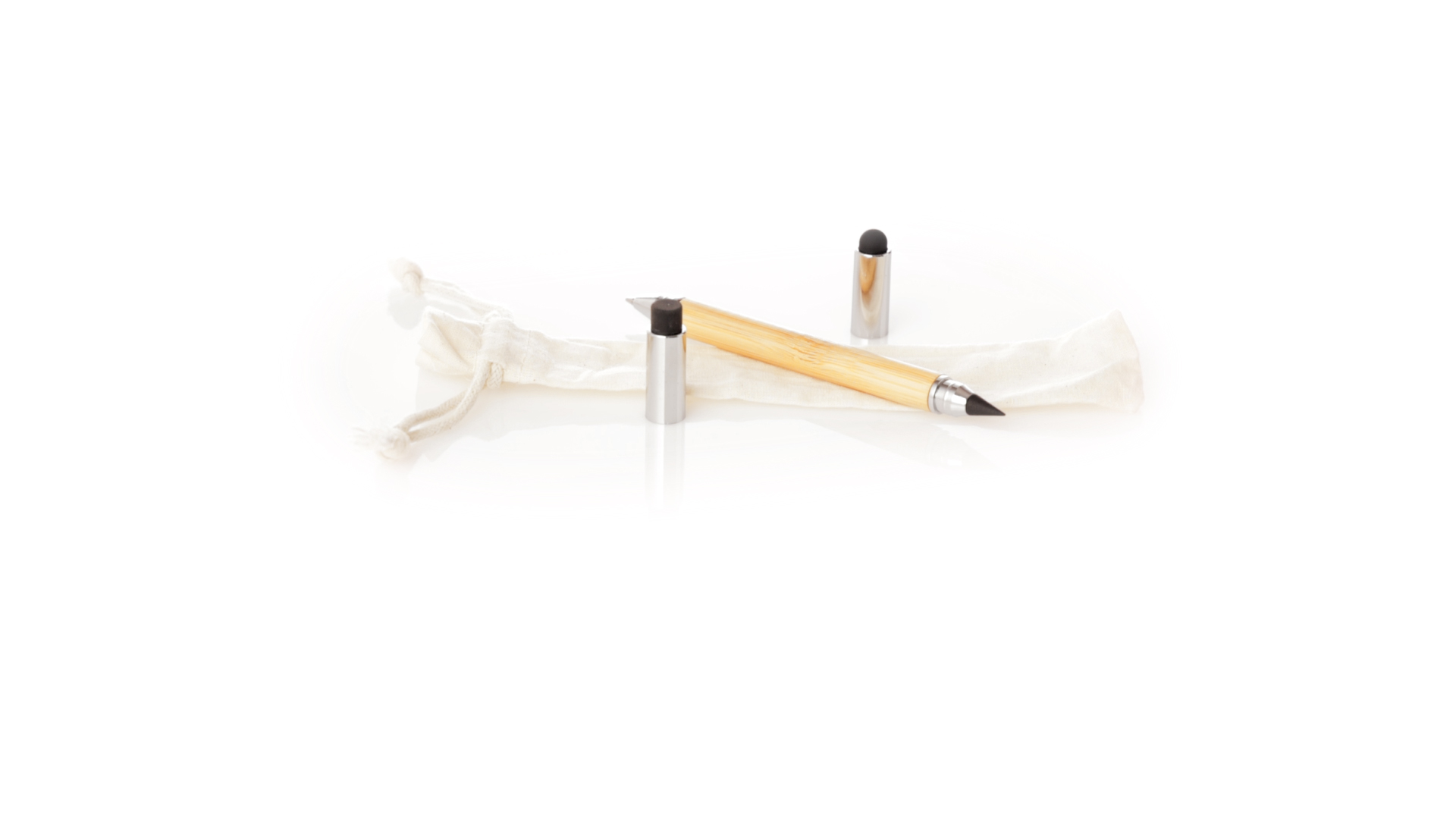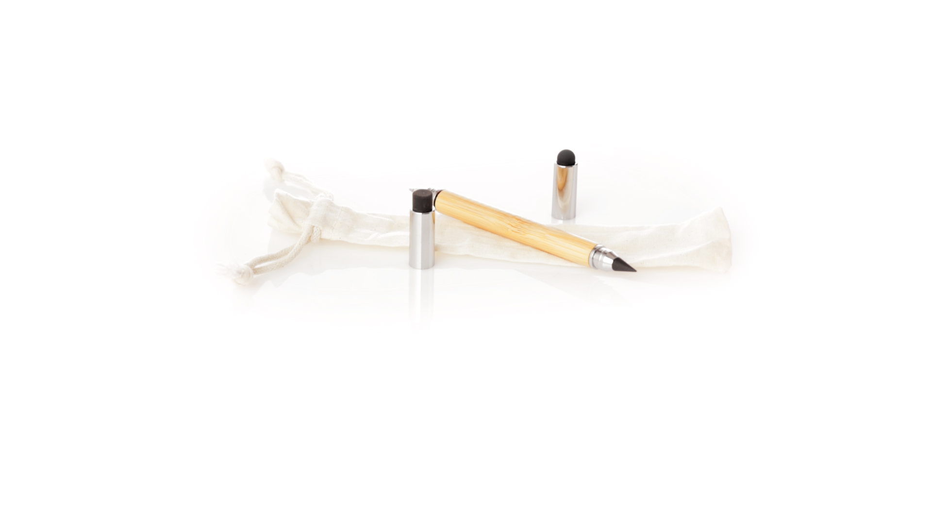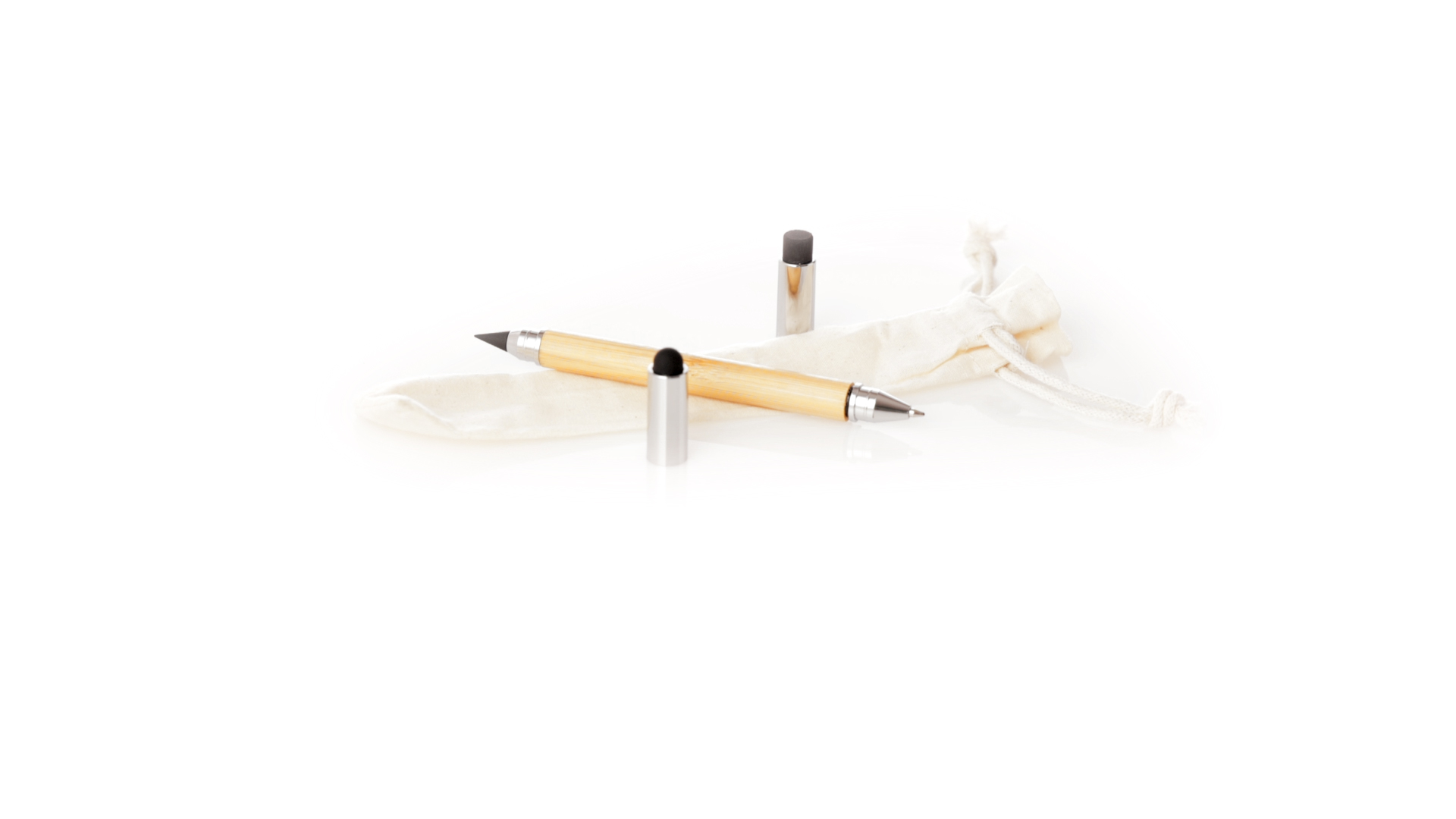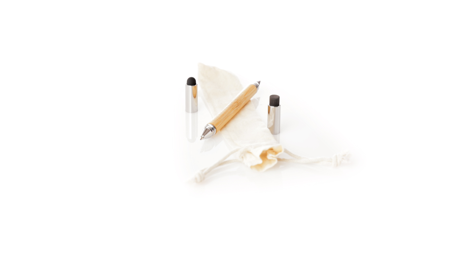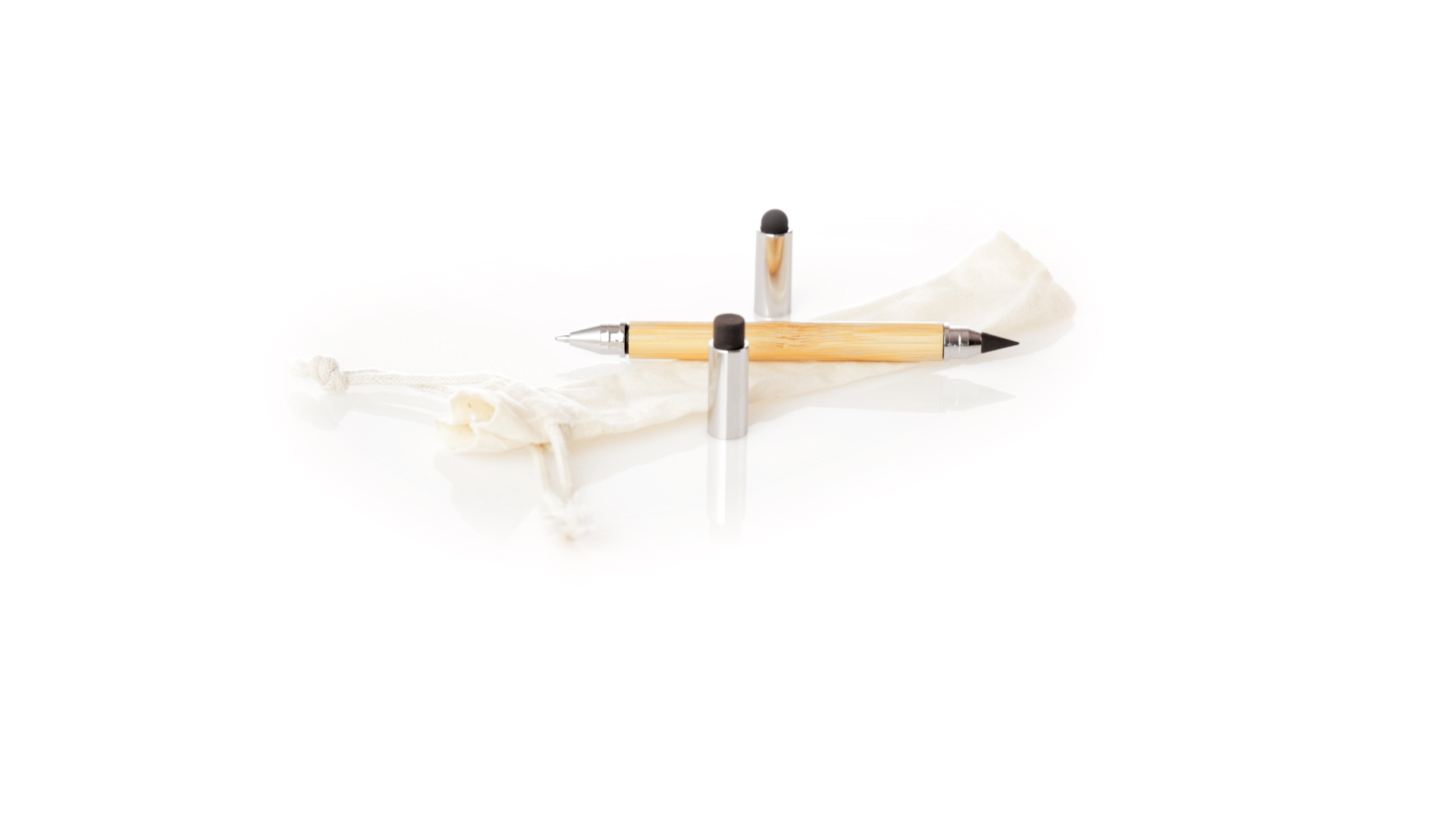 2-in-1-Dauerbleistift aus Bambus, mit glattem Schaft und verchromten Beschlägen. Mit Kapuzenverschluss, Radiergummi und Stift an beiden Enden, mit Kugelschreibern an einem Ende (Jumbo-Füllung und blaue Tinte) und ewigem Bleistift am anderen Ende, so dass Sie immer denselben Bleistift verwenden und keinen Abfall produzieren. Präsentiert in einem Etui aus Baumwolle mit Kordelzugverschluss.